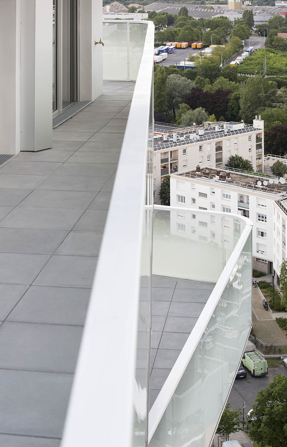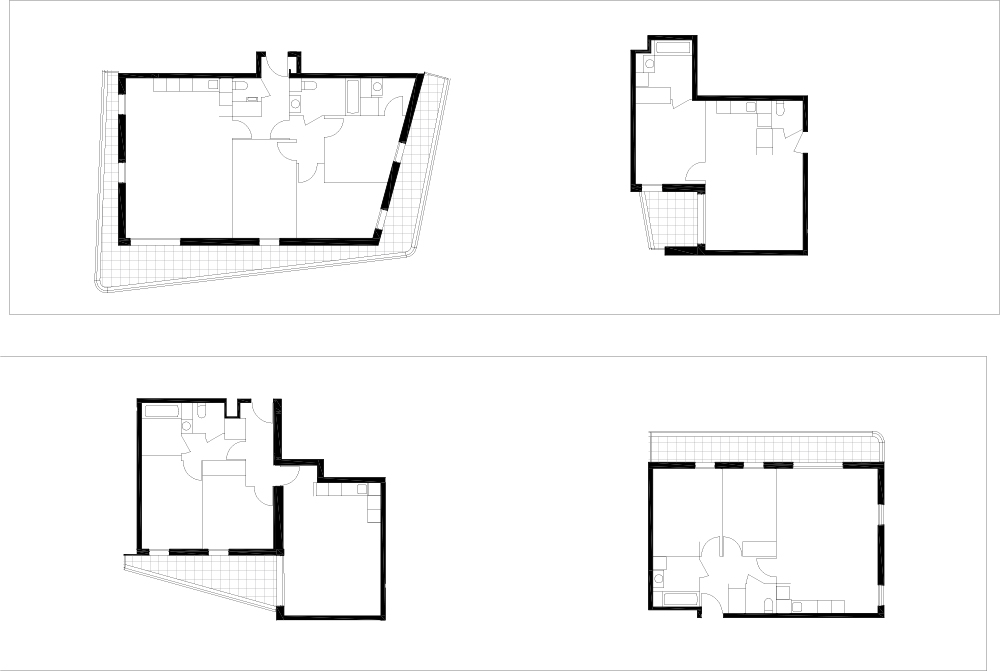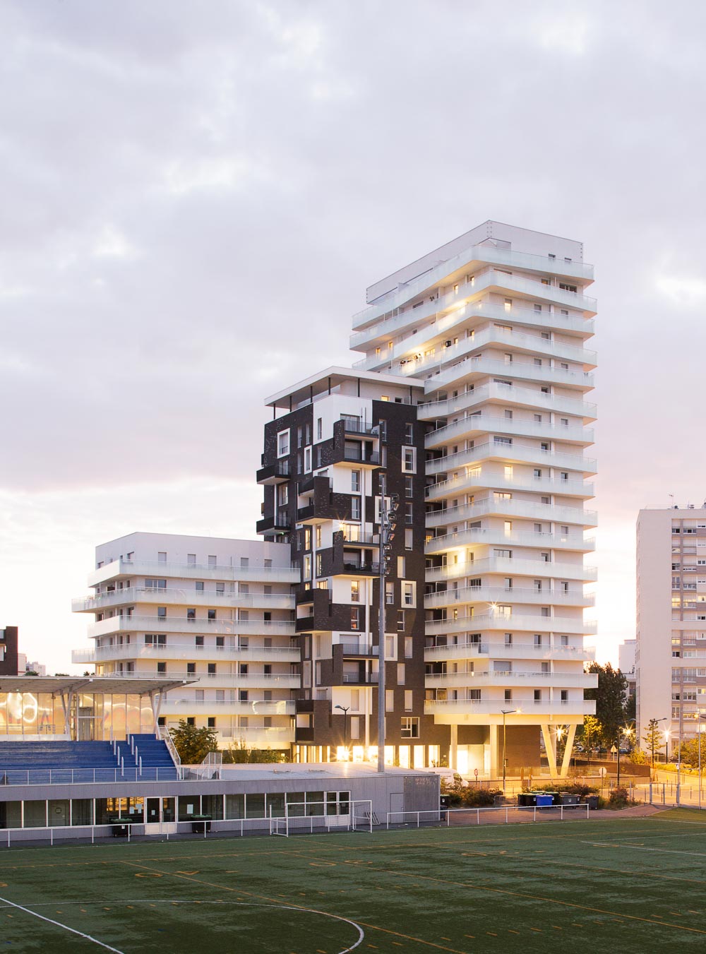 - 건물 C/D에는 129세대가 거주한다. 높이가 각기 다른데, 서로 미끄러지는 듯한 3개의 다른 높이와 재료로 나뉘며 2개의 독립적인 수직 동선에 의해 분리된다. 낮은 볼륨(R+7)은 가벼운 석고로 올라와 있고, 높은 볼륨(R+18),은 가벼운 회반죽으로 이 또한 올라와서 두 개의 다른 볼륨들을 마주하고 있으며, 중간 볼륨(R+12)은 어두운 벽돌로 이루어져 있다.