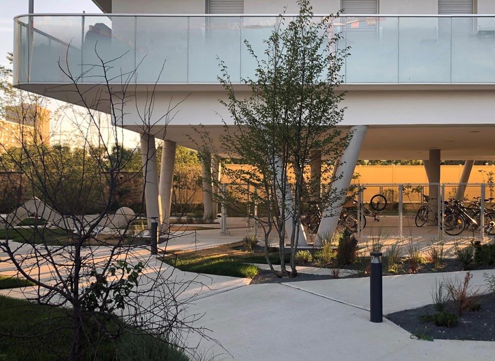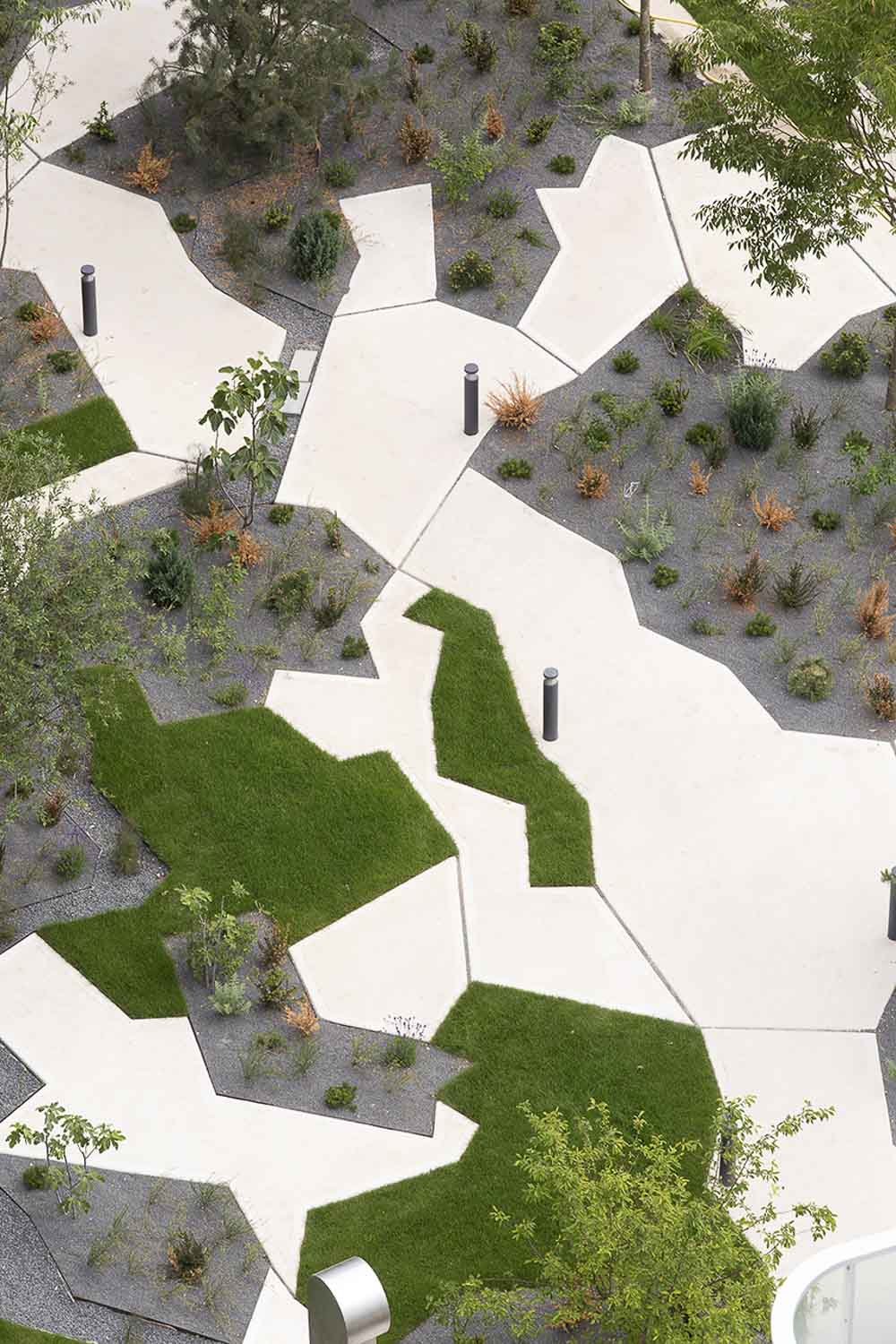 언덕과 기둥에 달린 캔틸레버와 같은 건축 디자인은 블록의 식생에 흥미로운 기술적 기회를 제공한다. 이 접근방식은 일관성의 분명한 요소이다. 그것은 건축물과 농장 사이의 긴밀한 관계를 허용한다. 전체 구획은 매우 식물적인 개체로써 인식될 수 있다. 조경 디자이너가 직면한 문제는 빛, 전망, 사용자 및 물의 순환을 고려하면서 식물에 최대한의 존재감을 부여했다. 이 공원은 이상적으로 노출되어 있으며 구역 중앙에 이웃을 위한 환영하는 공공 공간의 가능성을 제공한다. 녹색지붕은 소규모 낙농업을 위한 장소이다.