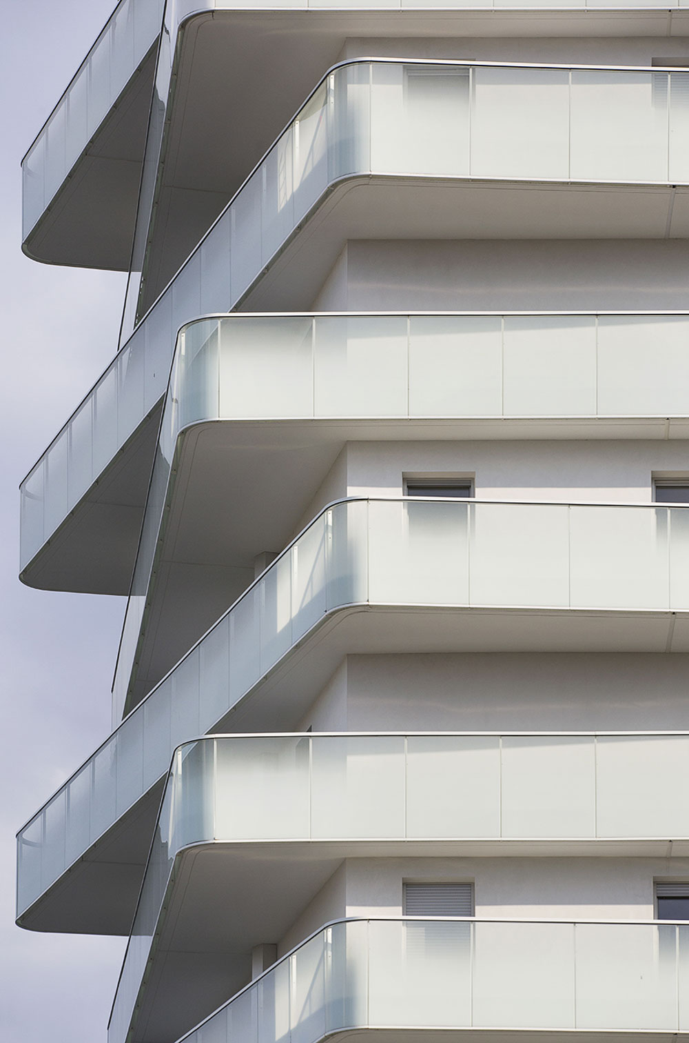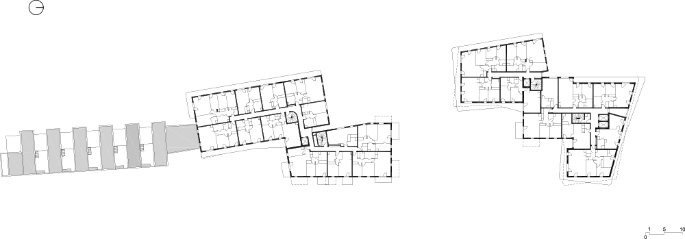 - 건물 B에는 65세대가 거주하는 아파트가 있다. 높이와 재료가 다른 2개의 볼륨으로 나뉜다. 옅은 회반죽 칠의 낮은 볼륨(R+4)과 어두운 벽돌의 높은 볼륨(R+6)이 있다.