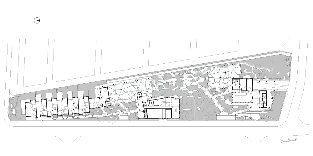 - 건물 A는 7개의 단독 주택 유형으로 계획됐다. 이 주택은 1층의 서쪽과 남쪽을 향한 넓은 정원과 위층의 접근 가능하며 식재된 테라스의 이점을 누릴 수 있다.