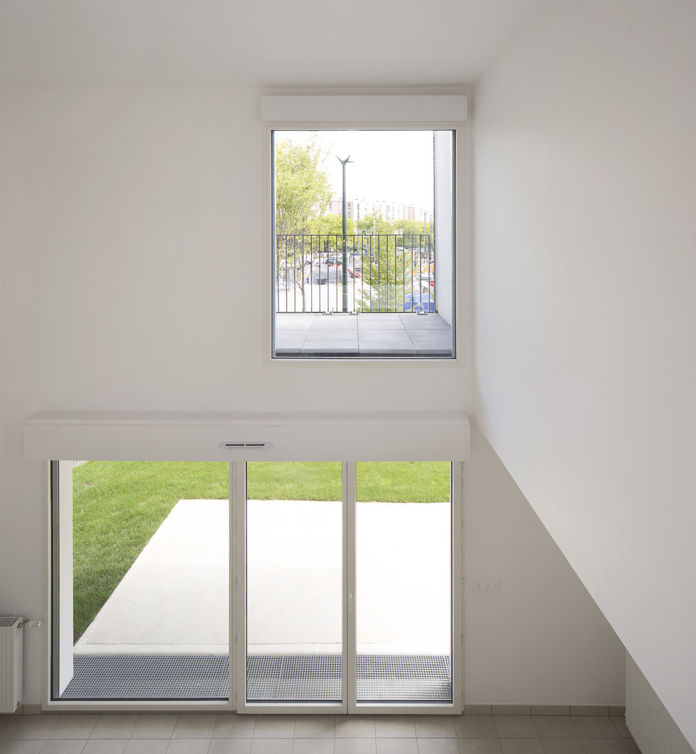 - Building B houses 65 apartments. It is divided into 2 volumes of different heights and materials: a low volume (R+4), in light rendering, raised and a high volume (R+6), in dark brick, laid.