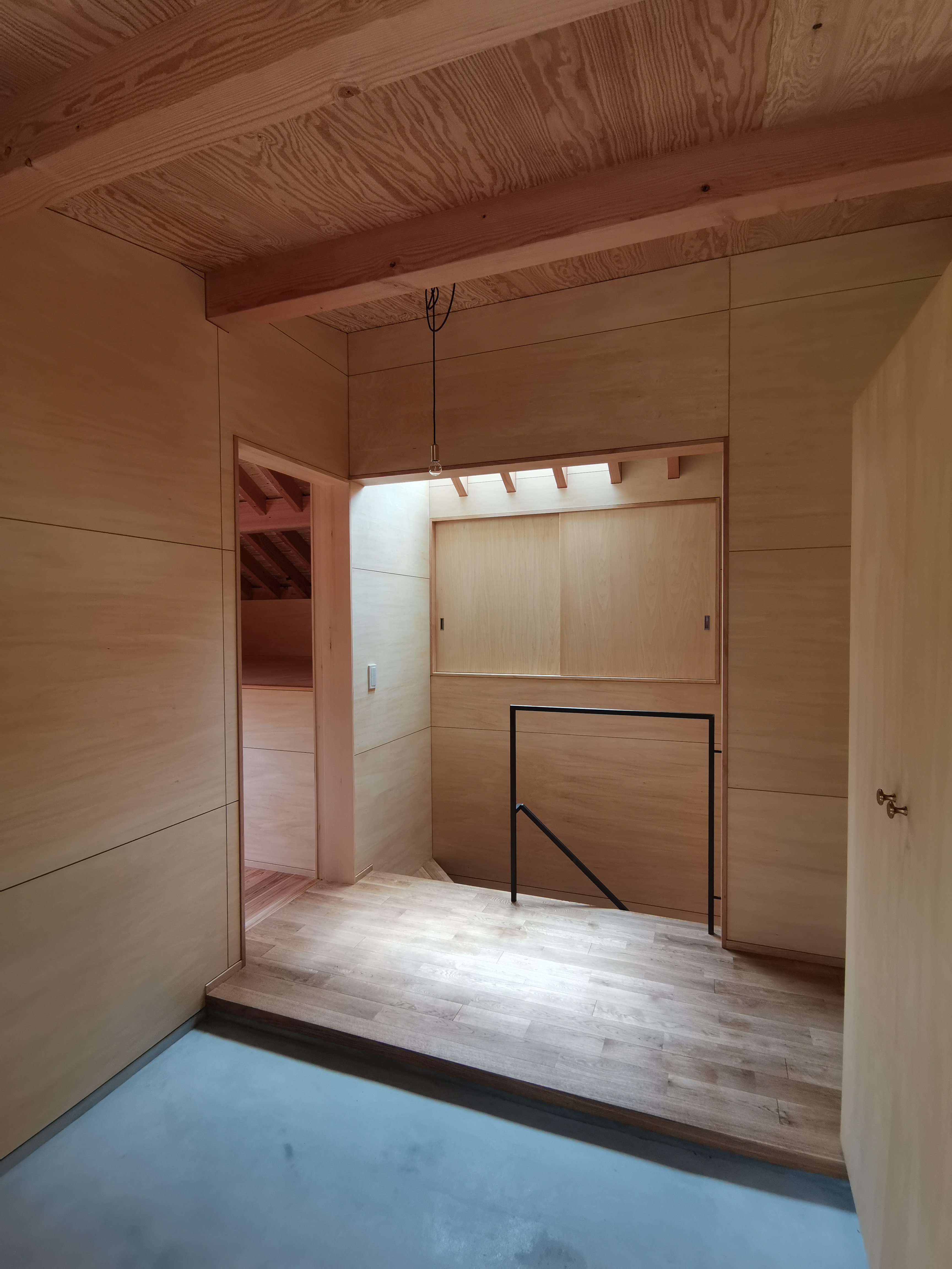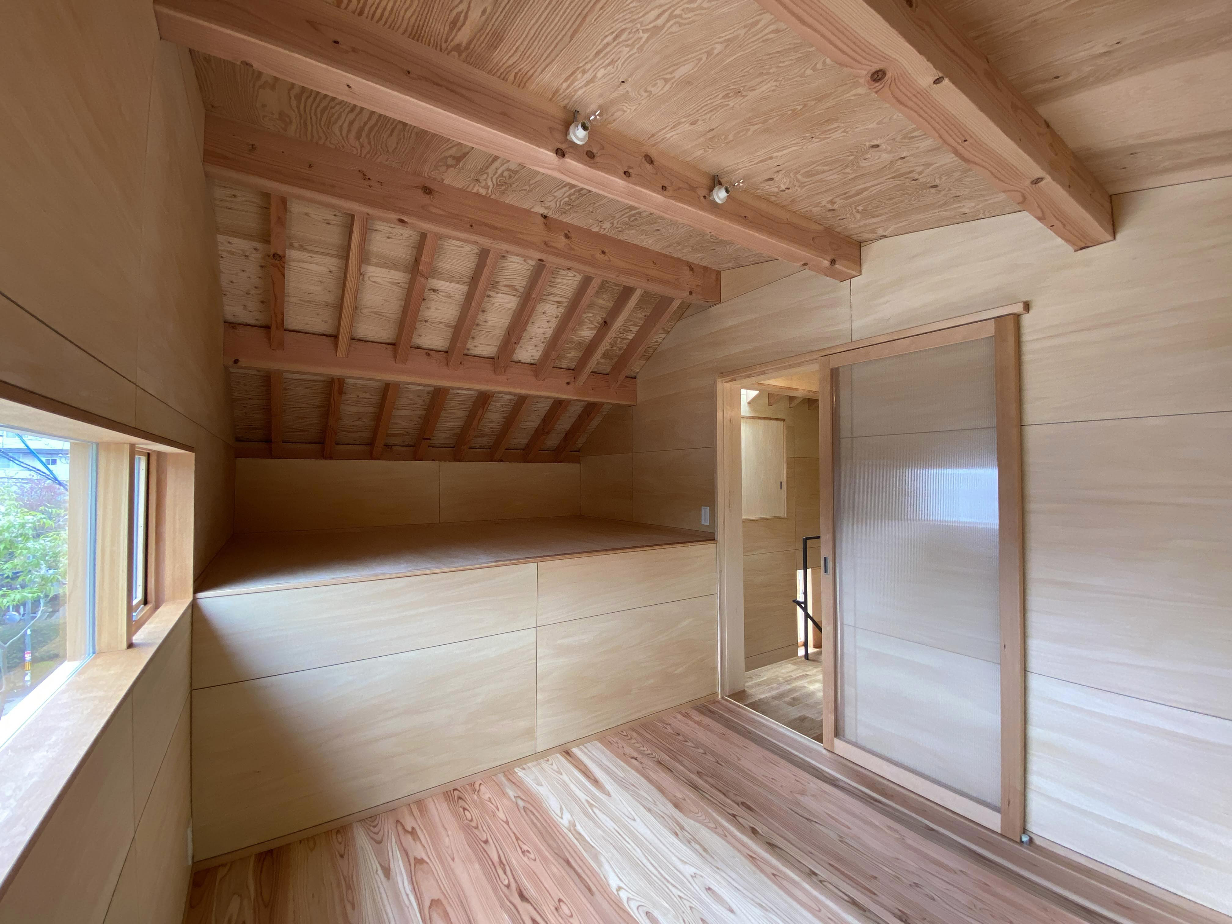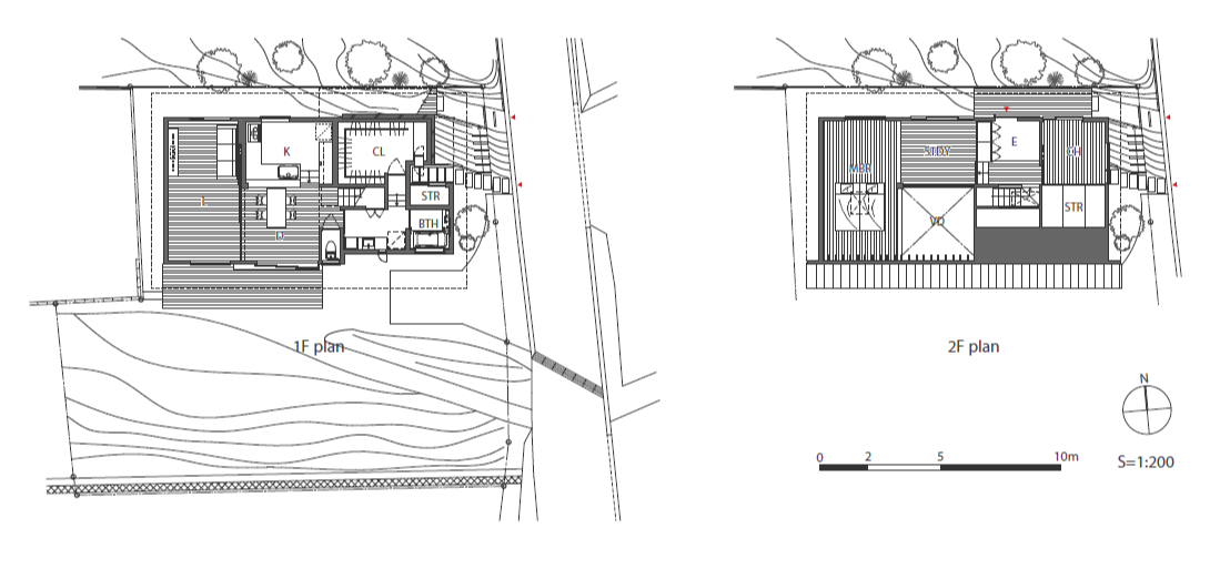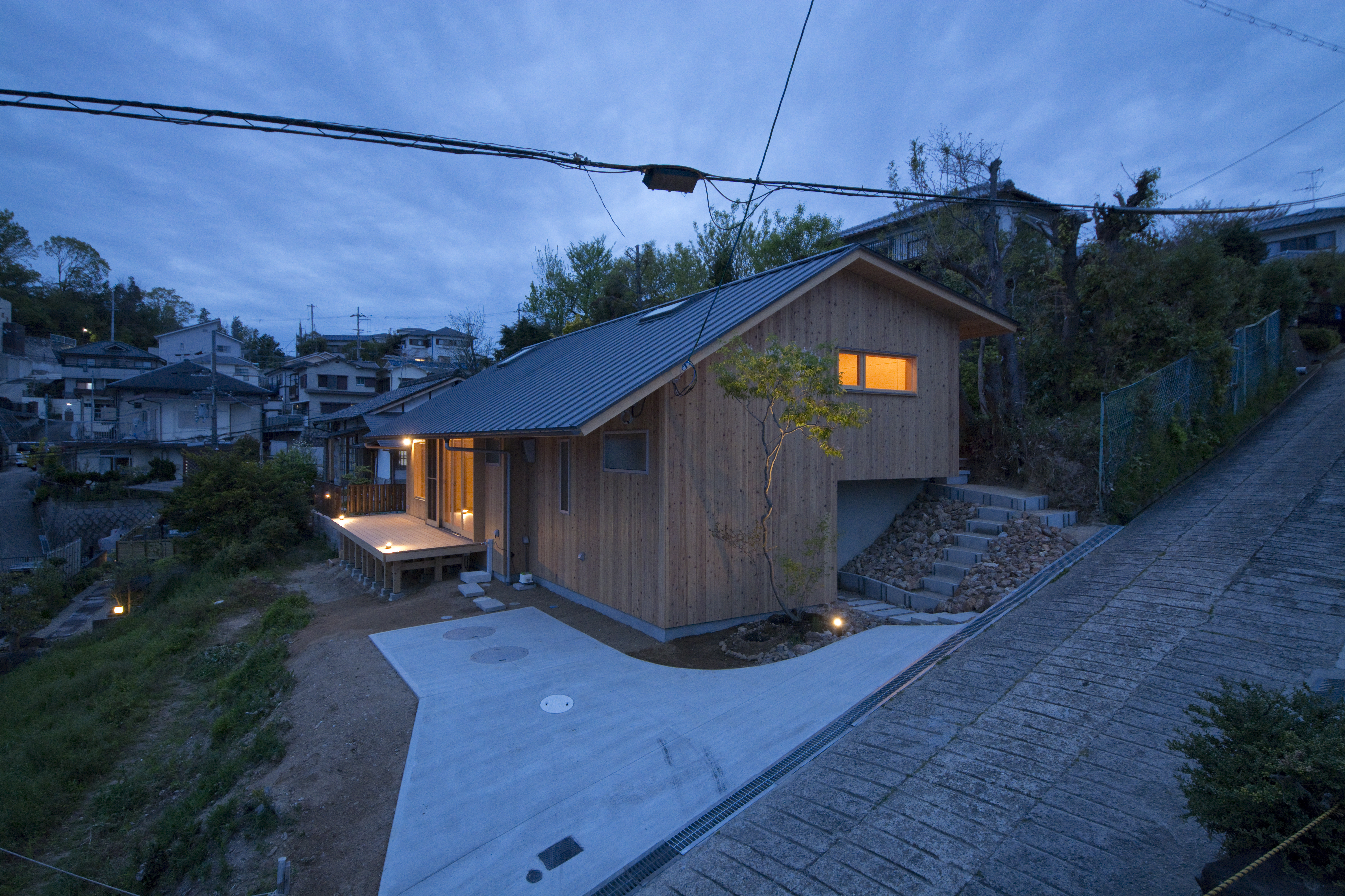 Higashi-ikoma where surrounded by the ikoma-mountain and the Yada-hills still left some nature. On the other hand Higashi-ikoma is high-end residential as same as Gakuen- Toshi since it has been developed as estate by Kintetsu. The planned land in Higashi-ikoma is located middle of a small hill which could avoid large-scale development on the North of the ikoma line. After the architects drive up narrow road the land will appear in front of you. The land has two faces the both South area and North area, the most of South are is sloping land, and North area has a tiny flatland and there is an old one-story house. Additionally North of the land is peaceful green area. The land seems like an untouchable area, but they consider that we could use this area as “characteristic of abandoned place”. The client who loves outdoor requests are “one –story house with wood-deck and the loft space is planned as a bedroom”. However, the land is not wide enough to plan one-story house, if we planned one-story house in the land the plan will be same volume as two-stories house. To solve it the architects start planning with adjusting floor level of each rooms based the loft which is the bedroom. When you sit on the stairwell from the study 2nd floor you can see sloping land on South, and if you look back North side, the peaceful green is spread, by that you would feel “you are nestling on the hill”. And once, you open the windows in the study and the dining comfortable breeze will blow through the house, also you can hear song of neighbor birds and cat chatting from the north. The house has been the connection of “the abandoned place” and “The nestling space on the hill”.