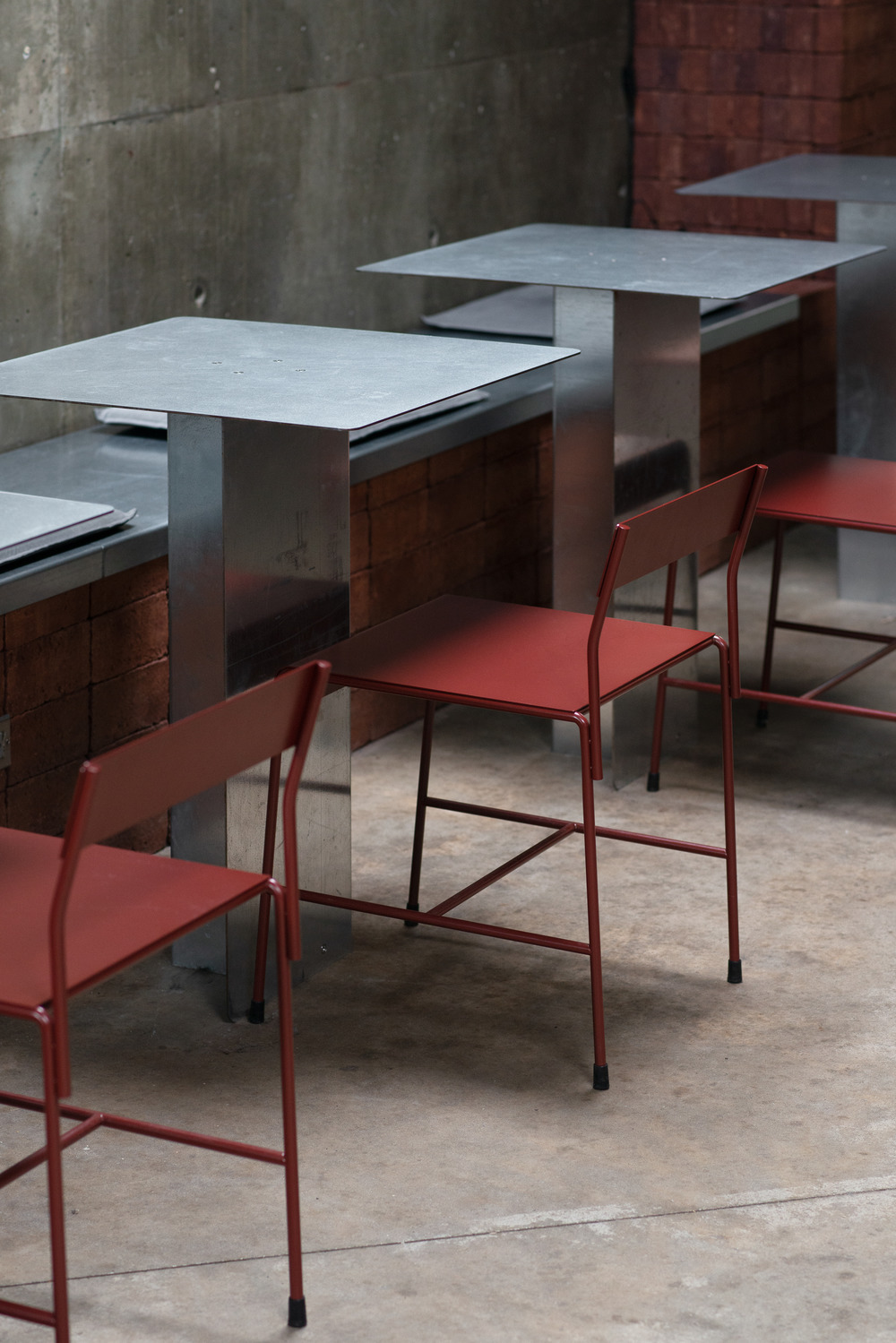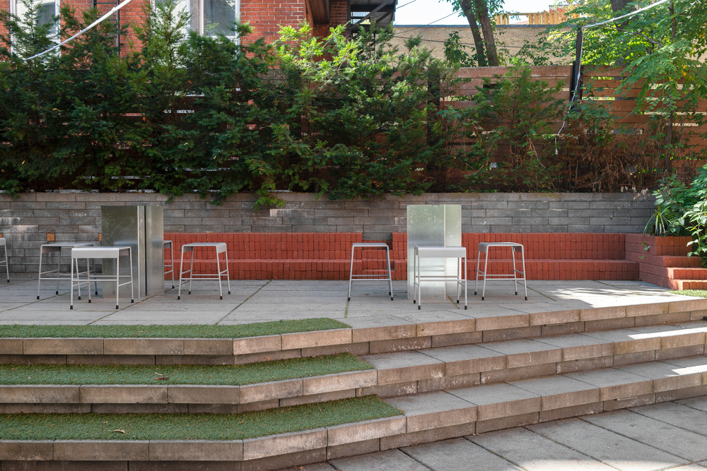 The reflective quality of galvanized steel, used for most surfaces, tables, counters and fixtures, brings the space to life throughout the day and from season to season. Over time this raw, responsive material will change under the surrounding environment and develop a patina to give it a slightly more matte look. The chairs, which were custom designed for the space, are finished in a sandstone red powder coat to create a link to the bricks in the foundation and bench. The existing base of the service counter, which was retained to avoid wasting material, is overlaid with polycarbonate and dimmable LED strips. In order to imbue the semi-basement café with a sense of grandeur, the ambience and furniture were designed to keep the focal point low, leaving the large concrete ceiling, with its three skylights, unobstructed.