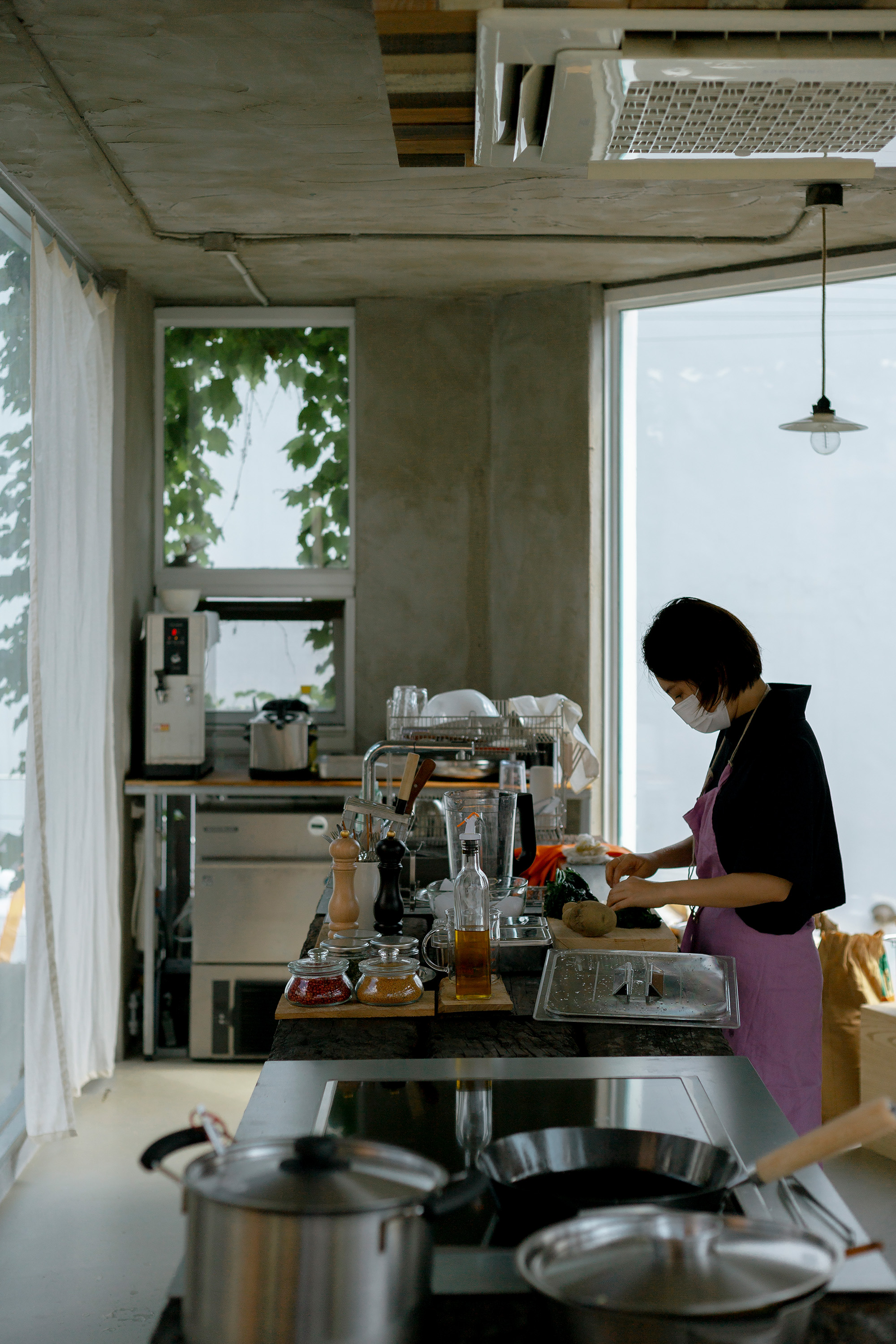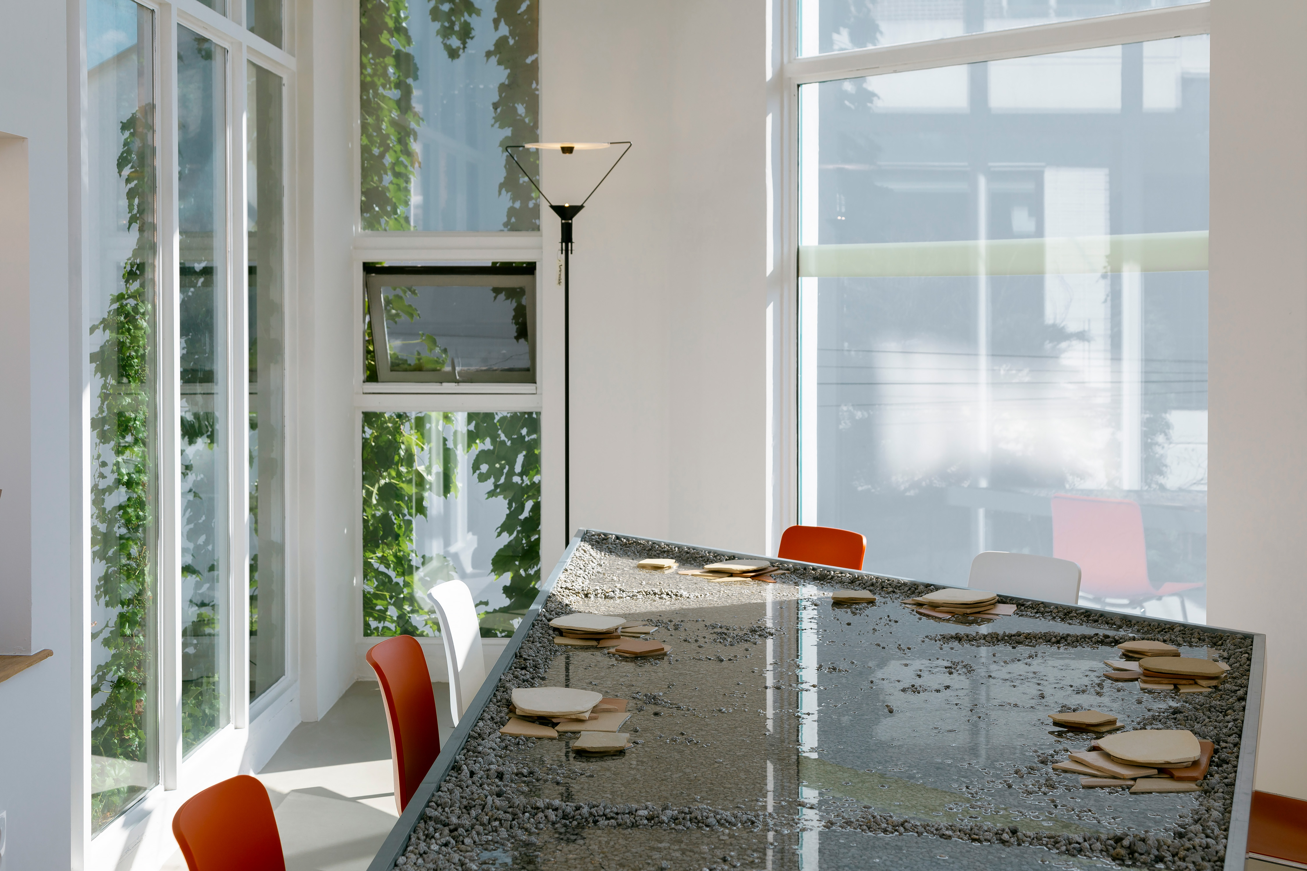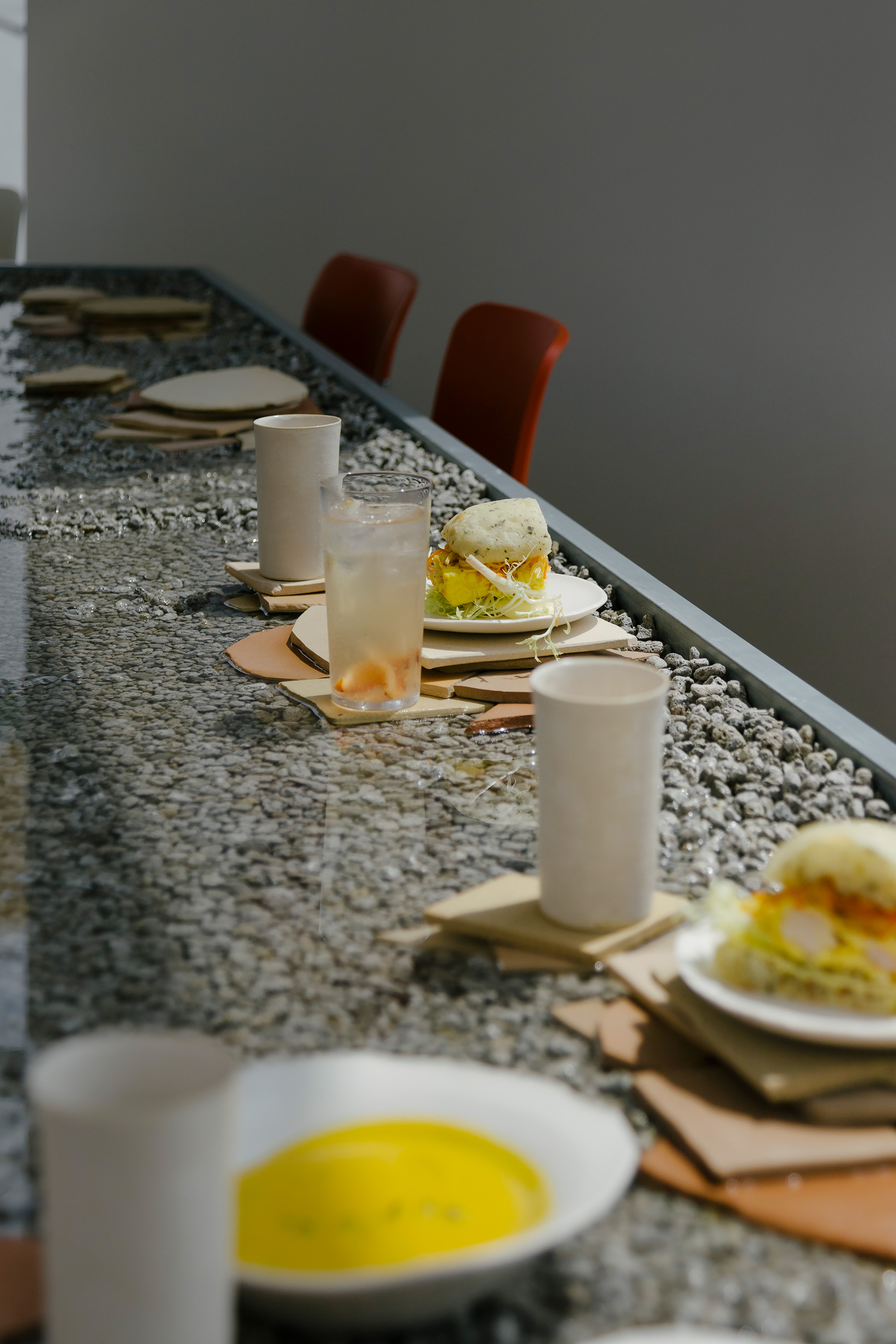 건축주는 디자인 콘셉트 미팅 때부터 물을 사용하길 원했고, 오랜 협의 끝에 물이 담긴 테이블을 디자인하게 되었다. 물이 담긴 테이블은 마치 수면 위에서 식사를 하는 것 같은 착각을 불러일으킨다. 하지만 건축주는 무엇보다 이곳에서 식사하는 사람들이 짧은 시간이지만 물에 비친 하늘과 나 자신을 바라보며 낭만적인 사색을 즐길 수 있길 바랬다. 때문에 2층은 온전히 다이닝룸으로 쓰일 수 있도록 계획했고, 1층에는 주방을 배치했다.