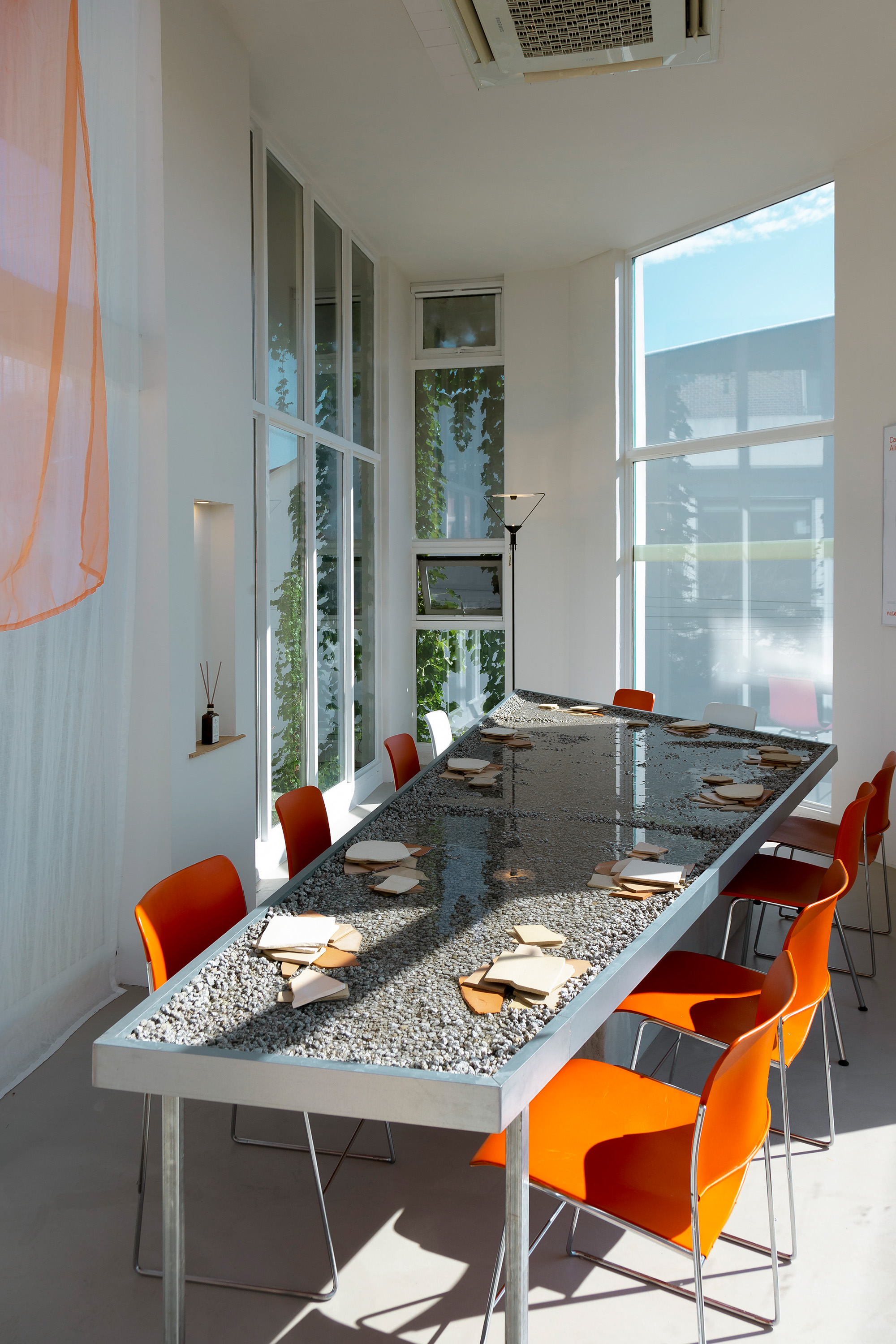 As for the design of the second floor, the sense of openness given by the high ceiling and open windows was maximized, and white was chosen to further emphasize the table filled with water. Gray was chosen for the floor for the same reason. The client’s sense of choosing cute props and orange furniture was added to this minimal space, creating a charming space unique to eert kitchen.