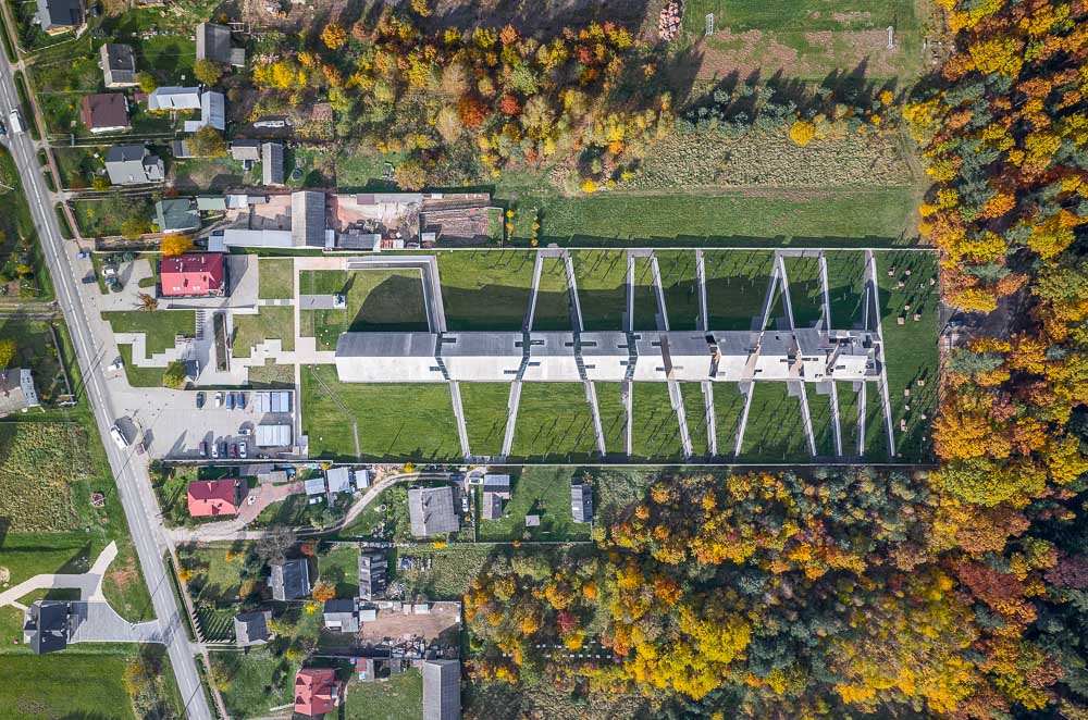 The designed museum as a whole covers more than 16,000㎡. The form of the building was determined by sculptural inspirations and the wish for unity between the architecture that is being designed and the historical narration. The monolithic body of the Mausoleum consists of 11 segments – entering the premises, the visitor first enters five closed segments. The sculptural, degraded part is open to nature, sky and landscape, changing - sometimes abruptly – as the weather conditions change. Through the glazing and the rips in the structure one can see the larch crosses surrounding the building. Their shape and symbolism inspired the form of the rips. The expressive architecture and intentional, progressive degradation of the solid create a unique atmosphere of the place.