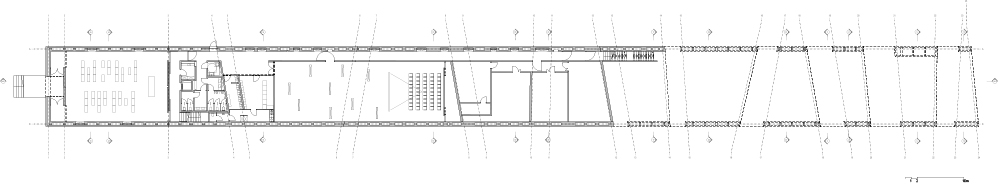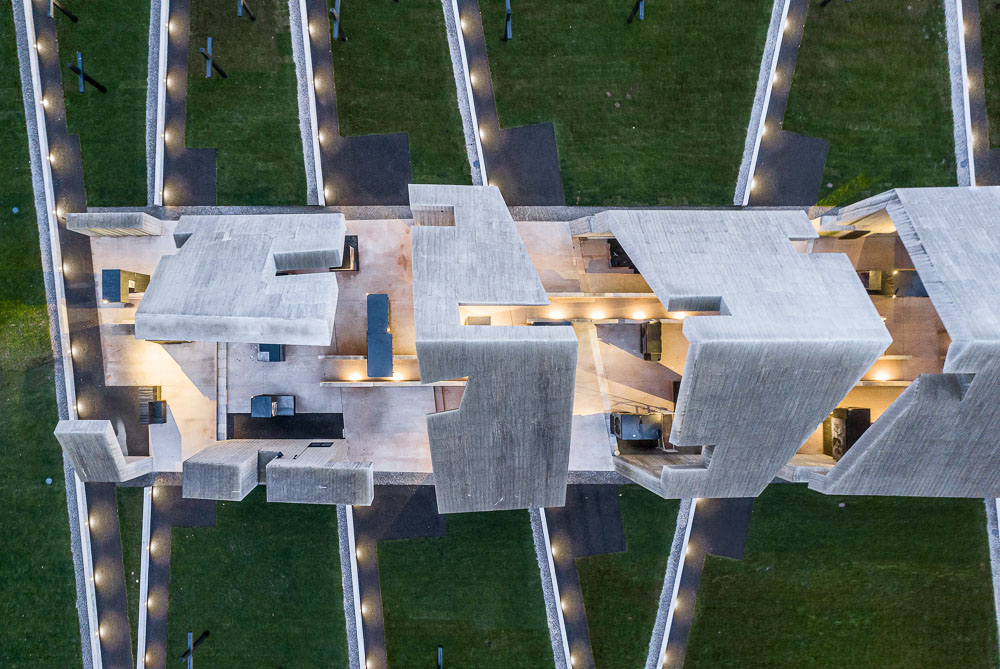 The light reaches the interior of the building through the cracks between the segments; depending on the time of the day and the season, it models the area of the permanent exhibition, located in the closed and open parts of the building. Architectural and scenographic details are designed to intensify the sensory experience. On concrete, the cool and ascetic material from which the solid is made, the symbolic imprint of the wood grain is noticeable.