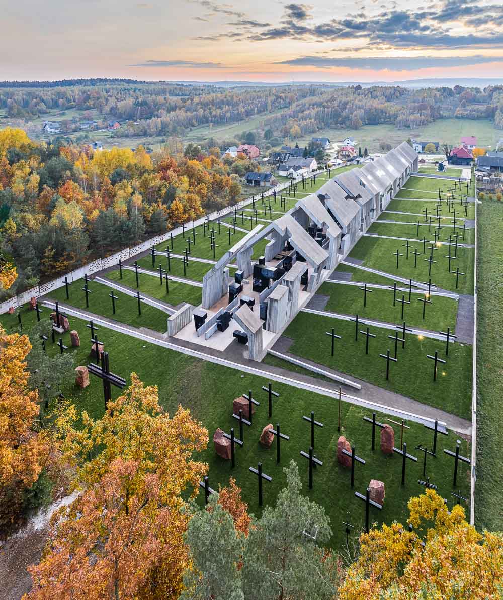 The building of the Mausoleum of Martyrdom of Polish Villages in Michniów is an architectural form of commemoration. The solid reflects the process of destruction, annihilation, that inspired Mirosław Nizio, the head of Nizio Design International, to create this sculptural form. In the foreground, the Mausoleum resembles a rural house. This first, intact part of the building is the House of Tranquillity. Subsequent segments convey the dramaturgy of the process that has upset a certain “order of the world”: the solid is degraded, destroyed, as in the aftermath of a fire. The concrete structure is marked with fractures, cuts, tears which generate emotions and tension. Both the architecture and the interior of the Mausoleum, as well as the permanent exhibition, are strongly inspired by historical events and the dramatic effects of pacification; they are a symbol of the repression that affected Polish villages during World War II and the Nazi and Soviet occupations.