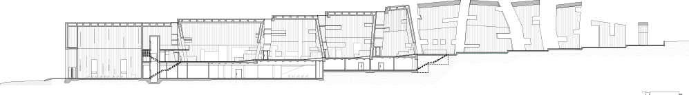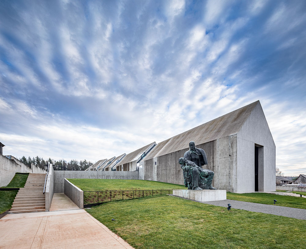 The designed museum as a whole covers more than 16,000㎡. The form of the building was determined by sculptural inspirations and the wish for unity between the architecture that is being designed and the historical narration. The monolithic body of the Mausoleum consists of 11 segments – entering the premises, the visitor first enters five closed segments. The sculptural, degraded part is open to nature, sky and landscape, changing - sometimes abruptly – as the weather conditions change. Through the glazing and the rips in the structure one can see the larch crosses surrounding the building. Their shape and symbolism inspired the form of the rips. The expressive architecture and intentional, progressive degradation of the solid create a unique atmosphere of the place.