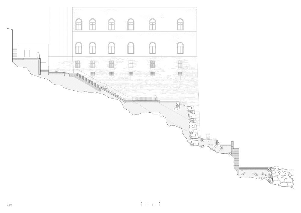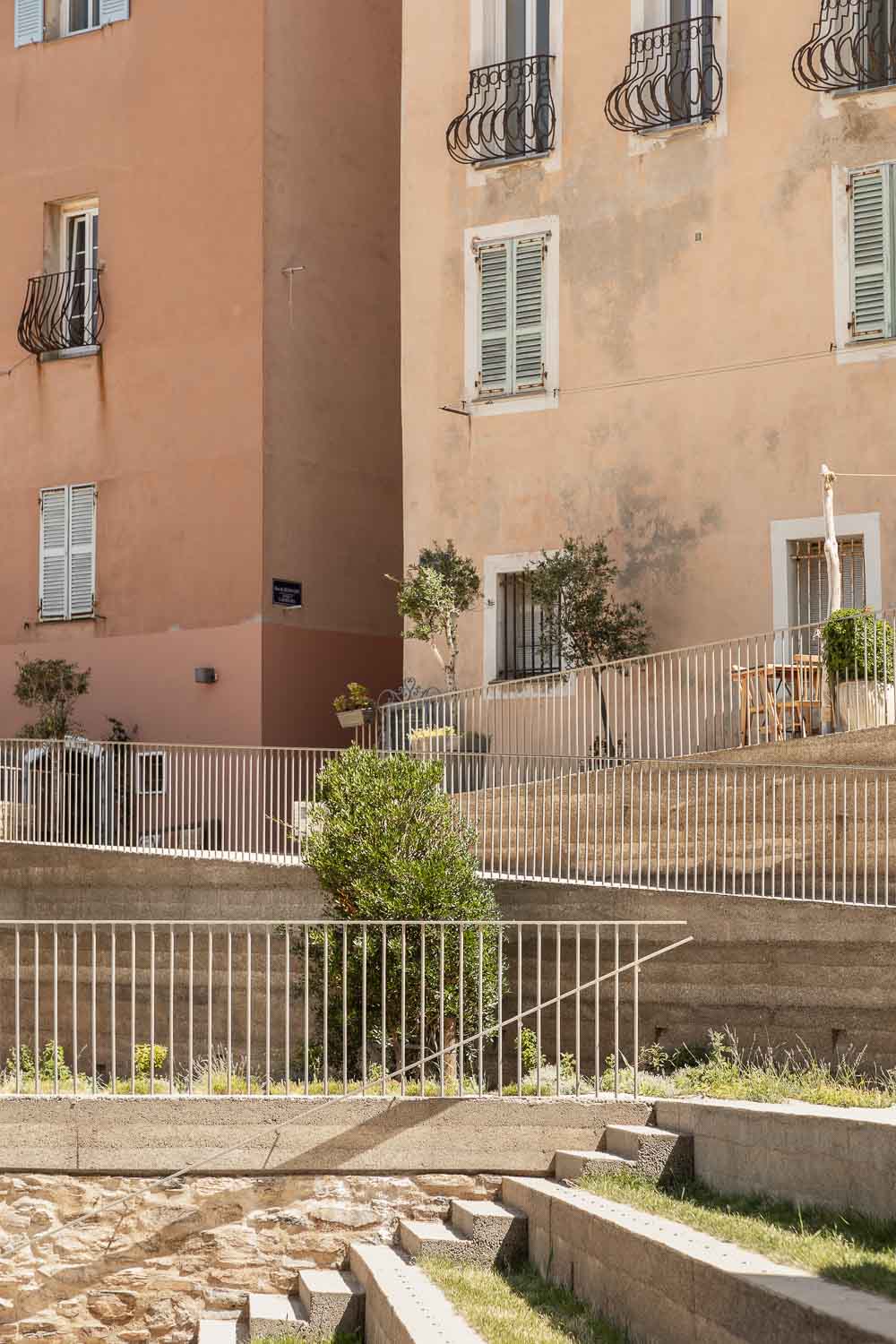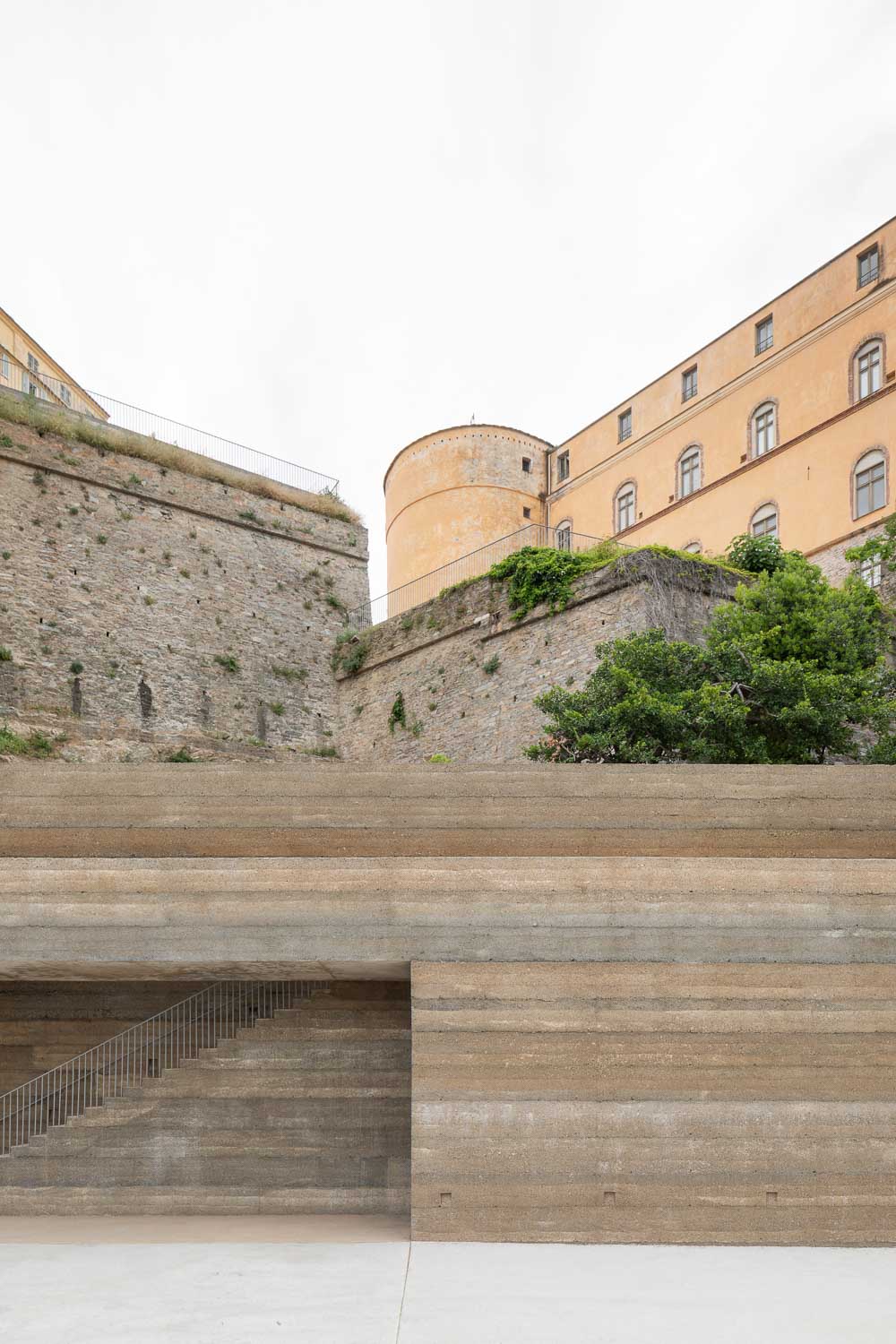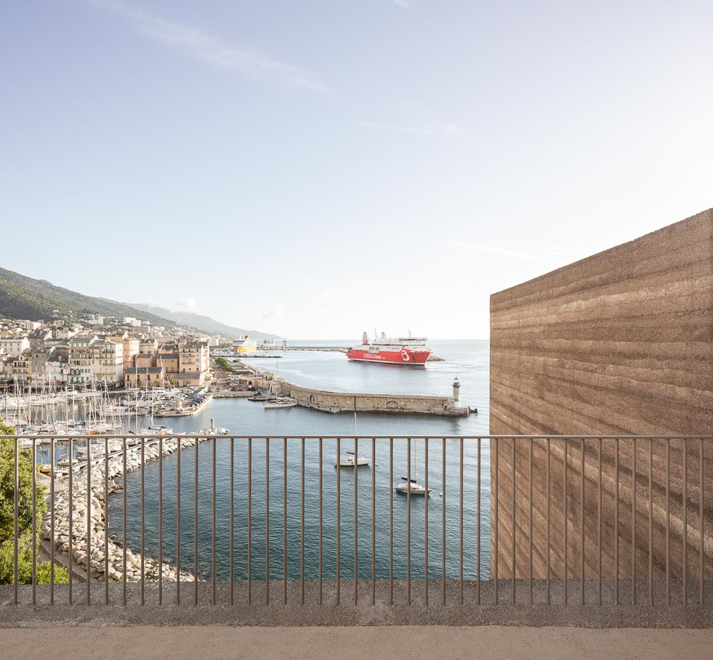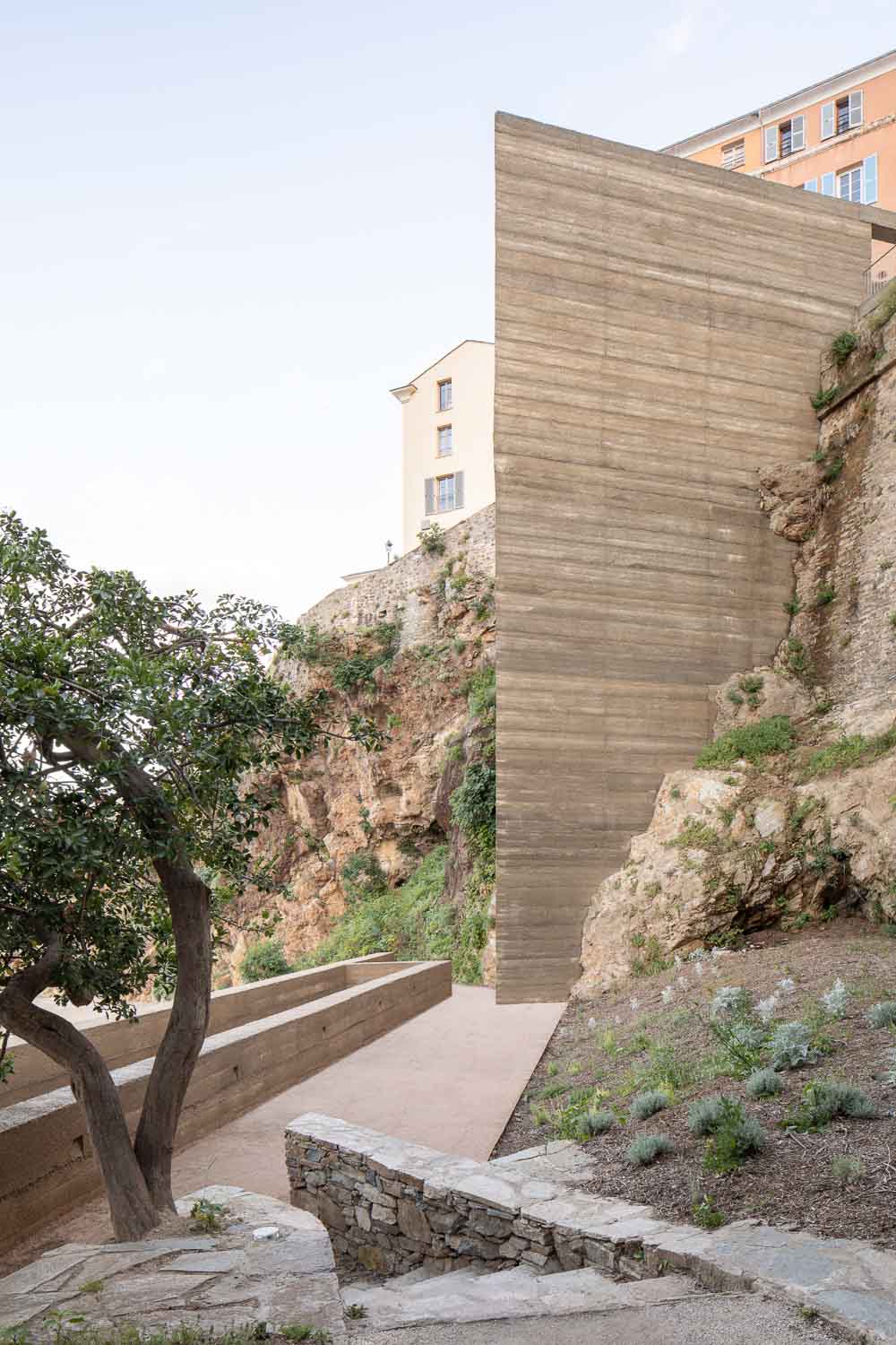 The project has three aims: first creating a pleasant link between the port and the Citadel of Bastia, second designing a theatre of greenery, and last but not least restoring the Romieu garden. The intervention takes place in the heart of the citadel on a very steep slope, and it expresses the objective of retrieving that citadel which has become a medium for a public space development between the city and the water. From belvederes to platforms, from staircases to ramps, from gardens to squares, the project multiplies the spaces of contemplation and strolls, offering visitors the choice of sequenced routes, alternating between openings on the horizon and narrowing on the rock, the walls and the vegetation. Architecture stands out here as a tool for resolving and clarifying the geometries of the site, hence the adoption of a plain writing which borrows from the adjoining walls their roughness and mass. The shape of the elevator is similar to a retaining wall leaning against the rocks, in continuity with the parapets of the citadel. Materials are at the heart of the project’ intentions. A measured and fair choice is translated in the use of aggregates extracted from the cliff for the production of a unique concrete. The material is then transfigured. Usually innocuous or industrial, concrete becomes artisanal and exceptional. In this case the “dry concrete” has a uniform gray-beige shade, and is cast in place as an architectonic cladding for all vertical and horizontal structures. This unique fare-faced concrete also has a neat and stamped look after a special care of the formwork. In addition to its finish, and being composed exclusively with the aggregates of the site (Cipollino marble + polished schist) the concrete is executed by tamping beds every 16cm on a formwork height of 48cm. Concrete with its asperities and hues, reflect thereby deeply the site and refer to the identity of the rocks on which the project leans. The absence of transport or importation, and the ex-nihilo extraction of materials are a responsible economic choice that benefits the execution and the handwork. This anchoring of the project to the Corsican territory by its materials, its seeking of an implementation mixing know-how and long duration, testifies of a general engagement towards contemporary architecture; which is in turn articulated around the values of modesty, demanding nature, as well as social and environmental responsibilities.