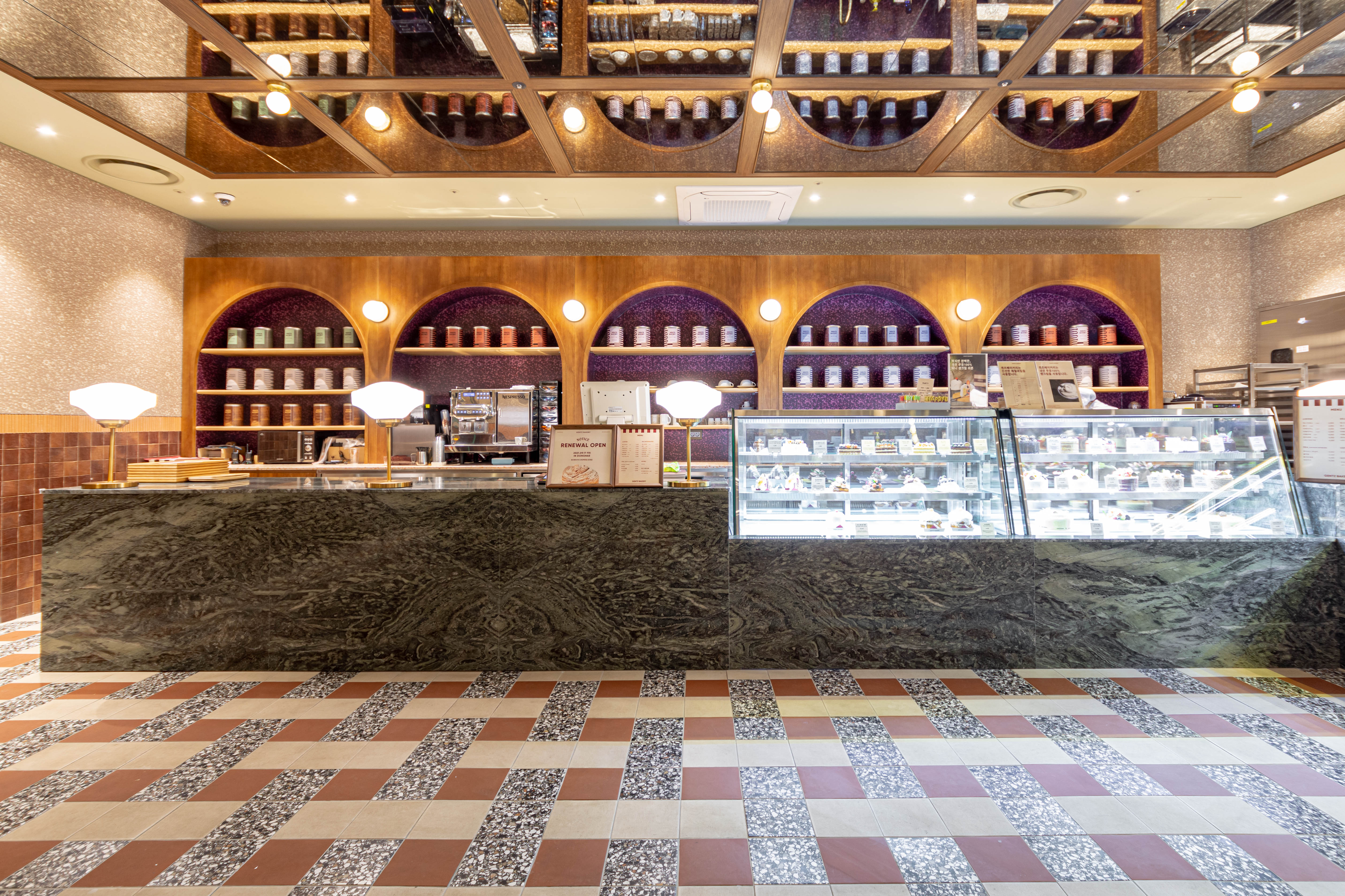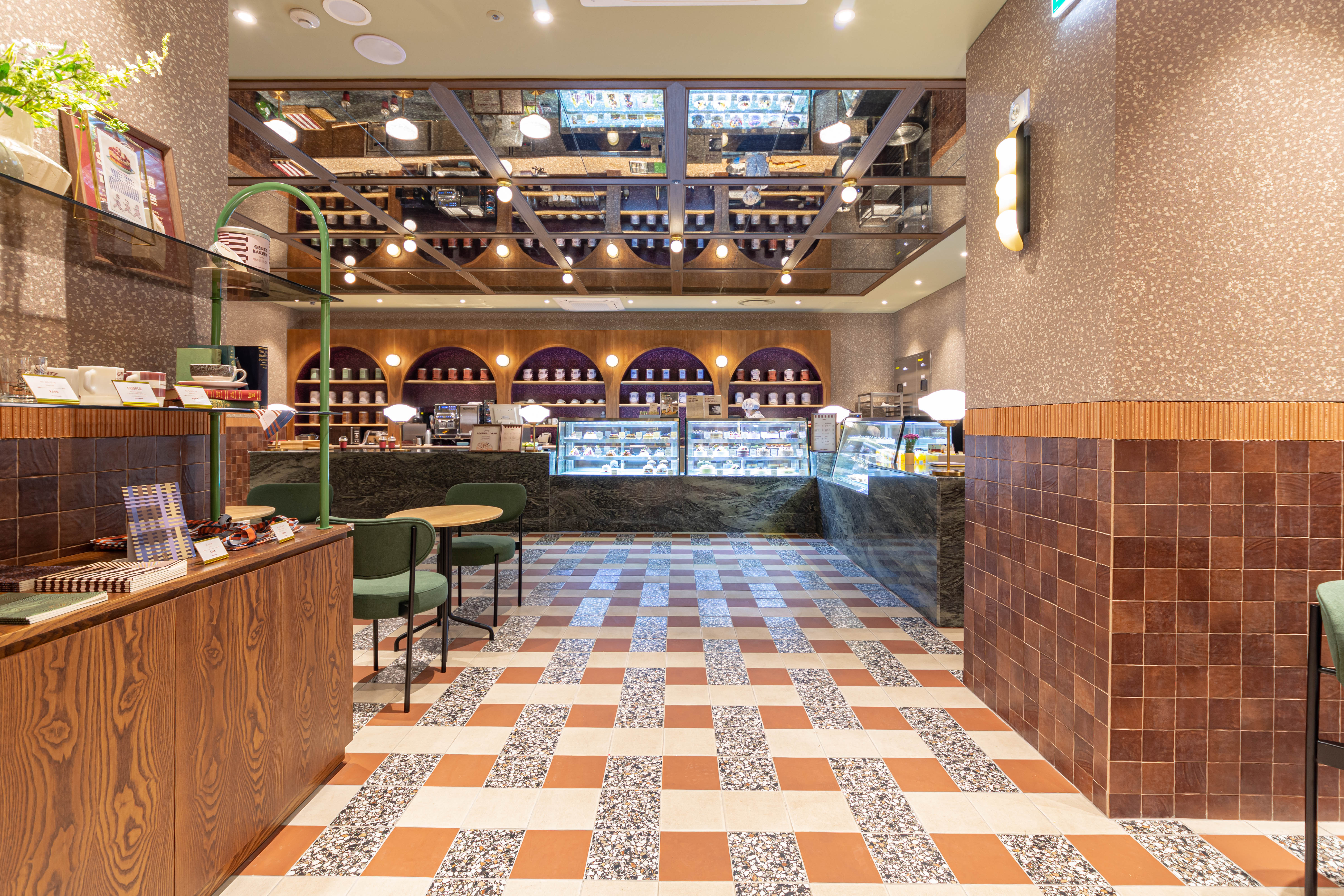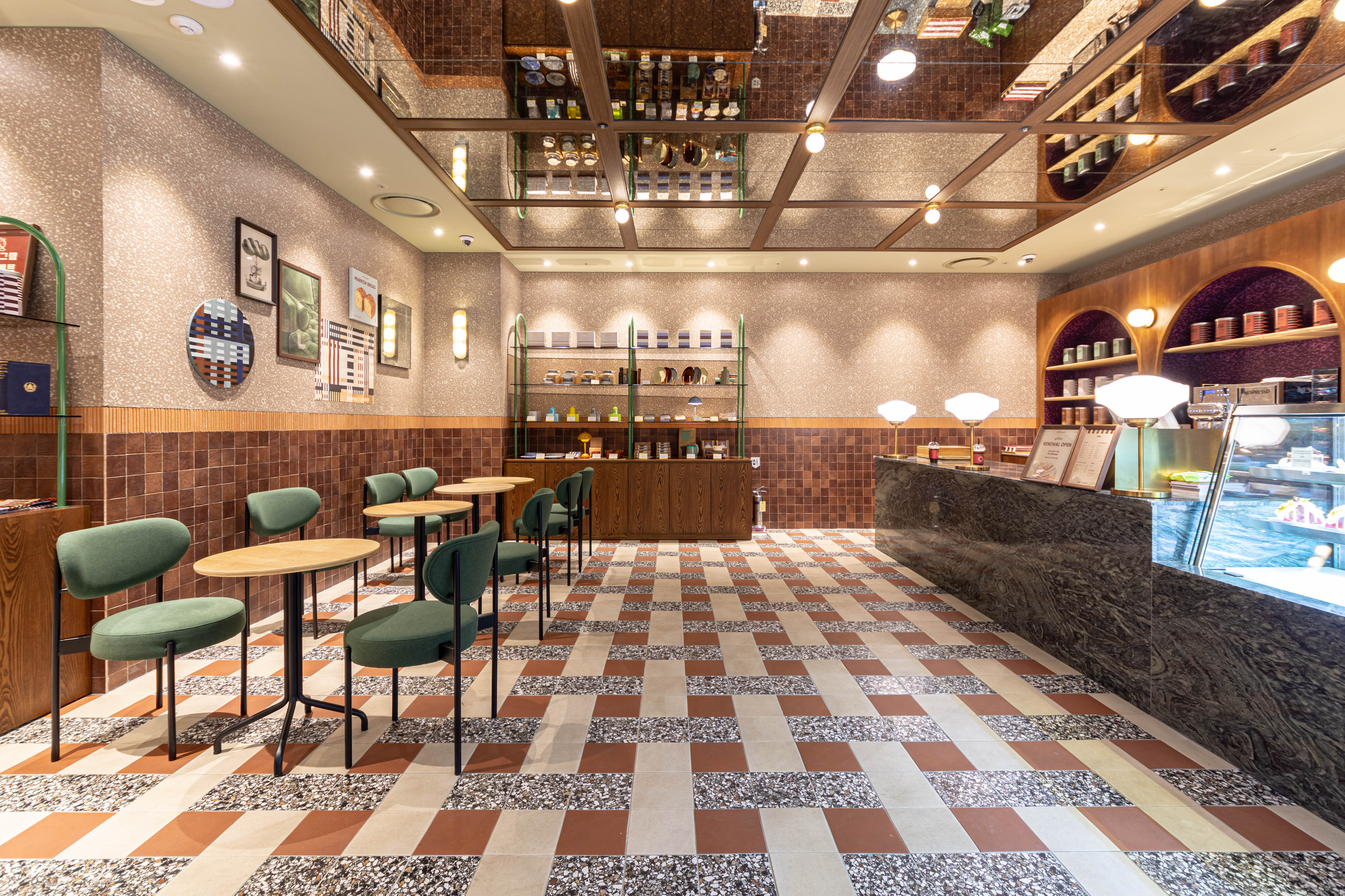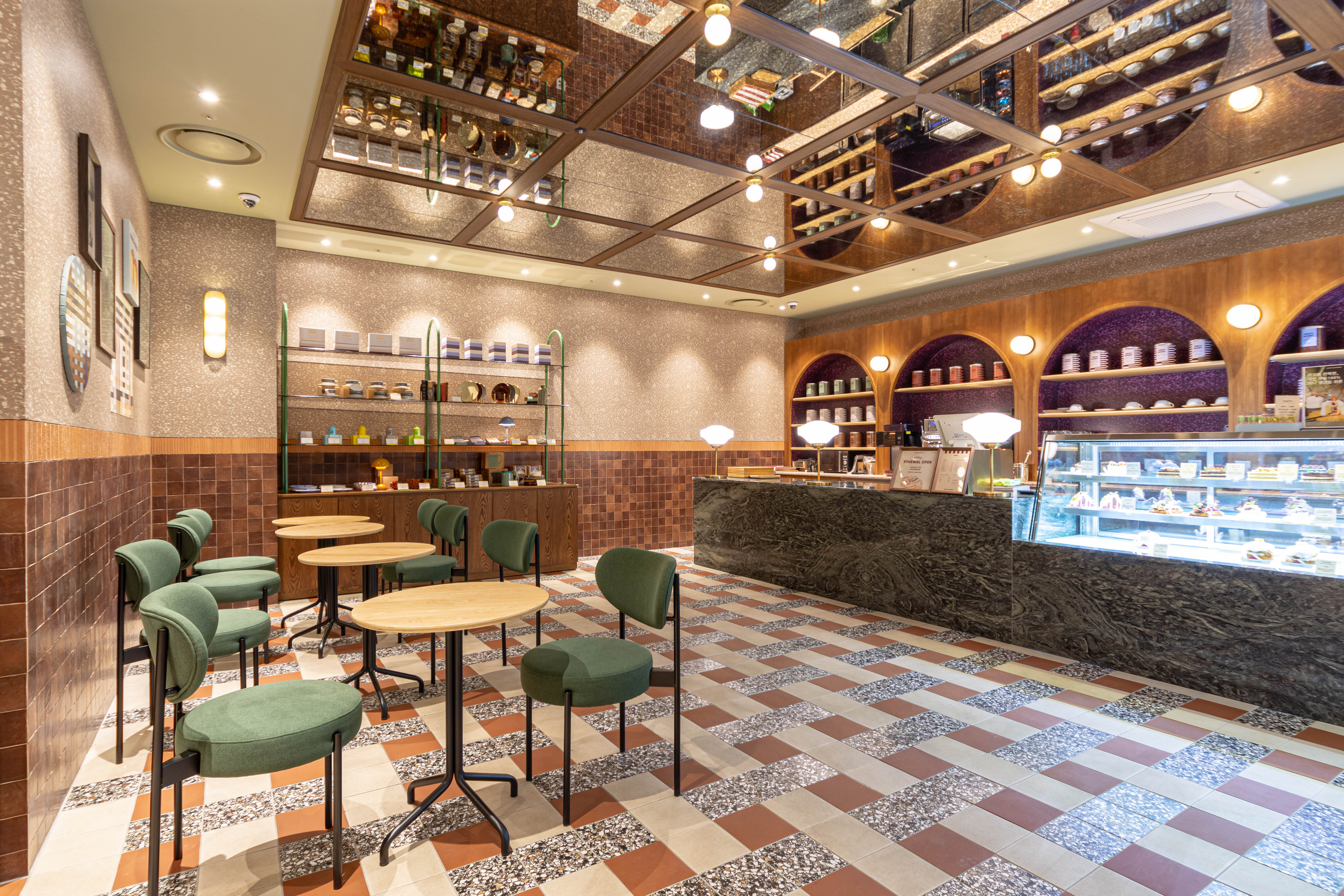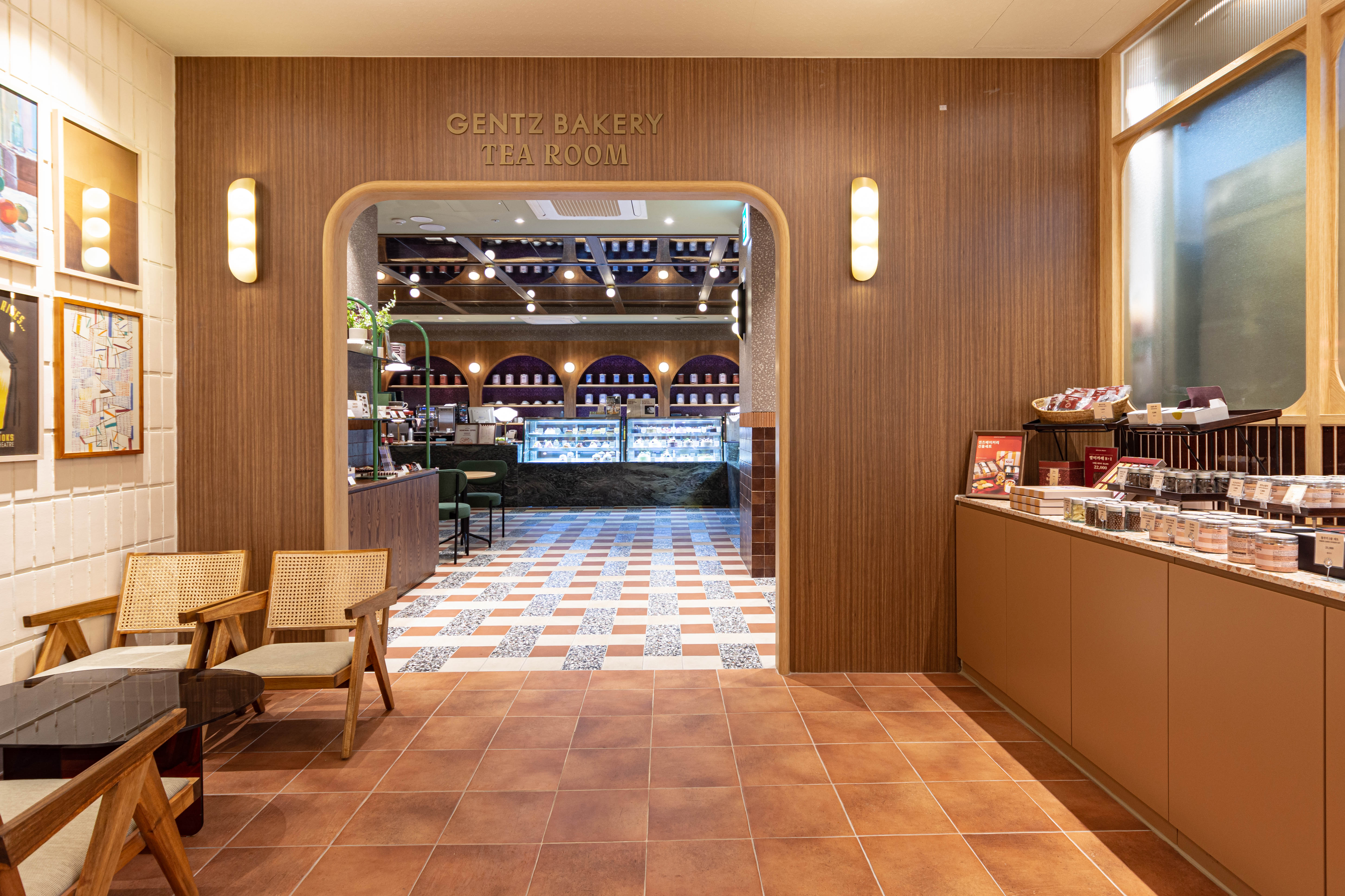 Due to the spatial constraint of being located inside the food hall of a department store, and due to the nature of the kitchen where there is a series of large ovens that require baking every hour, there was a limitation in creating a pleasant floor plan layout that allows customers to experience the brand. The products area where the bakery products are displayed and area where the tearoom and goods are located were intentionally separated to structure the space as if a new space derived from a single brand is located in a shop-in-shop concept. As for the use of materials, the tearoom was planned to allow customers visiting it to experience the new brand image through a design that reinterpreted the nostalgia for old things in a modern way by arranging modern materials that have a strong color combination with materials that have an old nostalgic sentiment, such as Gentz’s exclusive wallpapers, patterns, printed tiles, terracotta, marble, and terrazzo.