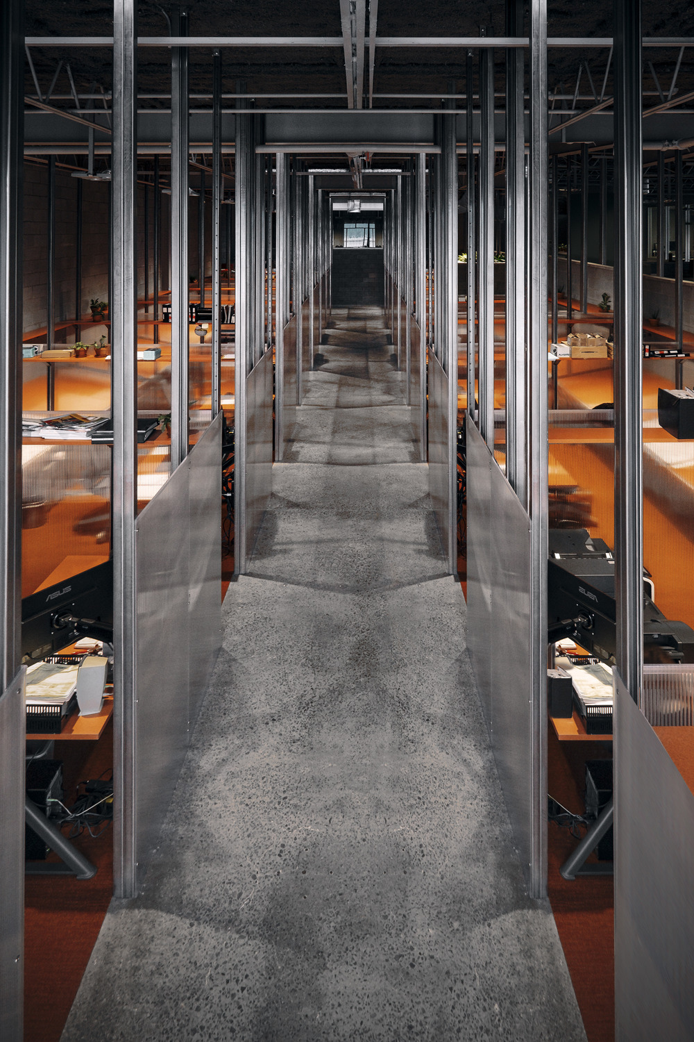 Prioritizing an architectural intervention with an assumed scenography, and falling within a strategy of minimizing its environmental impact, the project proposes the rehabilitation of a disused industrial building from the 1980s in order to establish the head office of Les Entreprises d’électricité E.G. Ltée, founded in 1951. By deploying 250 stainless steel strut channels, an imposing architectural device organizes distances and proximities, circulations, and groupings. These metal profiles, common in the electrical field, are used to fix the partitions, to support the furniture, and to camouflage all of the wiring. This profusion of elements composes an irregular frame that marks the space with vertical lines structuring the spatial delimitations. The industrial character, offered by the raw surfaces of the concrete, the shine of the stainless steel, and the translucent partitions unifying in an entity energized by accents of orange color, loads the space with an aesthetic cohesion emphasizing the re-interpretation of the open-plan office concept. Both minimalist and expressive, EG offers an environment indulgent of accumulation and excess to stimulate the participatory experience that is part of the daily life of its users.