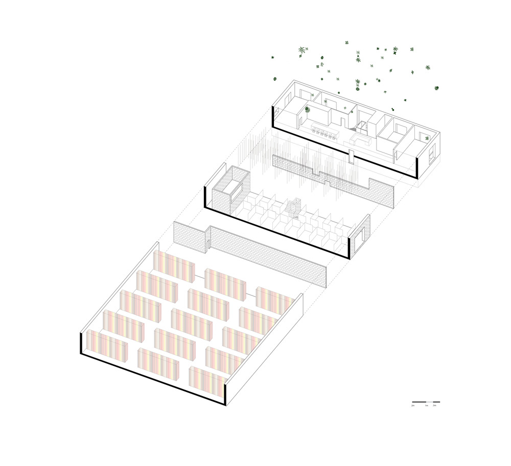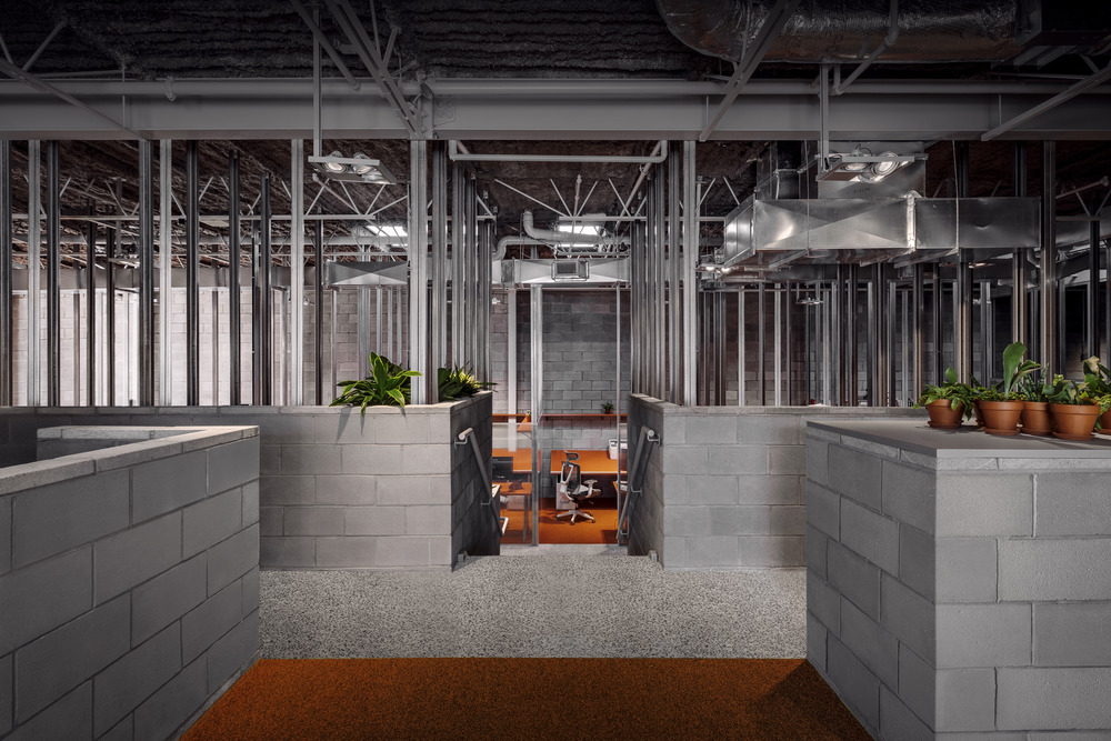 직원들이 서로 쉽게 의사 소통할 수 있는 레이아웃을 위해 회의 공간, 휴게소, 스포츠 및 엔터테인먼트 공간뿐만 아니라 모든 사람의 보호와 웰빙을 위한 물리적 거리의 필요성을 보장하는 사적인 영역을 결합한다. 건축주의 요구에 비해 너무 좁은 공간들은 완전한 재구성이 필요했다. 넓은 면적을 필요로 하는 개인 및 협업 작업 공간은 건물의 거대한 저장 공간에서 뺀 부분에 배치됐다. 부분적으로 해체된 콘크리트 블록으로 만들어진 기존 방화벽은 관리 공간 아래에 위치한 새로운 구역에 시각적 및 물리적 접근을 제공하는 굴절식 난간과 계단으로 변형됐다. 콘크리트 블록으로 된 새로운 작업 공간은 천장 아래 6미터 높이의 넉넉한 볼륨을 구성하며 건물의 기능을 최적화하기 위해 거대한 창고 공간과 수평으로 접근할 수 있는 이점이 있다. 자연 채광을 최대한 활용하기 위해 거대한 차고 문을 커튼월로 교체했다. 자연 채광을 늘리기 위해 지붕에 기존 구조 프레임워크에 맞는 6개의 채광창을 추가했다. 반투명 파티션으로 필터링된 이러한 다중 광원은 실험의 연극성에 기여하는 조명으로 공간을 감싸고 있다.