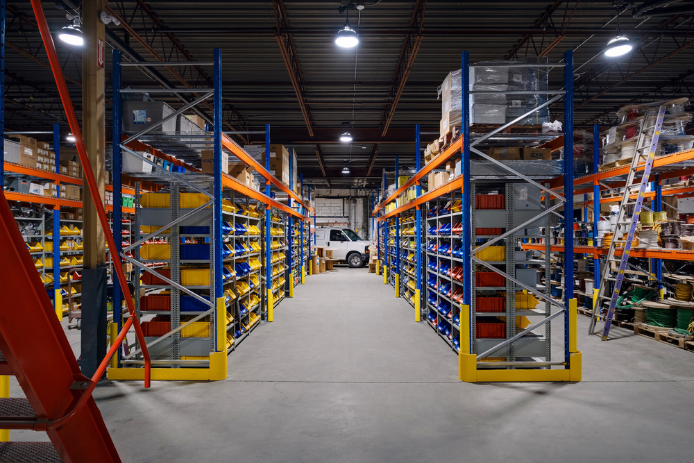 Promoting a layout where employees can easily communicate with each other, the intervention combines private areas ensuring the need for physical distance for the protection and well-being of everyone, as well as meeting spaces, rest stations, and areas for sports and entertainment. The portion dedicated to offices, a space distributed in half-levels and proving too cramped for the needs of the company, requires a complete reconfiguration (reception, administrative offices, conference room, kitchen, employee room, and storage). The individual and collaborative workspaces, requiring a large area, are set up in a portion subtracted from the huge storage space of the building. Partially deconstructed, the existing firewall, made of concrete blocks, is transformed into an articulated railing and a staircase offering visual and physical access to this new sector located below the administrative spaces. This work area, defined by a new enclosure also in concrete blocks, constitutes a generous volume with a height of six meters below the ceiling, benefitting from level access with the immense warehouse area in order to optimize the functionality of the premises. In order to maximize the contribution of natural light, the huge garage door is replaced by a curtain wall. On the roof, the addition of six skylights, with dimensions that fit into the existing structural framework, helps provide increased natural lighting. These multiple light sources, filtered by translucent partitions, wrap the space in kinetic lighting that contributes to the theatricality of the experiment.