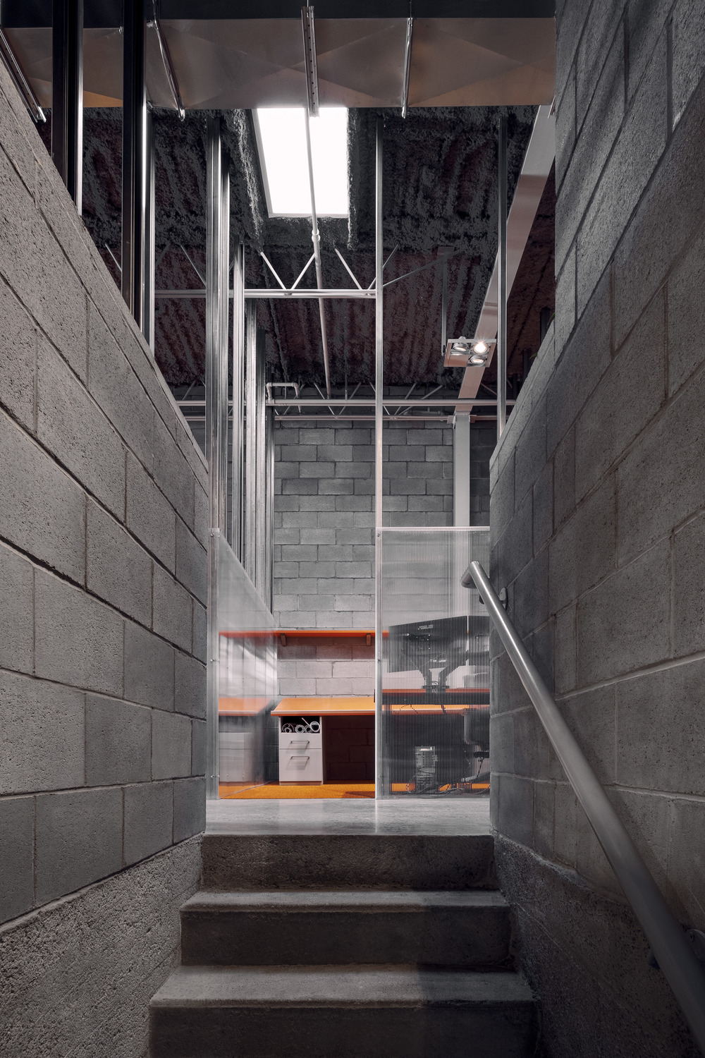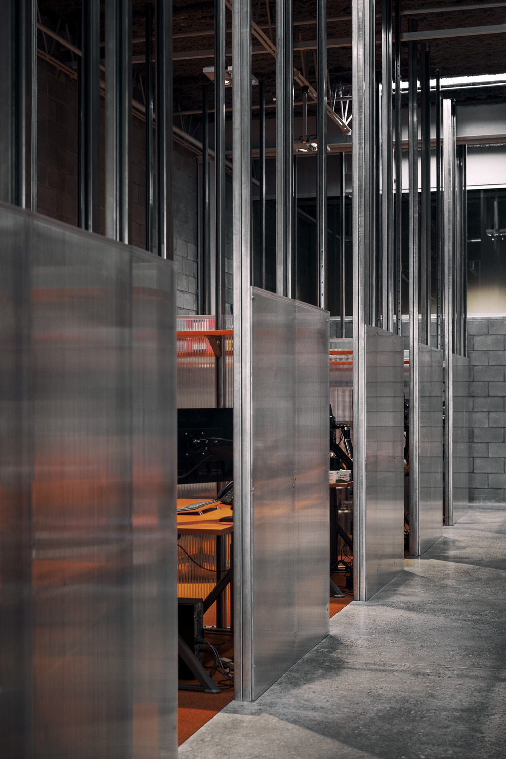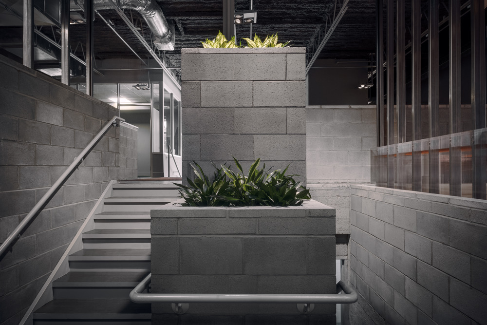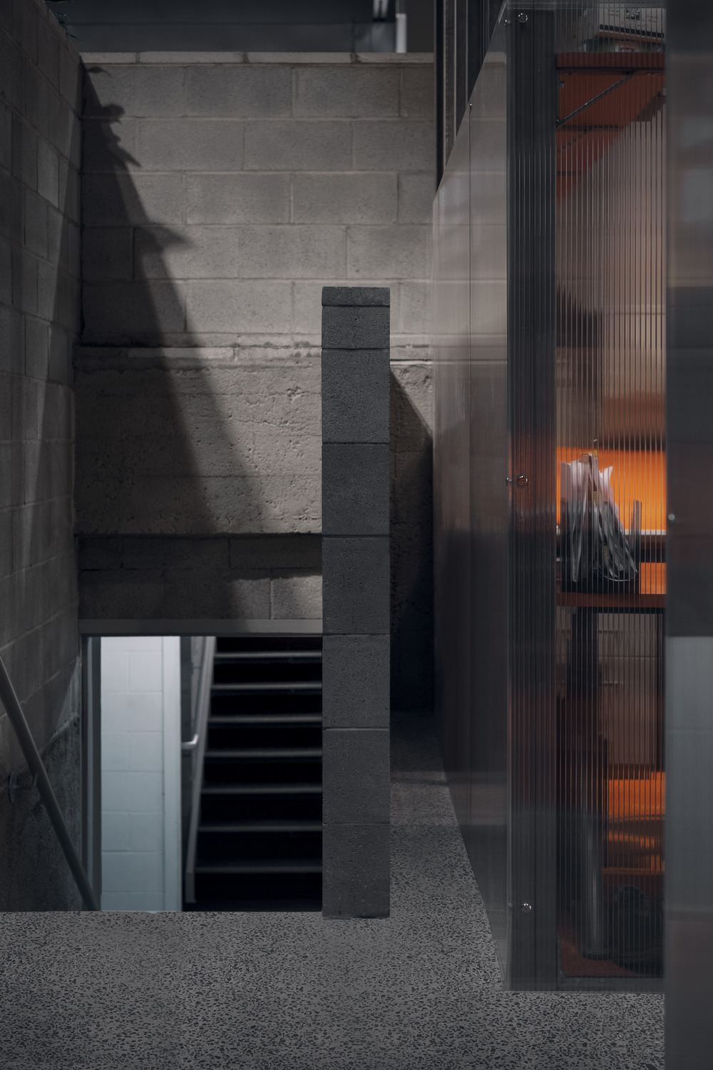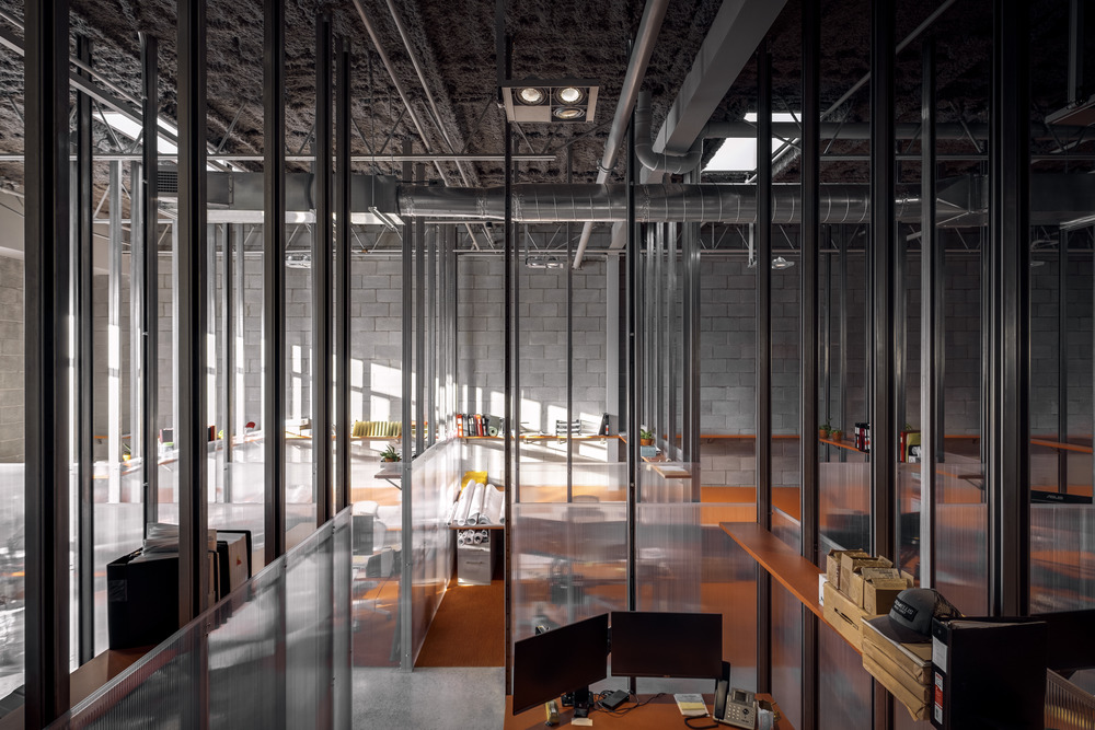 직원들이 서로 쉽게 의사 소통할 수 있는 레이아웃을 위해 회의 공간, 휴게소, 스포츠 및 엔터테인먼트 공간뿐만 아니라 모든 사람의 보호와 웰빙을 위한 물리적 거리의 필요성을 보장하는 사적인 영역을 결합한다. 건축주의 요구에 비해 너무 좁은 공간들은 완전한 재구성이 필요했다. 넓은 면적을 필요로 하는 개인 및 협업 작업 공간은 건물의 거대한 저장 공간에서 뺀 부분에 배치됐다. 부분적으로 해체된 콘크리트 블록으로 만들어진 기존 방화벽은 관리 공간 아래에 위치한 새로운 구역에 시각적 및 물리적 접근을 제공하는 굴절식 난간과 계단으로 변형됐다. 콘크리트 블록으로 된 새로운 작업 공간은 천장 아래 6미터 높이의 넉넉한 볼륨을 구성하며 건물의 기능을 최적화하기 위해 거대한 창고 공간과 수평으로 접근할 수 있는 이점이 있다. 자연 채광을 최대한 활용하기 위해 거대한 차고 문을 커튼월로 교체했다. 자연 채광을 늘리기 위해 지붕에 기존 구조 프레임워크에 맞는 6개의 채광창을 추가했다. 반투명 파티션으로 필터링된 이러한 다중 광원은 실험의 연극성에 기여하는 조명으로 공간을 감싸고 있다.