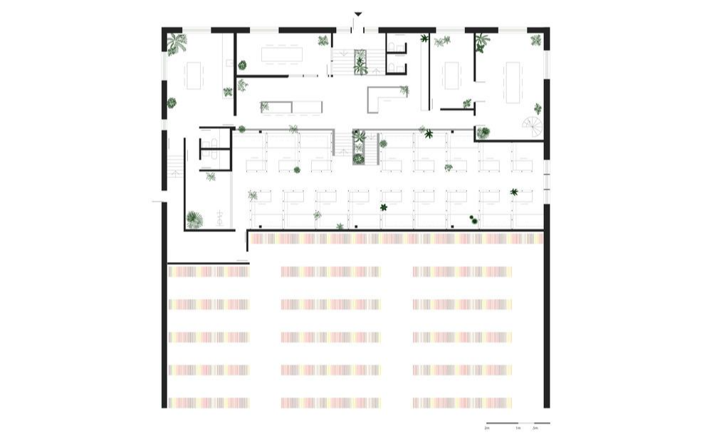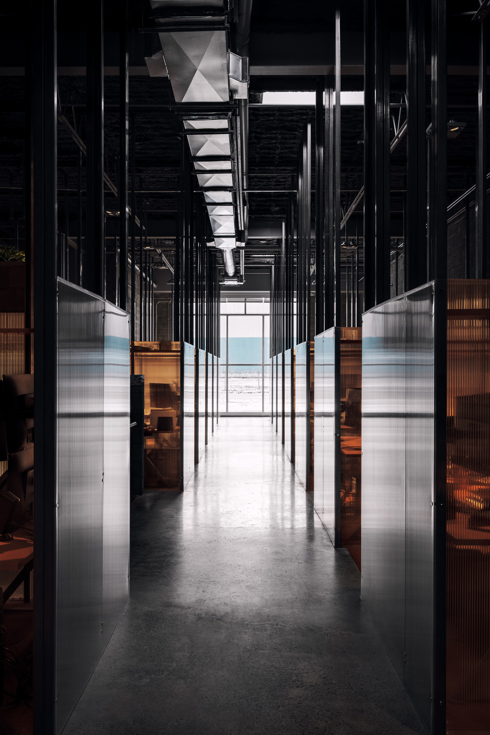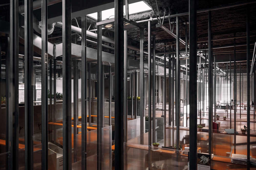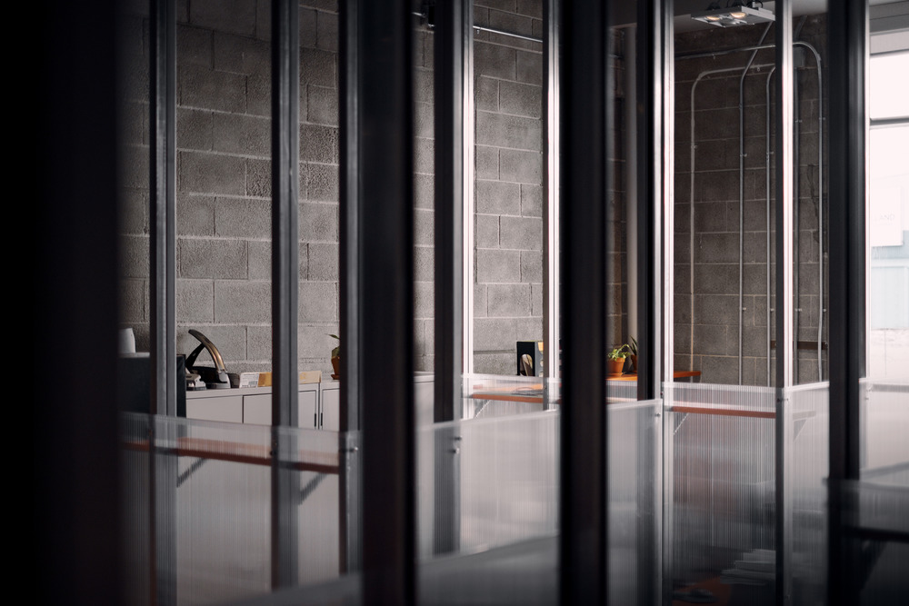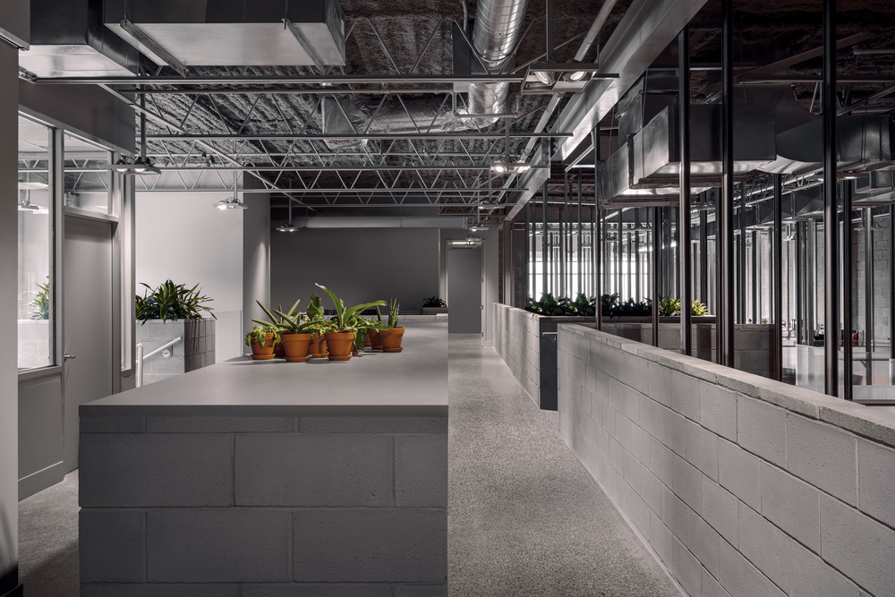 직원들이 서로 쉽게 의사 소통할 수 있는 레이아웃을 위해 회의 공간, 휴게소, 스포츠 및 엔터테인먼트 공간뿐만 아니라 모든 사람의 보호와 웰빙을 위한 물리적 거리의 필요성을 보장하는 사적인 영역을 결합한다. 건축주의 요구에 비해 너무 좁은 공간들은 완전한 재구성이 필요했다. 넓은 면적을 필요로 하는 개인 및 협업 작업 공간은 건물의 거대한 저장 공간에서 뺀 부분에 배치됐다. 부분적으로 해체된 콘크리트 블록으로 만들어진 기존 방화벽은 관리 공간 아래에 위치한 새로운 구역에 시각적 및 물리적 접근을 제공하는 굴절식 난간과 계단으로 변형됐다. 콘크리트 블록으로 된 새로운 작업 공간은 천장 아래 6미터 높이의 넉넉한 볼륨을 구성하며 건물의 기능을 최적화하기 위해 거대한 창고 공간과 수평으로 접근할 수 있는 이점이 있다. 자연 채광을 최대한 활용하기 위해 거대한 차고 문을 커튼월로 교체했다. 자연 채광을 늘리기 위해 지붕에 기존 구조 프레임워크에 맞는 6개의 채광창을 추가했다. 반투명 파티션으로 필터링된 이러한 다중 광원은 실험의 연극성에 기여하는 조명으로 공간을 감싸고 있다.