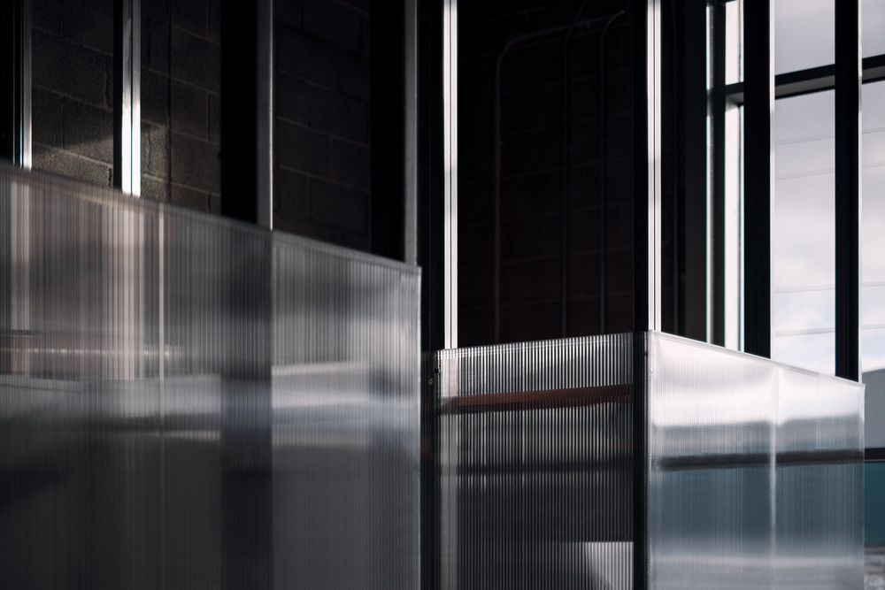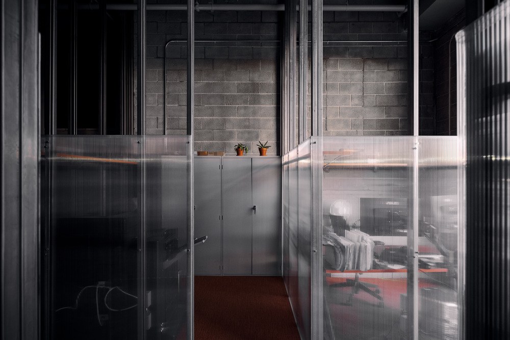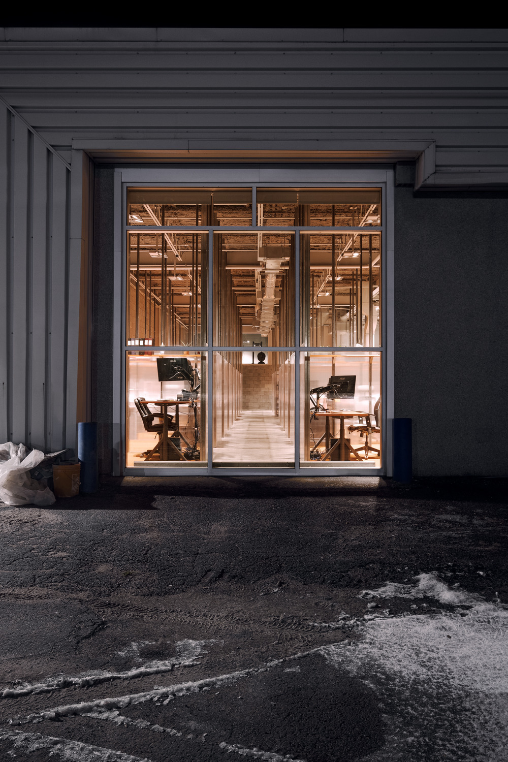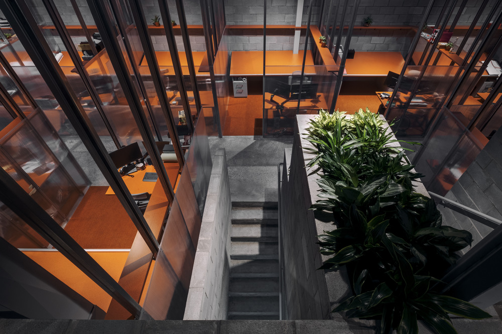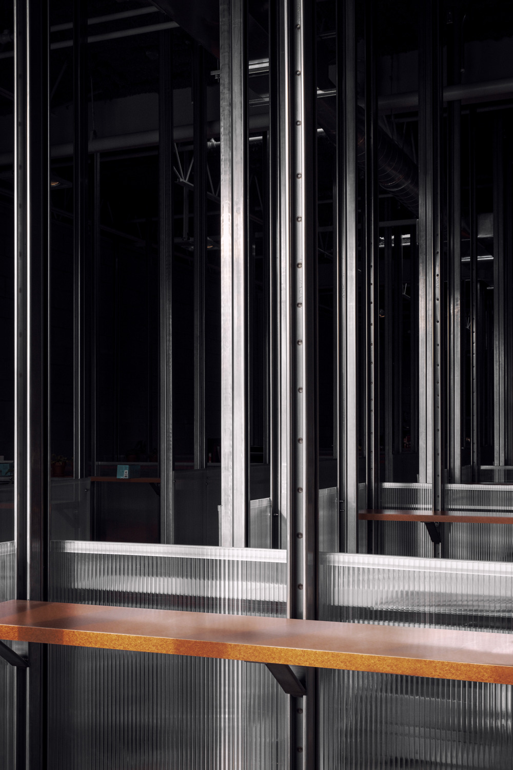 직원들이 서로 쉽게 의사 소통할 수 있는 레이아웃을 위해 회의 공간, 휴게소, 스포츠 및 엔터테인먼트 공간뿐만 아니라 모든 사람의 보호와 웰빙을 위한 물리적 거리의 필요성을 보장하는 사적인 영역을 결합한다. 건축주의 요구에 비해 너무 좁은 공간들은 완전한 재구성이 필요했다. 넓은 면적을 필요로 하는 개인 및 협업 작업 공간은 건물의 거대한 저장 공간에서 뺀 부분에 배치됐다. 부분적으로 해체된 콘크리트 블록으로 만들어진 기존 방화벽은 관리 공간 아래에 위치한 새로운 구역에 시각적 및 물리적 접근을 제공하는 굴절식 난간과 계단으로 변형됐다. 콘크리트 블록으로 된 새로운 작업 공간은 천장 아래 6미터 높이의 넉넉한 볼륨을 구성하며 건물의 기능을 최적화하기 위해 거대한 창고 공간과 수평으로 접근할 수 있는 이점이 있다. 자연 채광을 최대한 활용하기 위해 거대한 차고 문을 커튼월로 교체했다. 자연 채광을 늘리기 위해 지붕에 기존 구조 프레임워크에 맞는 6개의 채광창을 추가했다. 반투명 파티션으로 필터링된 이러한 다중 광원은 실험의 연극성에 기여하는 조명으로 공간을 감싸고 있다.