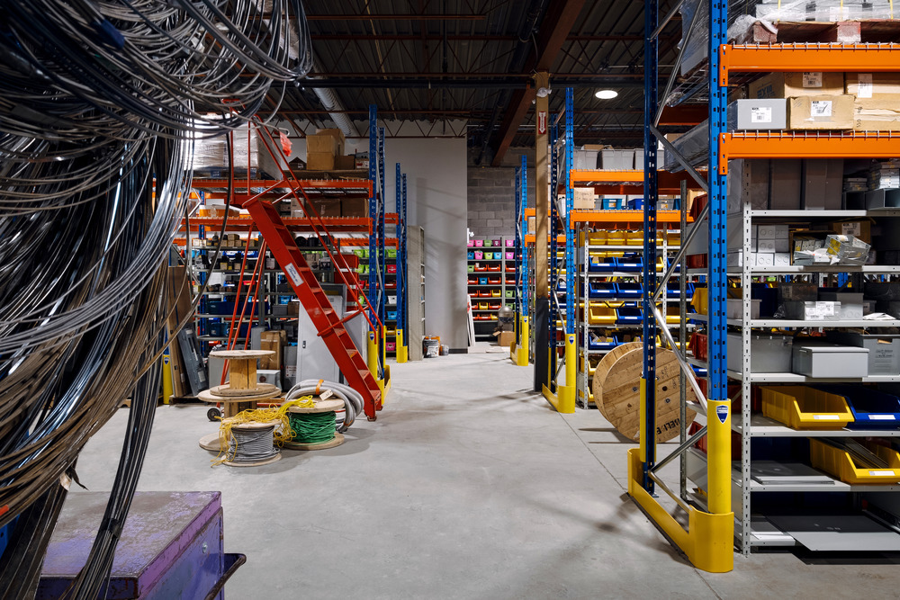 Promoting a layout where employees can easily communicate with each other, the intervention combines private areas ensuring the need for physical distance for the protection and well-being of everyone, as well as meeting spaces, rest stations, and areas for sports and entertainment. The portion dedicated to offices, a space distributed in half-levels and proving too cramped for the needs of the company, requires a complete reconfiguration (reception, administrative offices, conference room, kitchen, employee room, and storage). The individual and collaborative workspaces, requiring a large area, are set up in a portion subtracted from the huge storage space of the building. Partially deconstructed, the existing firewall, made of concrete blocks, is transformed into an articulated railing and a staircase offering visual and physical access to this new sector located below the administrative spaces. This work area, defined by a new enclosure also in concrete blocks, constitutes a generous volume with a height of six meters below the ceiling, benefitting from level access with the immense warehouse area in order to optimize the functionality of the premises. In order to maximize the contribution of natural light, the huge garage door is replaced by a curtain wall. On the roof, the addition of six skylights, with dimensions that fit into the existing structural framework, helps provide increased natural lighting. These multiple light sources, filtered by translucent partitions, wrap the space in kinetic lighting that contributes to the theatricality of the experiment.