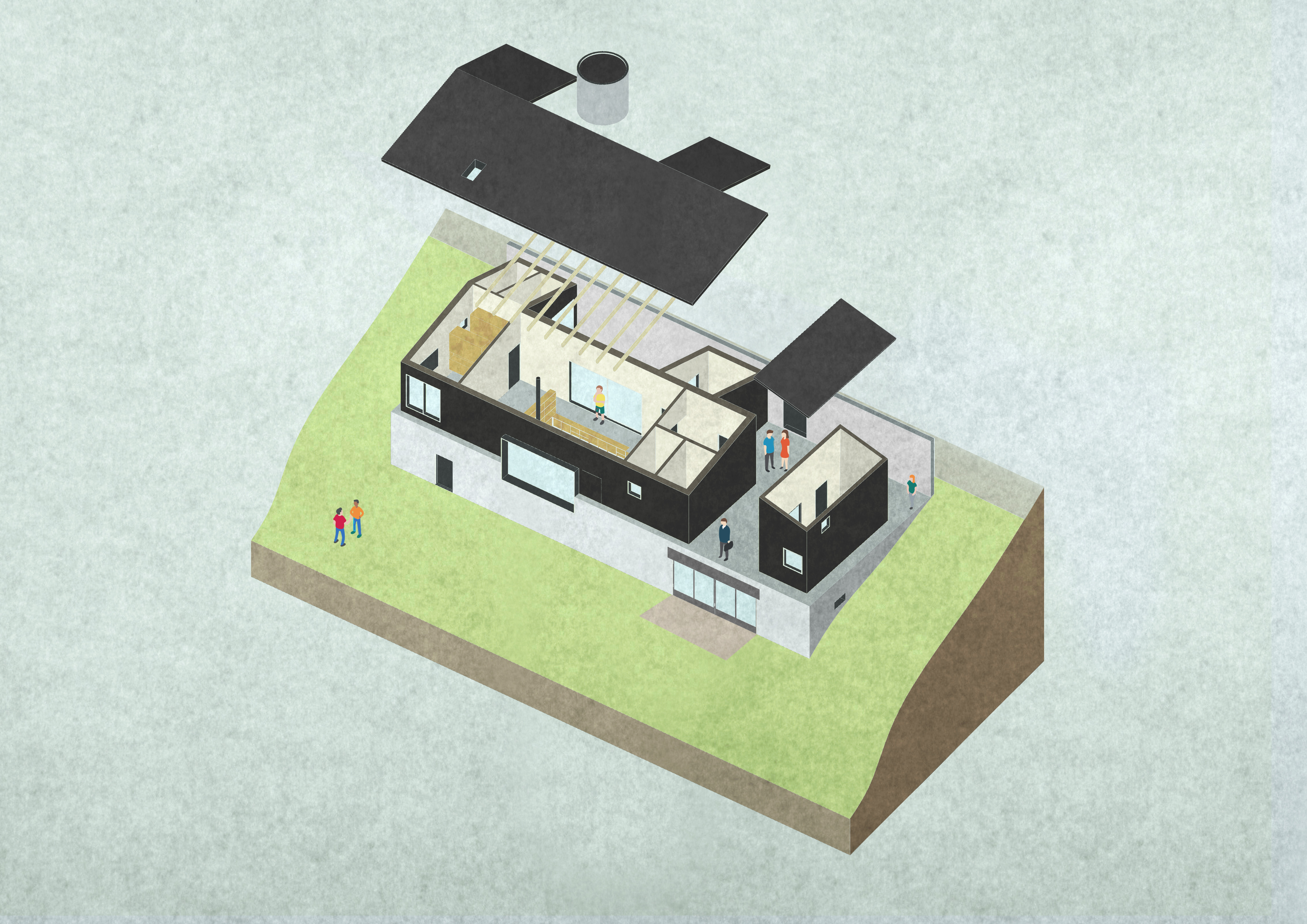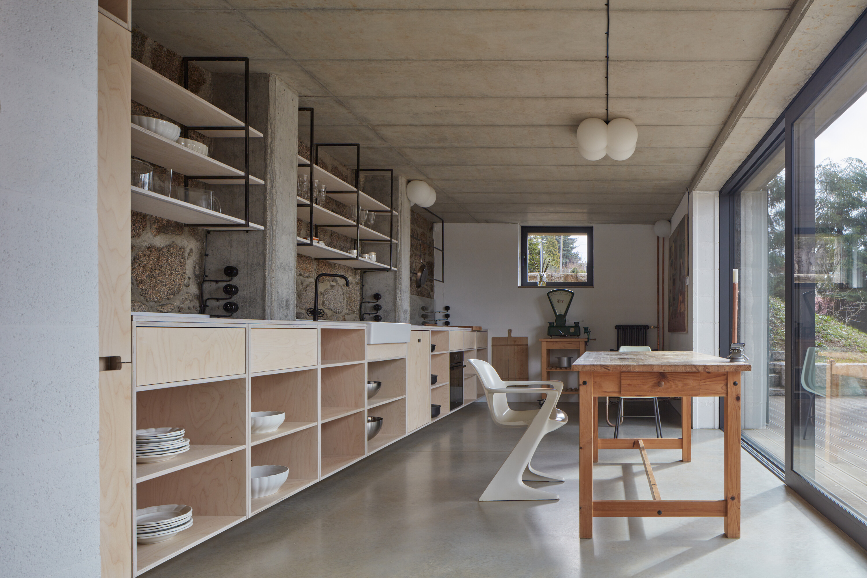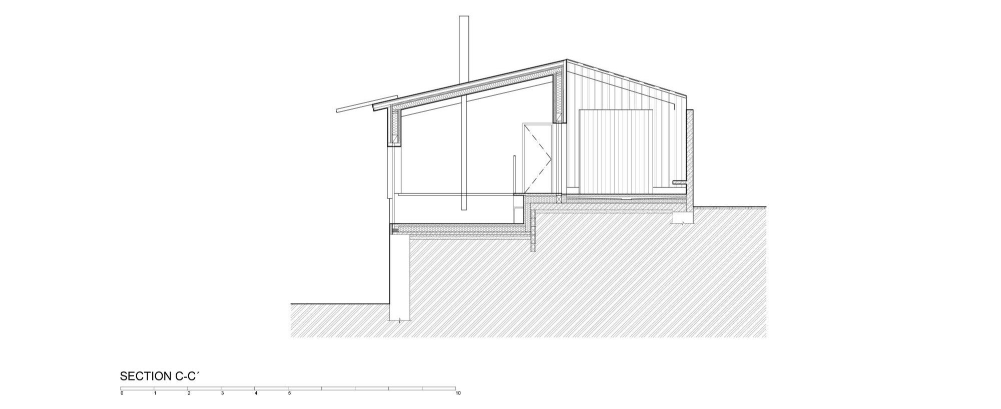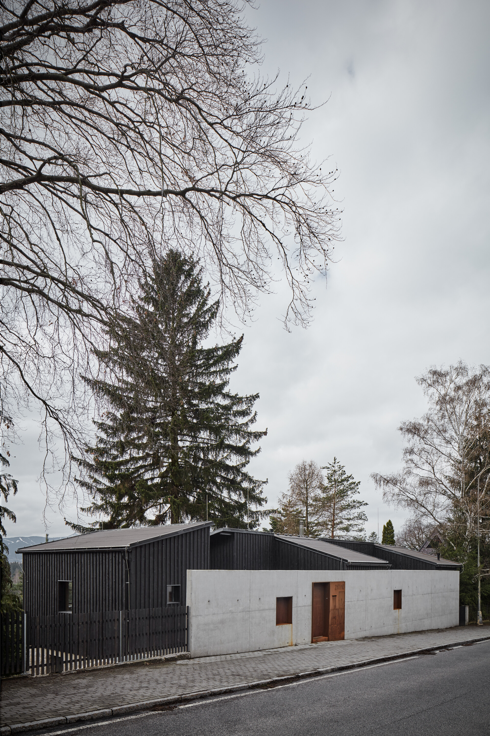 It all started with the clients’ purchase of a house over a hundred years old. The traditional building with a gable roof was at its end. Its stone basement was still in a good condition so we decided to take down the rest of the house and use the stone socle in the basement as a foundation for the new house. The courageous and somewhat risky plan worked out and today, the clients live in a beautiful, modern house which combines the historical soul of its predecessor and nordic esthetics with a touch of industrial style. The lot borders a busy road which serves as a starting point for tourists heading to the Jizera Mountains. Because of this we designed a new concrete wall in place of the former exterior wall of the old house. This will not only decrease the amount of noise from the nearby road but also define the outside entrance area to the house. Behind the wall is a small yard with a view of Ještěd which serves as a guidepost between the entrance, the guest house and the stairs to the yard below. The construction of the new part is wooden. The asphalt roof together with the black, tar-painted facade reminds us of the shed that used to stand here. On the old stone foundation behind the concrete wall are actually two houses; a family house and a small guest house for a young sailor, the clients’ son, who spends most of the year at the helm of transatlantic ships. The parents’ house is more complicated as its building design had to encompass the needs of three different people - a friendly couple and their daughter. The wooden addition above the basement ceiling consists of bedrooms, an office, a bathroom with a toilet and an outdoor yard with a sauna. The living space of the house is defined by large windows on both sides. The window on the southwest facade brings the view of the Harcov stream valley and Ještěd while the north window shows the previously mentioned sauna yard. A couple of steps lower is a living room stairhead with a fireplace and a wide staircase to the kitchen and dining room which are connected to the patio. The rest of the basement is used as a utility room and storage space.