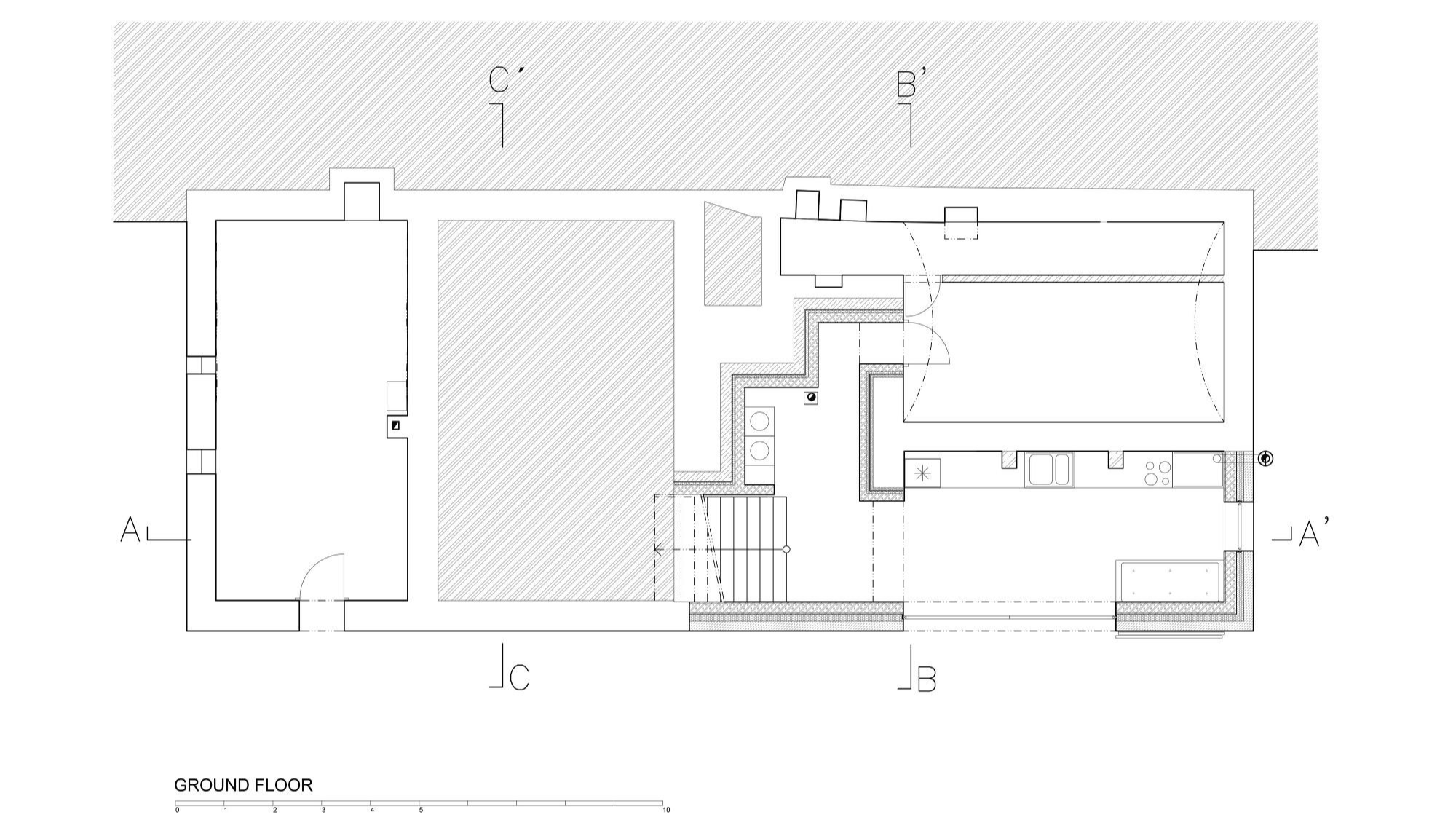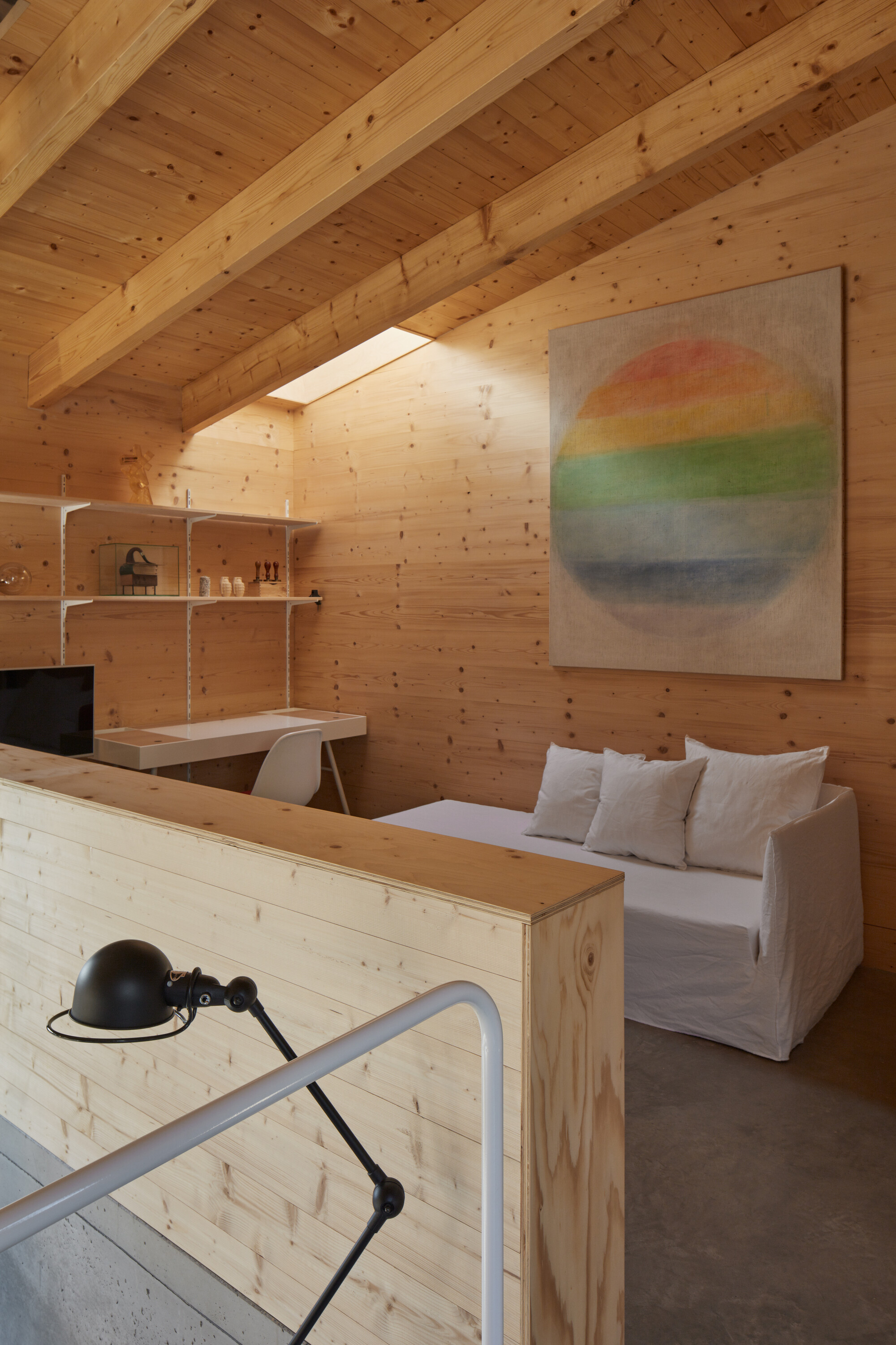 비하인드 더월은 100년 이상된 박공 지붕의 전통적인 집을 사용하여 만들어진 리모델링 주택이다. 집은 도로 끝에 위치해 있었다. 이 집은 기존 건물 석조 지하실의 공간을 새로운 집의 기초로 사용하고 나머지 부분은 철거됐다. 다소 과감한 건축가의 계획 안으로 건축주는 이전의 역사적 흔적과 북유럽의 산업적인 스타일을 결합시킨 아름답고 현대적인 집에서 살고 있다. 이 대지는 지제라(Jizera) 산맥으로 향하는 관광객들의 출발점 역할을 하는 혼잡한 도로와 접해 있다. 이것 때문에 건축가는 옛 집의 오래된 외벽 대신 새로운 콘크리트 벽을 만들었다. 콘크리트 벽은 근처 도로에서 발생하는 소음을 차단할 뿐만 아니라 집의 외부 출입구를 나타낸다. 벽 뒤에는 제터드(Ještěd) 산이 보이는 작은 마당이 있으며, 입구, 게스트하우스로 쓰이기도 한다. 또한, 마당으로 이어지는 계단 사이에 이정표 역할도 한다. 새로 더해진 구조는 목조로 만들어졌다. 아스팔트 지붕과 타르로 칠해진 검은색 전면이 이곳에 원래부터 있던 헛간을 연상케 한다. 콘크리트 벽 뒤에 있는 오래된 석조층 위에는 두 개의 집이 있는데, 건축주 가족의 집과 젊은 여행객을 위한 작은 게스트하우스다. 가족의 집은 다정한 부부와 그들 딸의 요구 사항을 반영해야 했기 때문에 복잡한 단면을 가진다. 지하 천장의 목재는 침실, 사무실, 화장실, 사우나가 있는 야외 마당으로 구성되어 있다. 생활 공간은 양쪽의 큰 창문에 의해 정의된다. 남서쪽 정면에 있는 창문은 하르코브(Harcov) 계곡과 제터드 산의 경치를 보여주고 북쪽 창문은 사우나가 있는 마당으로 연결된다. 두어 걸음 더 내려가면 거실 계단과 벽난로가 있는 넓은 계단이 부엌과 식당으로 연결되어 있다. 지하층의 나머지는 다용도실과 수납공간으로 사용된다.