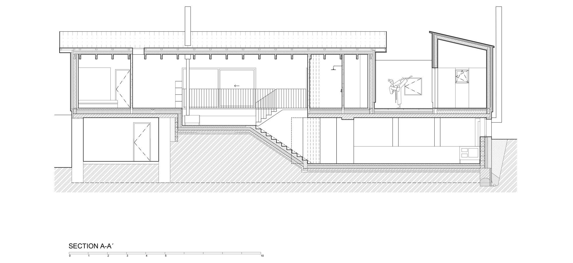 It all started with the clients’ purchase of a house over a hundred years old. The traditional building with a gable roof was at its end. Its stone basement was still in a good condition so we decided to take down the rest of the house and use the stone socle in the basement as a foundation for the new house. The courageous and somewhat risky plan worked out and today, the clients live in a beautiful, modern house which combines the historical soul of its predecessor and nordic esthetics with a touch of industrial style. The lot borders a busy road which serves as a starting point for tourists heading to the Jizera Mountains. Because of this we designed a new concrete wall in place of the former exterior wall of the old house. This will not only decrease the amount of noise from the nearby road but also define the outside entrance area to the house. Behind the wall is a small yard with a view of Ještěd which serves as a guidepost between the entrance, the guest house and the stairs to the yard below. The construction of the new part is wooden. The asphalt roof together with the black, tar-painted facade reminds us of the shed that used to stand here. On the old stone foundation behind the concrete wall are actually two houses; a family house and a small guest house for a young sailor, the clients’ son, who spends most of the year at the helm of transatlantic ships. The parents’ house is more complicated as its building design had to encompass the needs of three different people - a friendly couple and their daughter. The wooden addition above the basement ceiling consists of bedrooms, an office, a bathroom with a toilet and an outdoor yard with a sauna. The living space of the house is defined by large windows on both sides. The window on the southwest facade brings the view of the Harcov stream valley and Ještěd while the north window shows the previously mentioned sauna yard. A couple of steps lower is a living room stairhead with a fireplace and a wide staircase to the kitchen and dining room which are connected to the patio. The rest of the basement is used as a utility room and storage space.