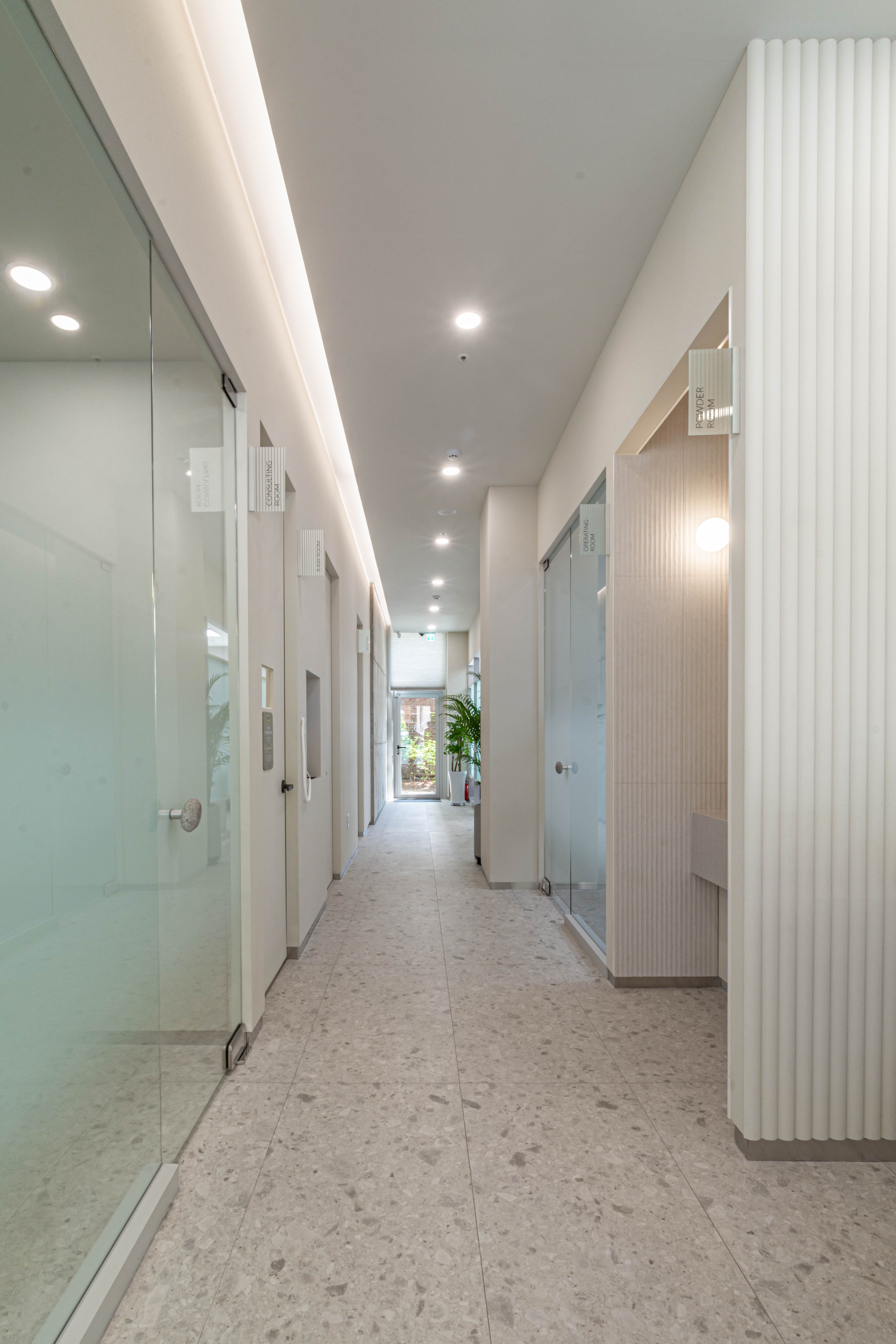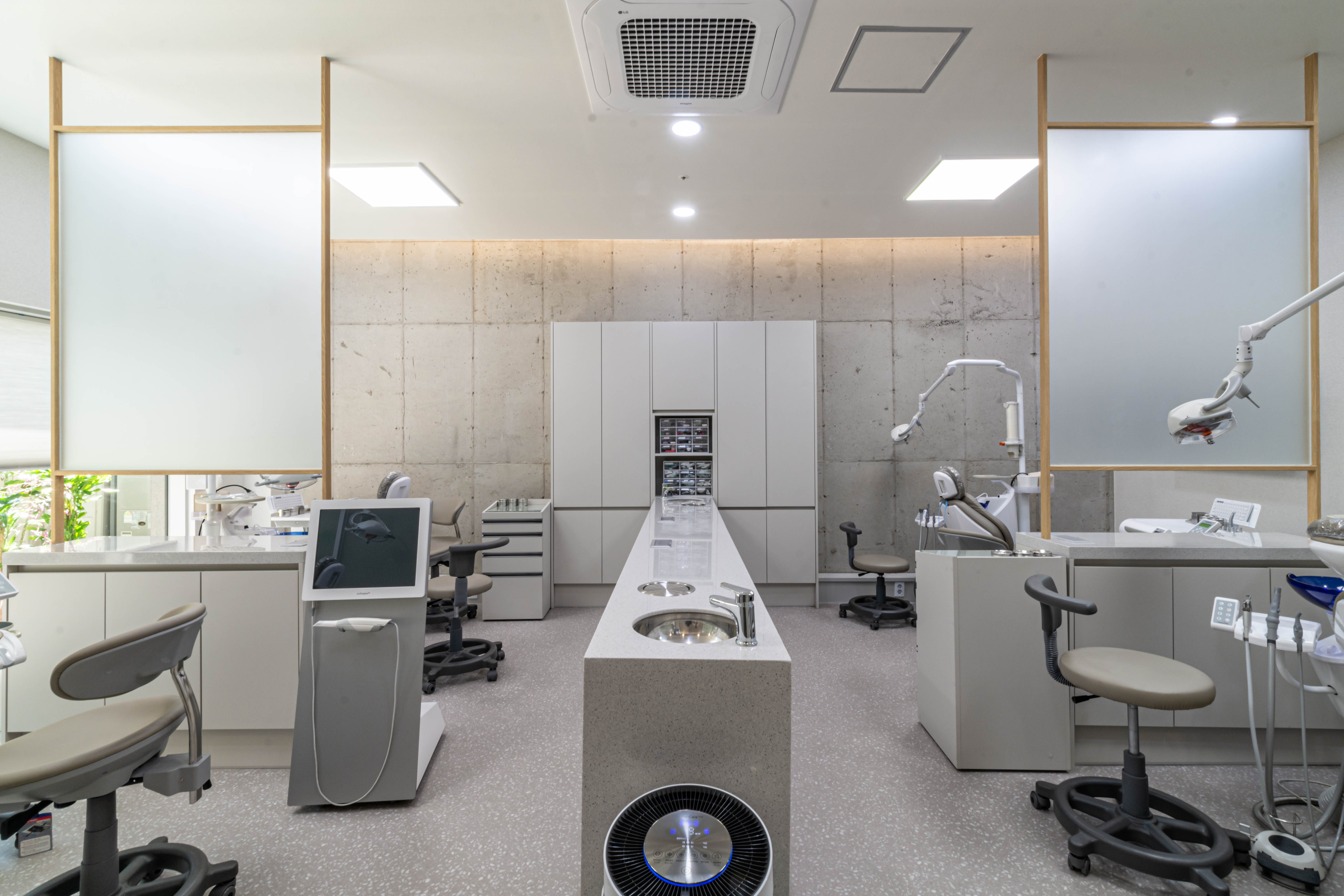 Gilton Dental Clinic wanted to comfortably change the perception of the patients coming to the clinic that the dentist’s is a scary place where the treatment is uncomfortable. Making the most of the building’s benefits, the plan was designed to allow the garden of the building located in the back to be actively seen from the treatment room. The rooms were composed in consideration of the lighting aspect within a corridor-type composition to allow abundant natural light to enter the treatment room and the clinic. The space was designed to be able to present the combination of natural wood and ready-made materials in a more natural and bright mood as much as possible by exposing the existing concrete frame of the building, etc. The texture was vertically repeated to emphasize the high floor height of the space, and the contrast of the linear and facial elements were planned to be able to add to the depth of the space. This was a clinic project that considered even the smallest details for a comprehensively comfortable and pleasant treatment, from branding to the space and online image.