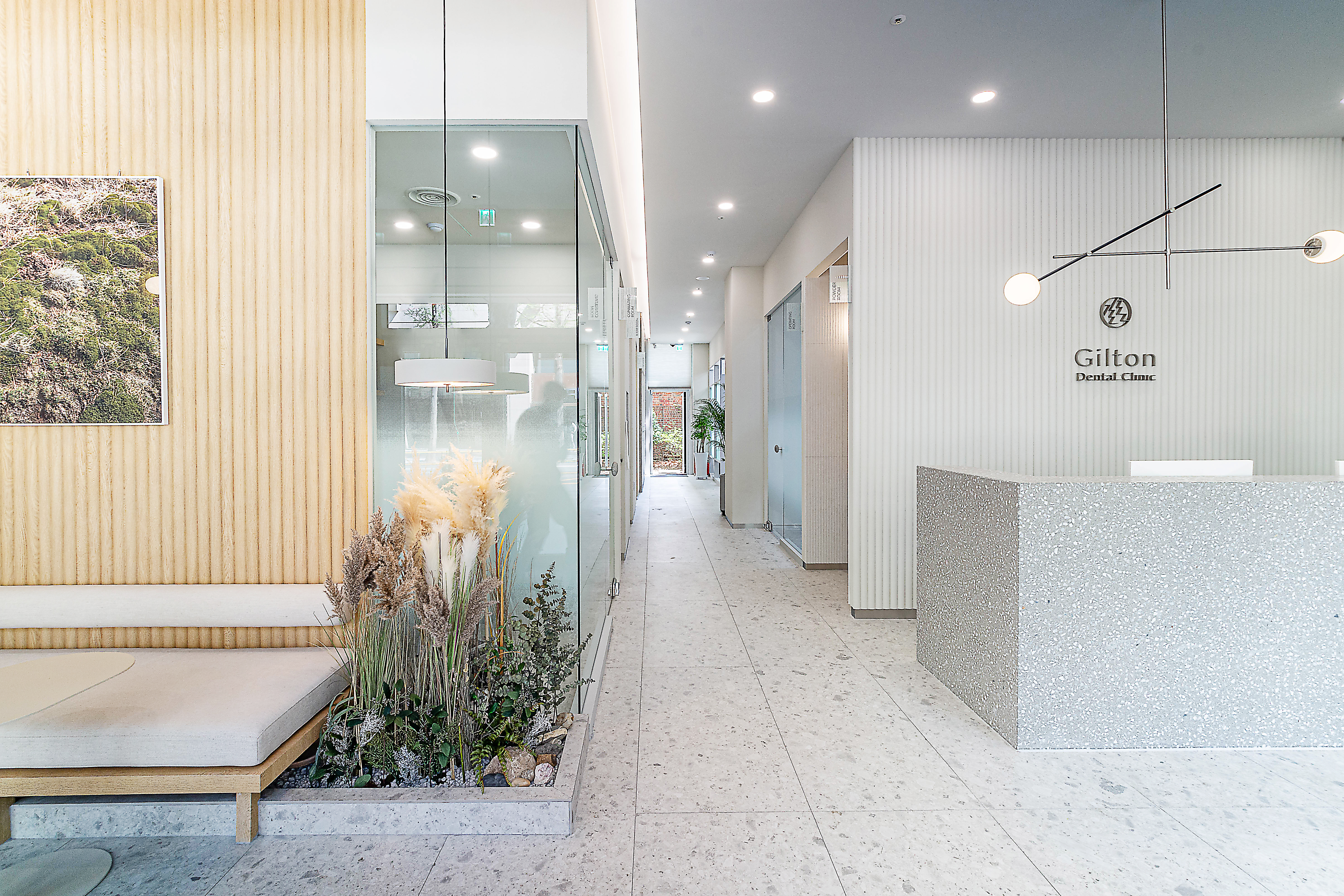 길튼 치과는 병원에 오는 환자가 치과는 무섭고 진료가 불편하다는 인식을 보다 편안하게 바꿔 주기를 바랐다. 치과가 위치한 건물의 장점을 십분 활용하여 후방에 위치한 건물의 정원이 진료실에서 적극적으로 보일 수 있도록 평면구성이 이뤄졌다. 자연광이 진료실과 병원 내부에 풍부하게 들어올 수 있도록 복도식 구성에서 채광적인 측면을 고려하여 실구성을 했다. 건물의 기존의 콘크리트 골조를 노출시키는 등 최대한 목재 자연재와 기성재의 물성의 조합을 보다 자연스럽고 화사한 무드로 연출할 수 있도록 디자인됐다. 수직적으로 텍스쳐를 반복 노출하여 공간의 높은 층고를 더욱 강조했으며, 선적인 요소와 면적인 요소의 콘트라스트는 공간의 깊이감을 더할 수 있도록 기획되었다. 브랜딩부터 공간, 온라인 이미지까지 종합적으로 편안하고 기분 좋은 진료를 위해 작은 부분까지 고려한 병원 프로젝트다.