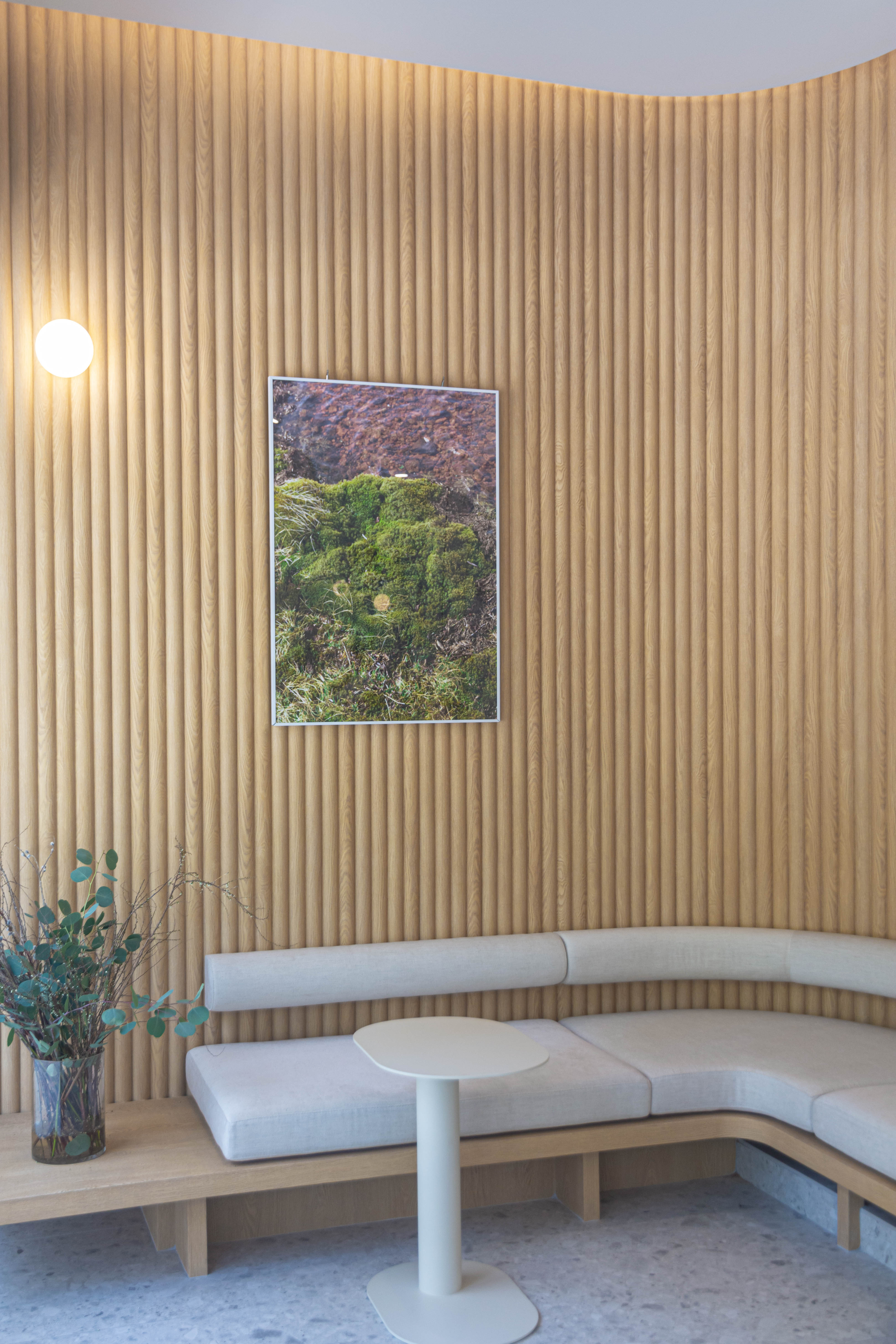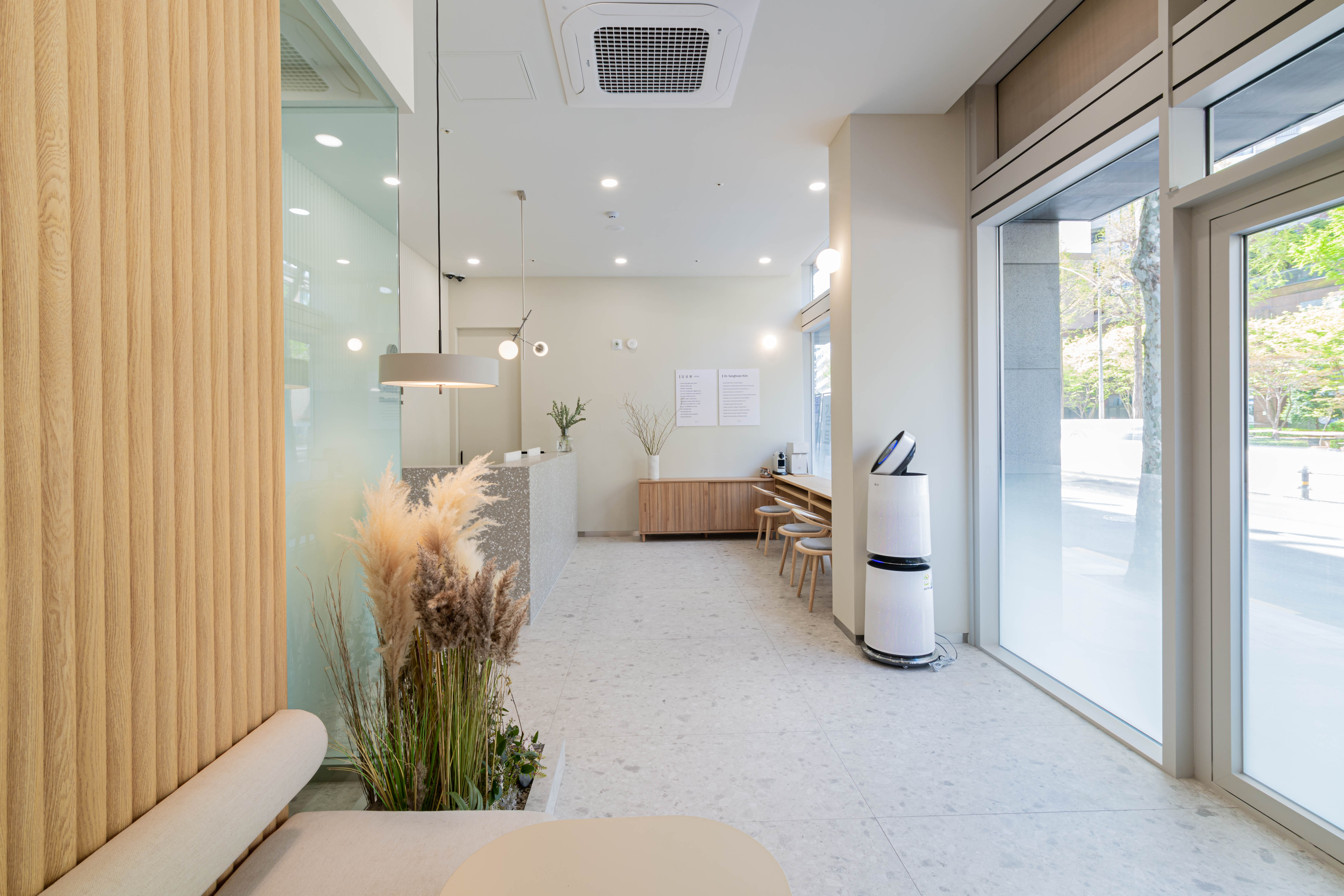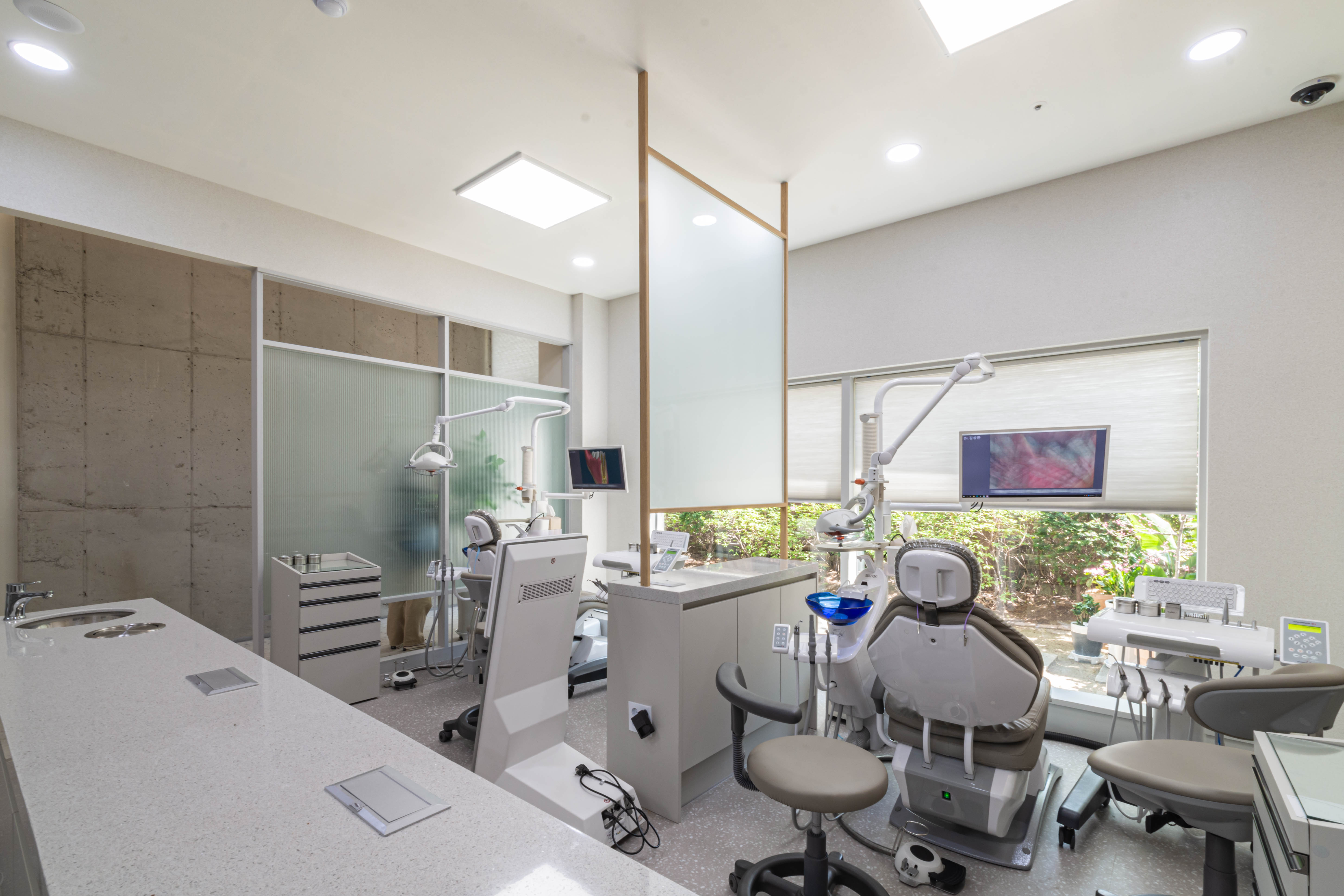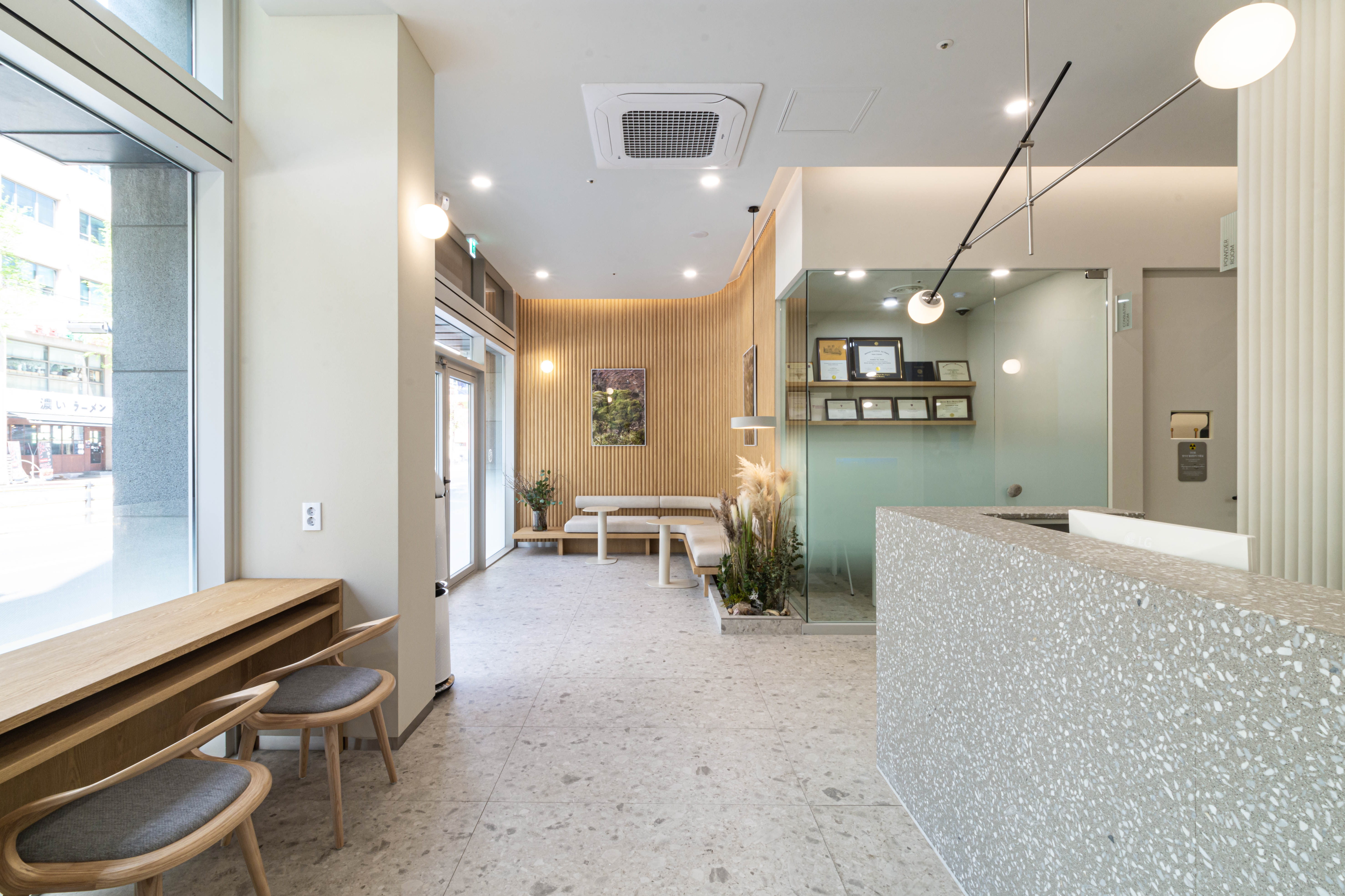 Gilton Dental Clinic wanted to comfortably change the perception of the patients coming to the clinic that the dentist’s is a scary place where the treatment is uncomfortable. Making the most of the building’s benefits, the plan was designed to allow the garden of the building located in the back to be actively seen from the treatment room. The rooms were composed in consideration of the lighting aspect within a corridor-type composition to allow abundant natural light to enter the treatment room and the clinic. The space was designed to be able to present the combination of natural wood and ready-made materials in a more natural and bright mood as much as possible by exposing the existing concrete frame of the building, etc. The texture was vertically repeated to emphasize the high floor height of the space, and the contrast of the linear and facial elements were planned to be able to add to the depth of the space. This was a clinic project that considered even the smallest details for a comprehensively comfortable and pleasant treatment, from branding to the space and online image.