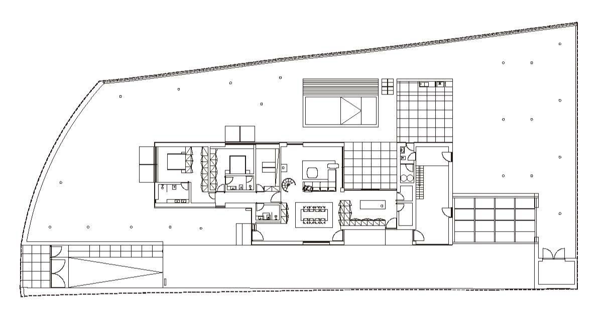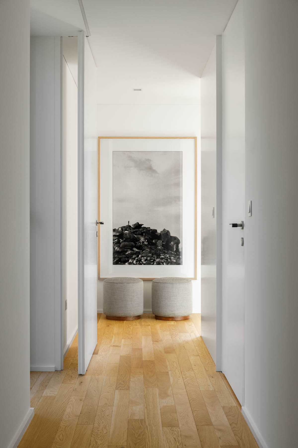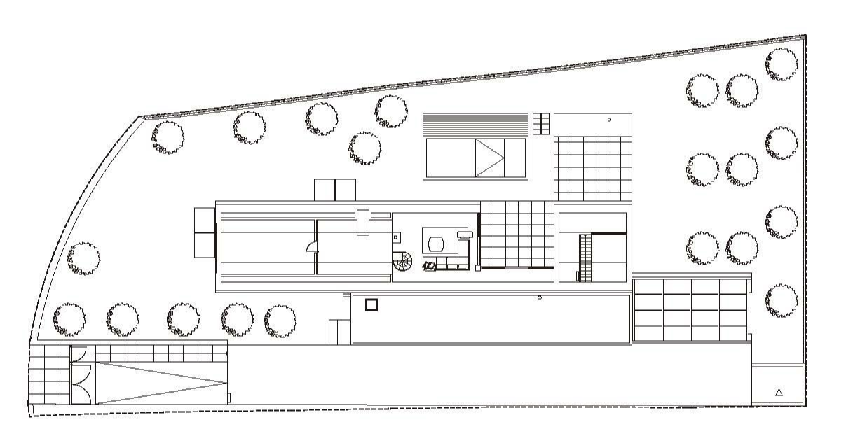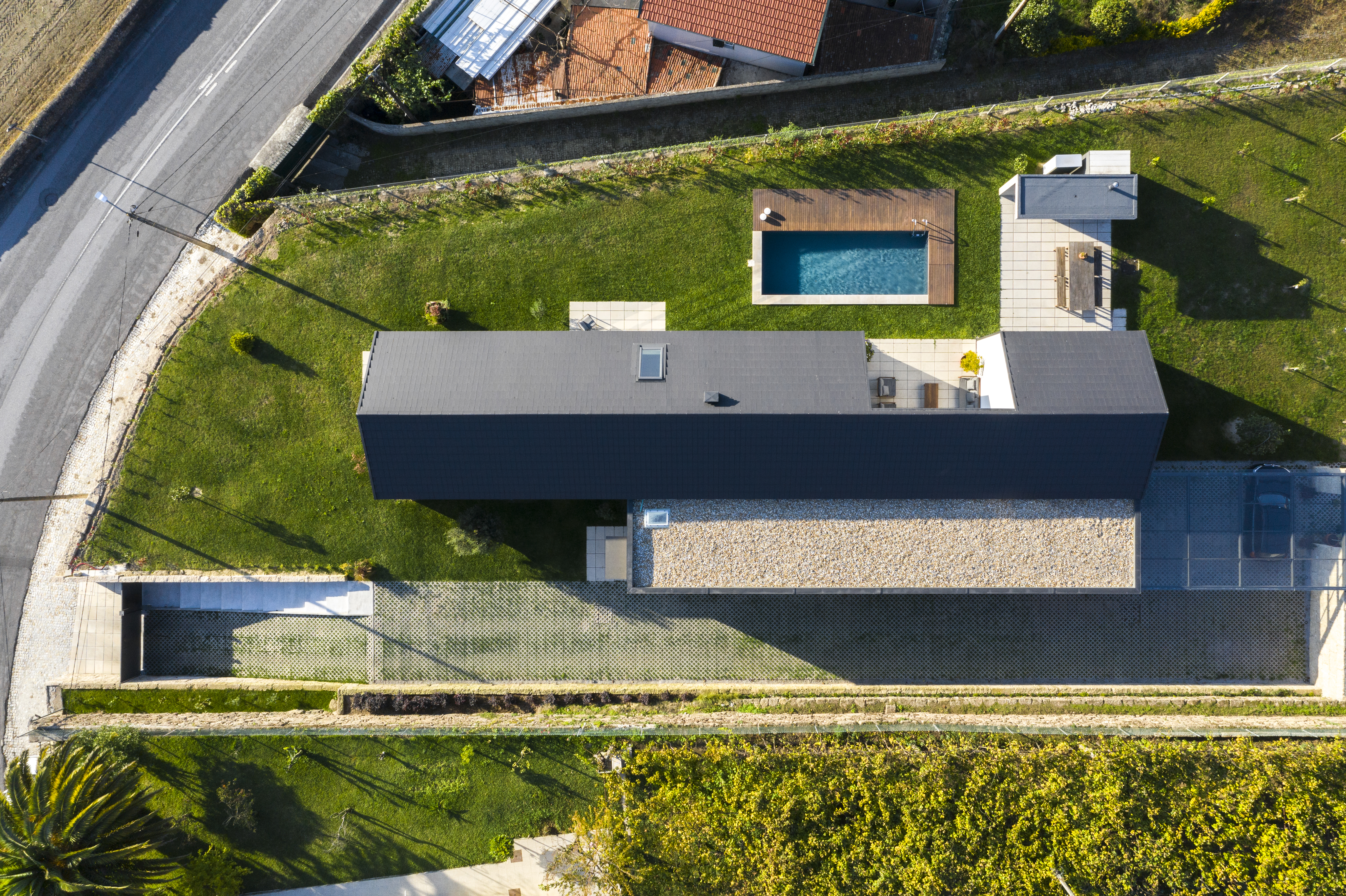 Santo Tirso House is located on a small hill, with a dark silhouette in sharp contrast to its natural environment, offering a wide view over Santo Tirso. The architect defined a northeast-southeast axis in the longitudinal direction of the land and oriented in the best view of the place. And in this linear orientation, the main volume is arranged, in a playful reconfiguration of the traditional house, it becomes remarkable in the landscape. The volume departs from the entrance of the lot to create a kind of external decompression atrium. In terms of the program's distribution, the reception lobby is the first point of contact with the house, leading us to the central and common areas of the house: dining room, living room and kitchen, spacious and generous with lots of natural light promoted by negative space, which is used as the extension of the indoor room to the outside, to the pool and outdoor dining room, taking advantage of the rhythmic play of light in the afternoon. This central block also allows us to separate two spaces that were to be independent: For the south-east, the private area, a corridor distributes the rooms and a small office, all of them with exterior spaces accessible through glass doors that balance the visual and physical connections to the landscape of each room; Over these two areas, the traditional shape of the gable roof allowed the interior spaces to be modeled to complement the nature of the programs, creating a place for reading and studying. Due to the simplicity and relevance of its interior design, with light, minimalist and smooth walls, it offers a peaceful living space. In contrast to the dark exterior, where the black plant tile and the pine together with the simple shape of the building create a striking graphic silhouette against the landscape. On the whole, through the juxtaposition of its facade materials, the architect get closer to the natural, the beautiful, where we hope that its inhabitants are happy.