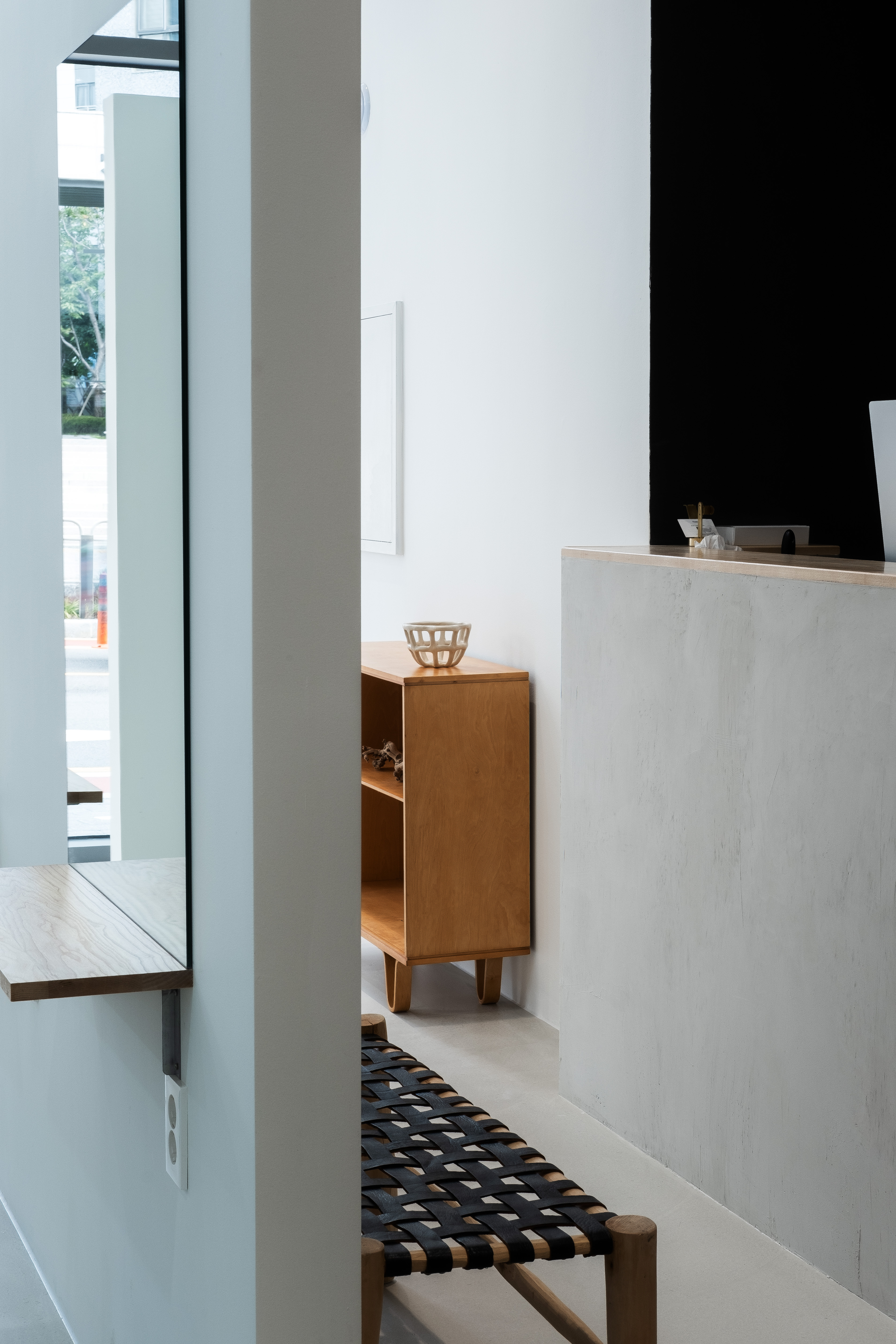 Outline hair is a lifestyle select shop and hair salon located in Sinsu-dong. When planning the floor plan, the client wanted a space to make hair dye as well as a private treatment space where the beauty appliances are not visible. First, the front area of the store was used as a customers’ space, and naturally, the remaining space in the back was planned to be used as an employees’ space. In addition, to form a private treatment space, a wall was placed facing the full glass window of the building, and the middle space was used as a waiting area. The opening and the low height of the wall were made to prevent it from seeming stifling. Furthermore, a sliding wall was applied to the space for storing the beauty appliances and was finished with metal to become an accent feature of the space.