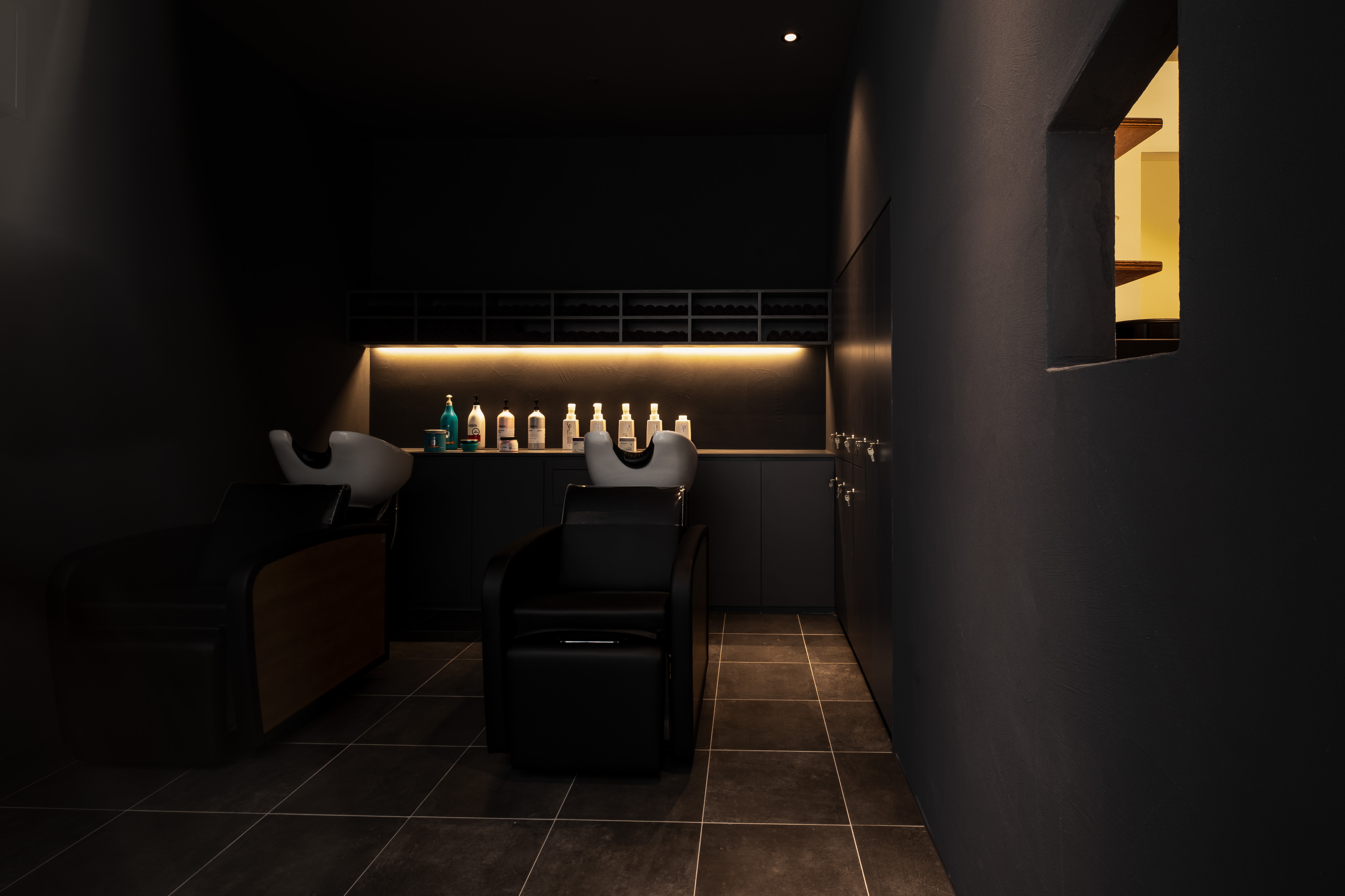 Since we believed that a hair salon was a background space that contains the different hairstyles of customers, we chose monotone colors for outline hair. However, we wanted the shampoo room to be cozy and comfortable unlike other spaces. Therefore, the shampoo room’s ceiling height was intentionally lowered and was finished with dark tones. The lighting was also planned to be dark. As the unique structure and sense of space harmonize with the vintage furniture and small decorations personally selected by the client, outline hair has been completed as a space that provides various spatial experiences to customers.