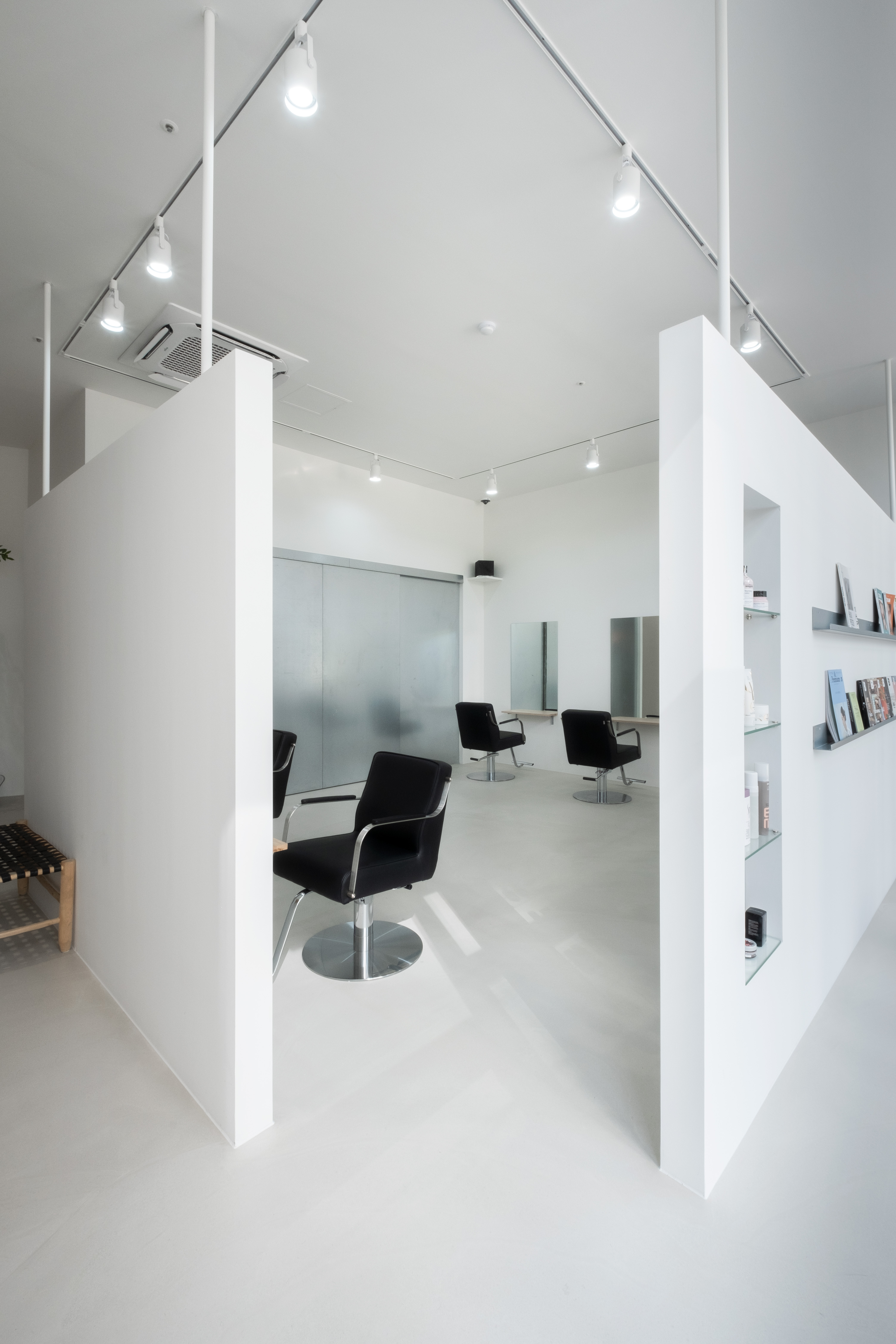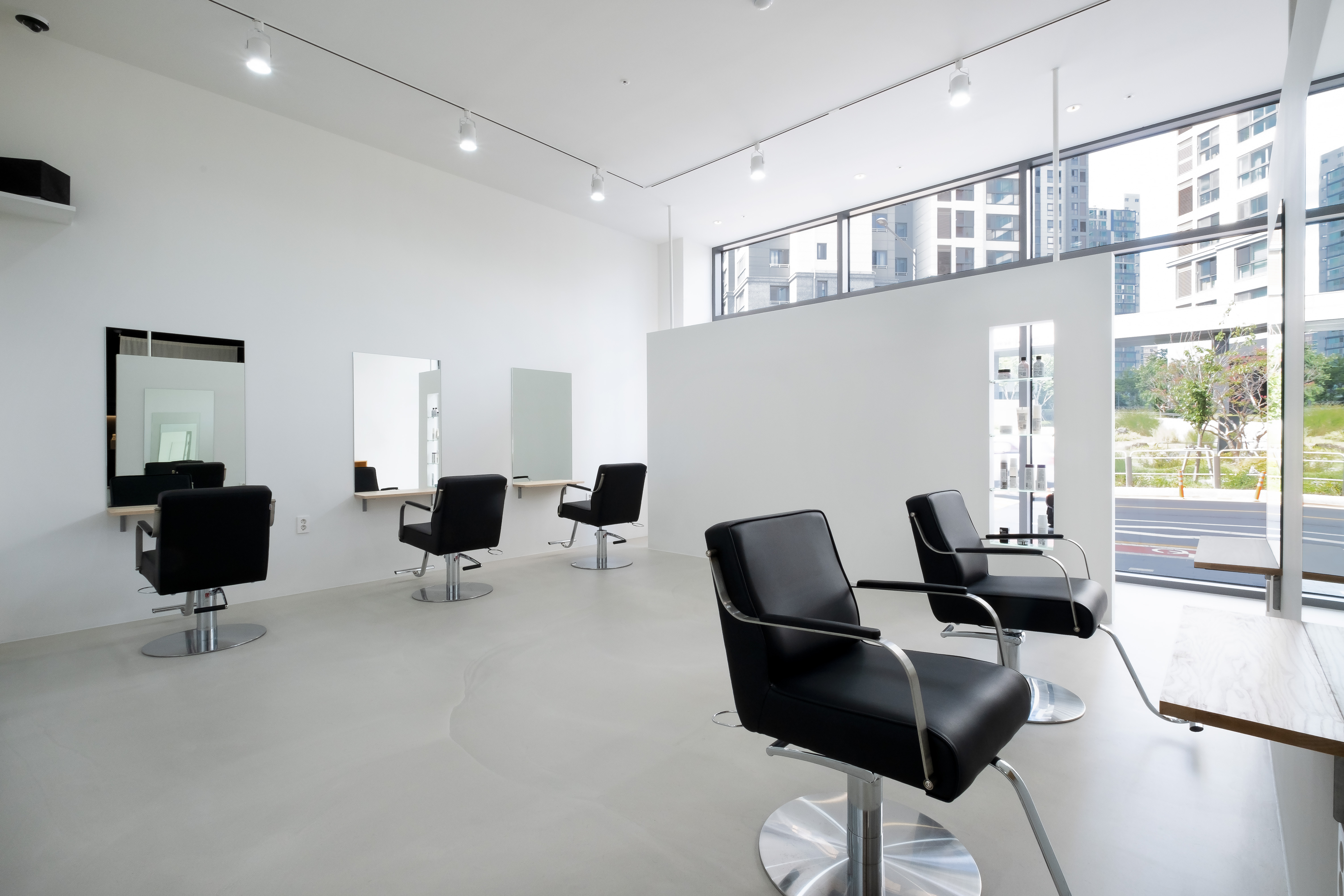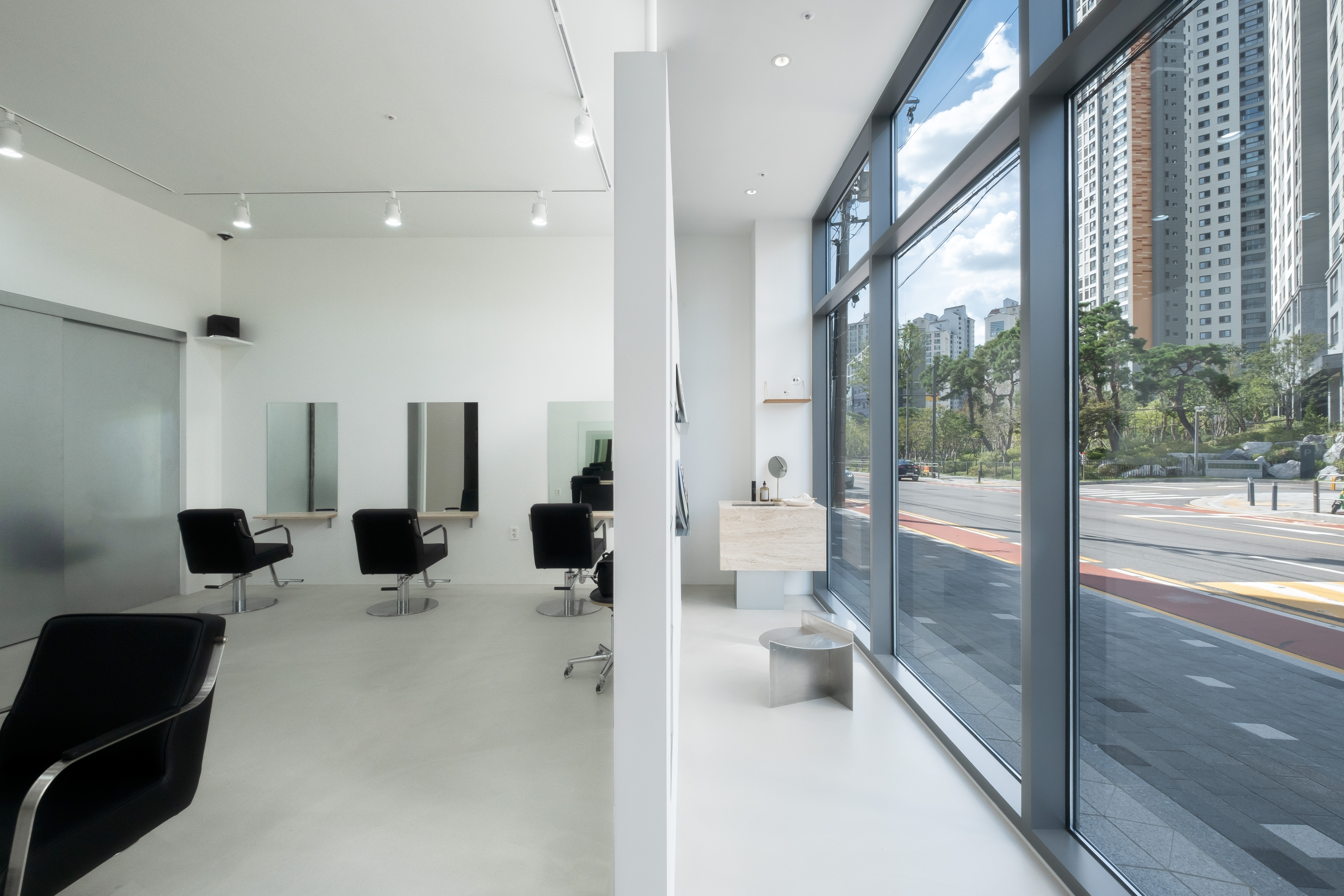 Outline hair is a lifestyle select shop and hair salon located in Sinsu-dong. When planning the floor plan, the client wanted a space to make hair dye as well as a private treatment space where the beauty appliances are not visible. First, the front area of the store was used as a customers’ space, and naturally, the remaining space in the back was planned to be used as an employees’ space. In addition, to form a private treatment space, a wall was placed facing the full glass window of the building, and the middle space was used as a waiting area. The opening and the low height of the wall were made to prevent it from seeming stifling. Furthermore, a sliding wall was applied to the space for storing the beauty appliances and was finished with metal to become an accent feature of the space.