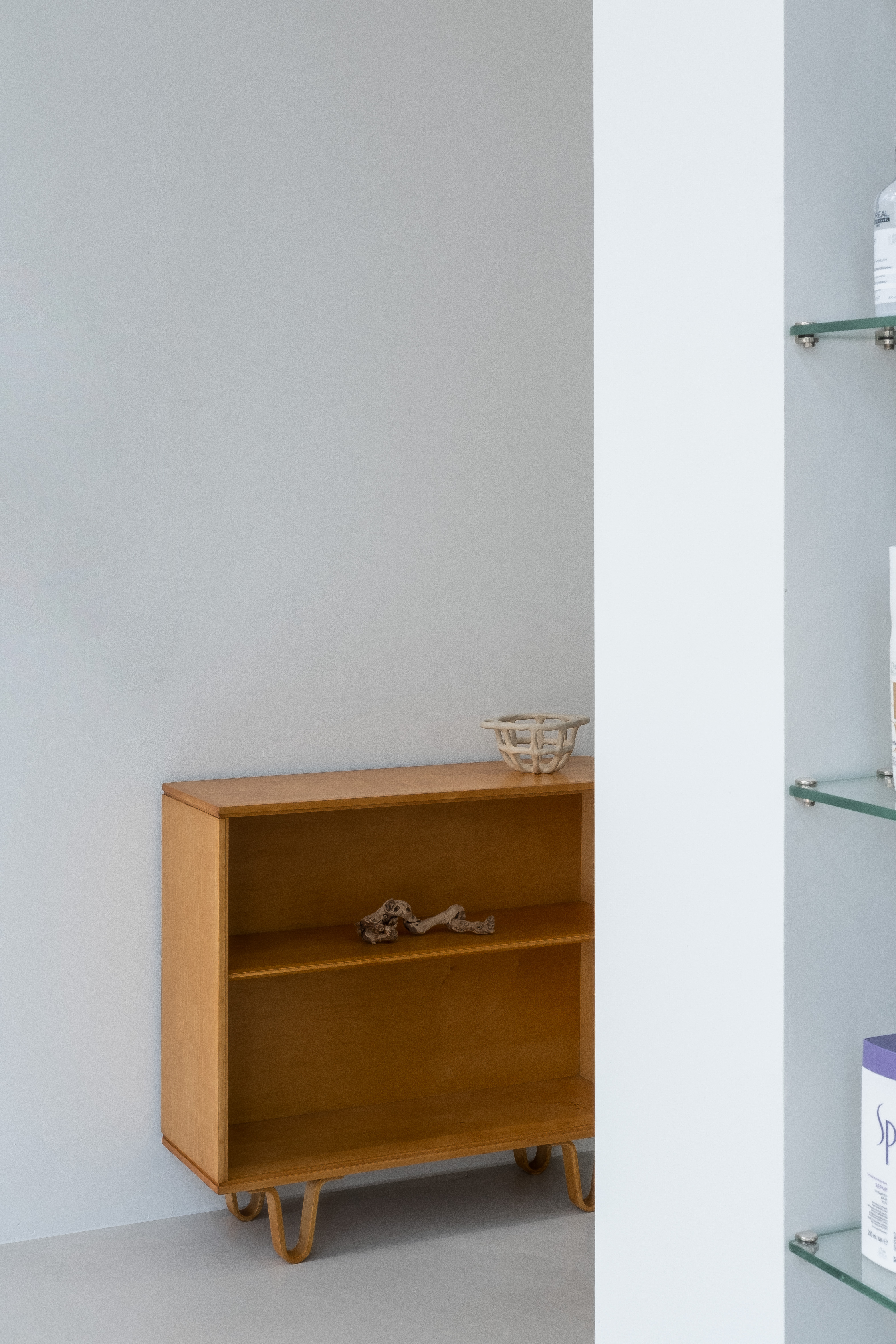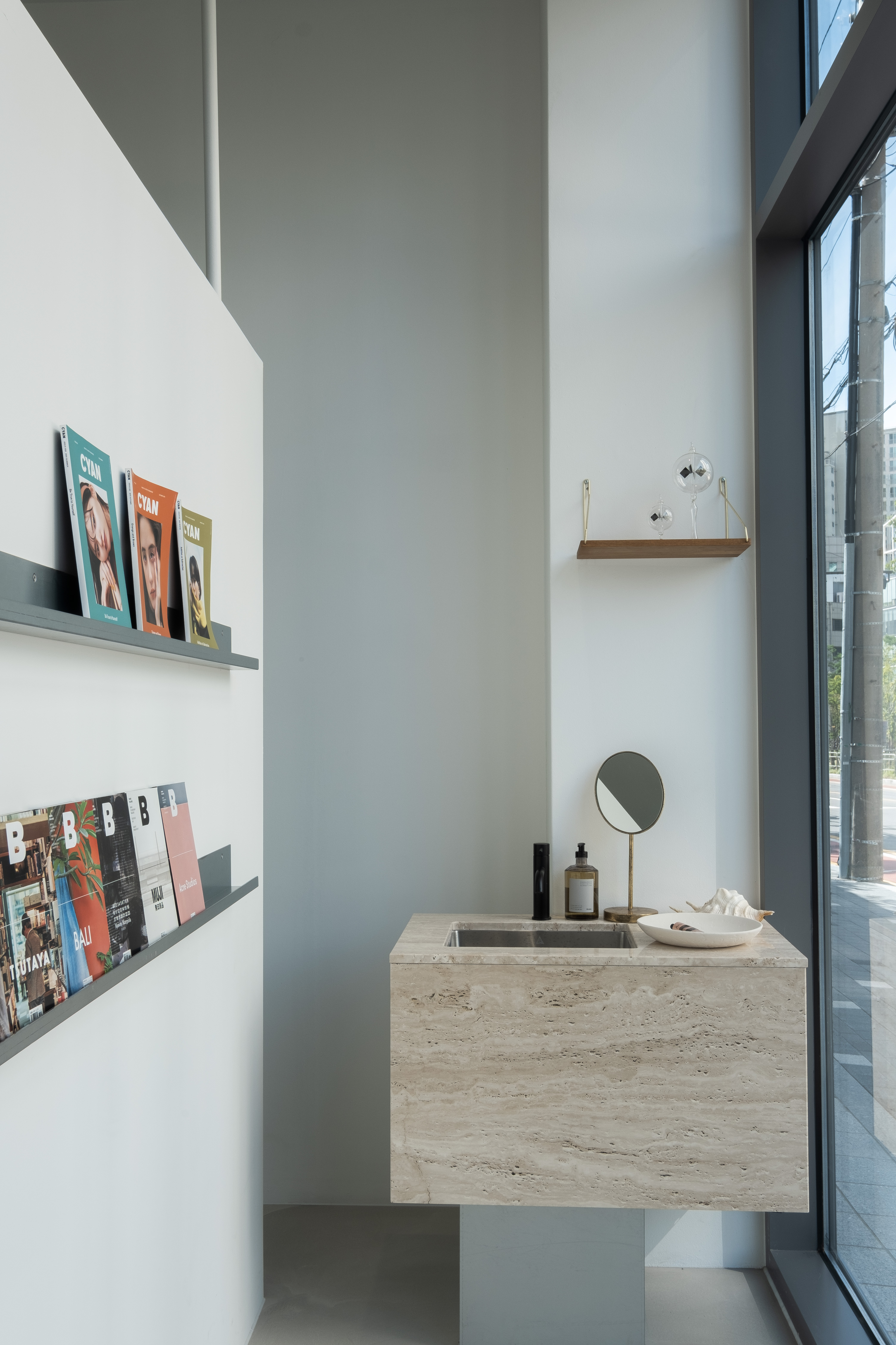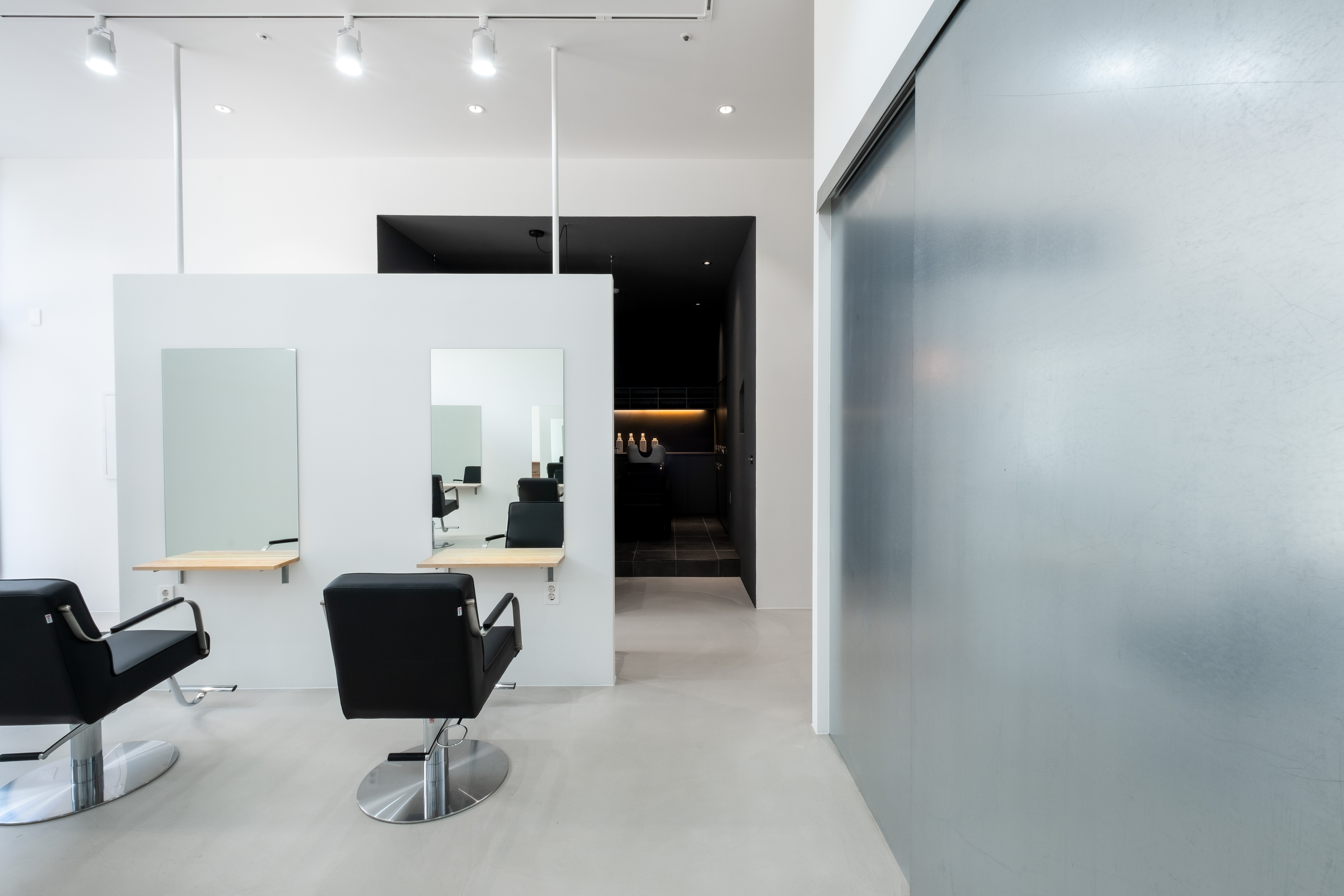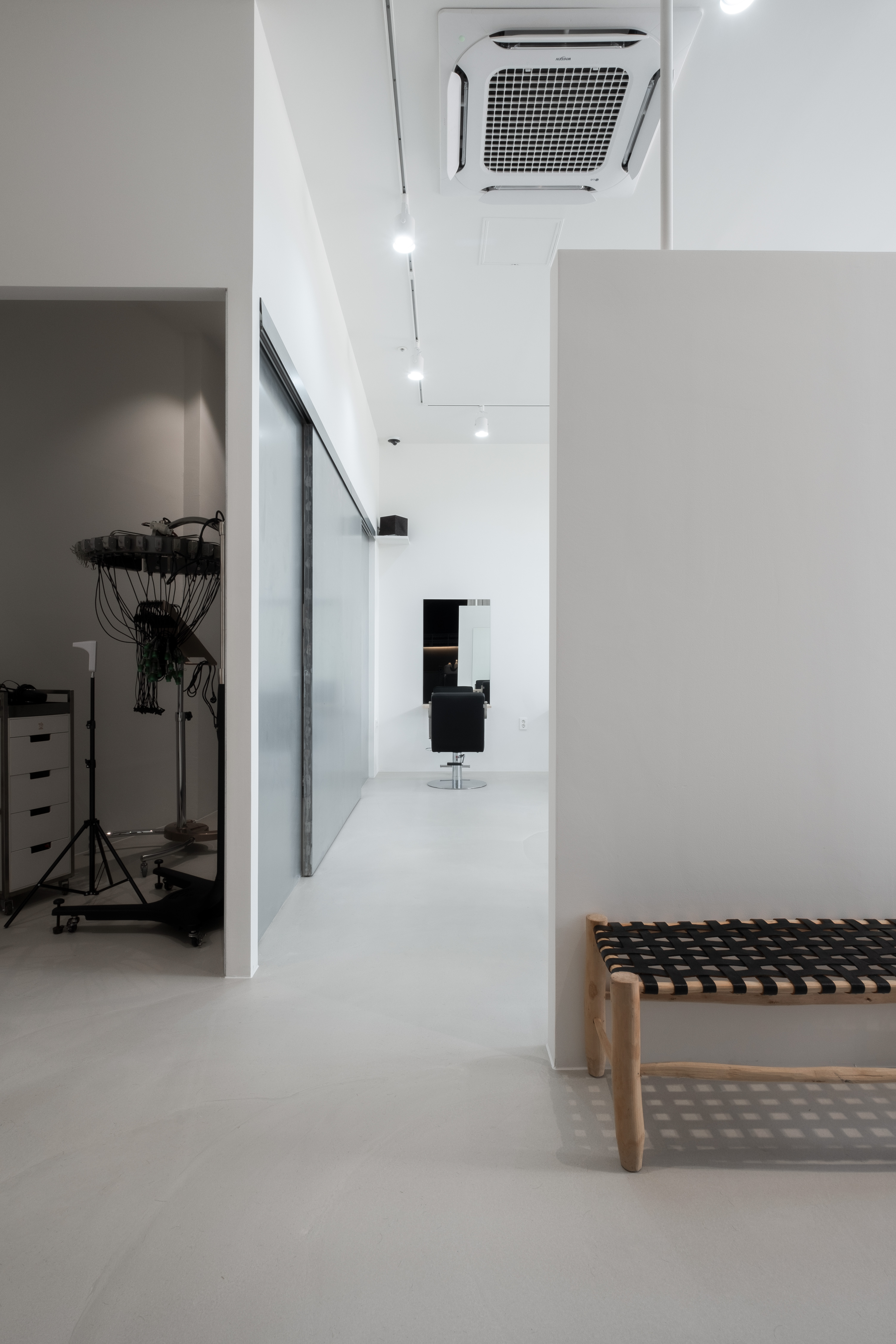 Outline hair is a lifestyle select shop and hair salon located in Sinsu-dong. When planning the floor plan, the client wanted a space to make hair dye as well as a private treatment space where the beauty appliances are not visible. First, the front area of the store was used as a customers’ space, and naturally, the remaining space in the back was planned to be used as an employees’ space. In addition, to form a private treatment space, a wall was placed facing the full glass window of the building, and the middle space was used as a waiting area. The opening and the low height of the wall were made to prevent it from seeming stifling. Furthermore, a sliding wall was applied to the space for storing the beauty appliances and was finished with metal to become an accent feature of the space.