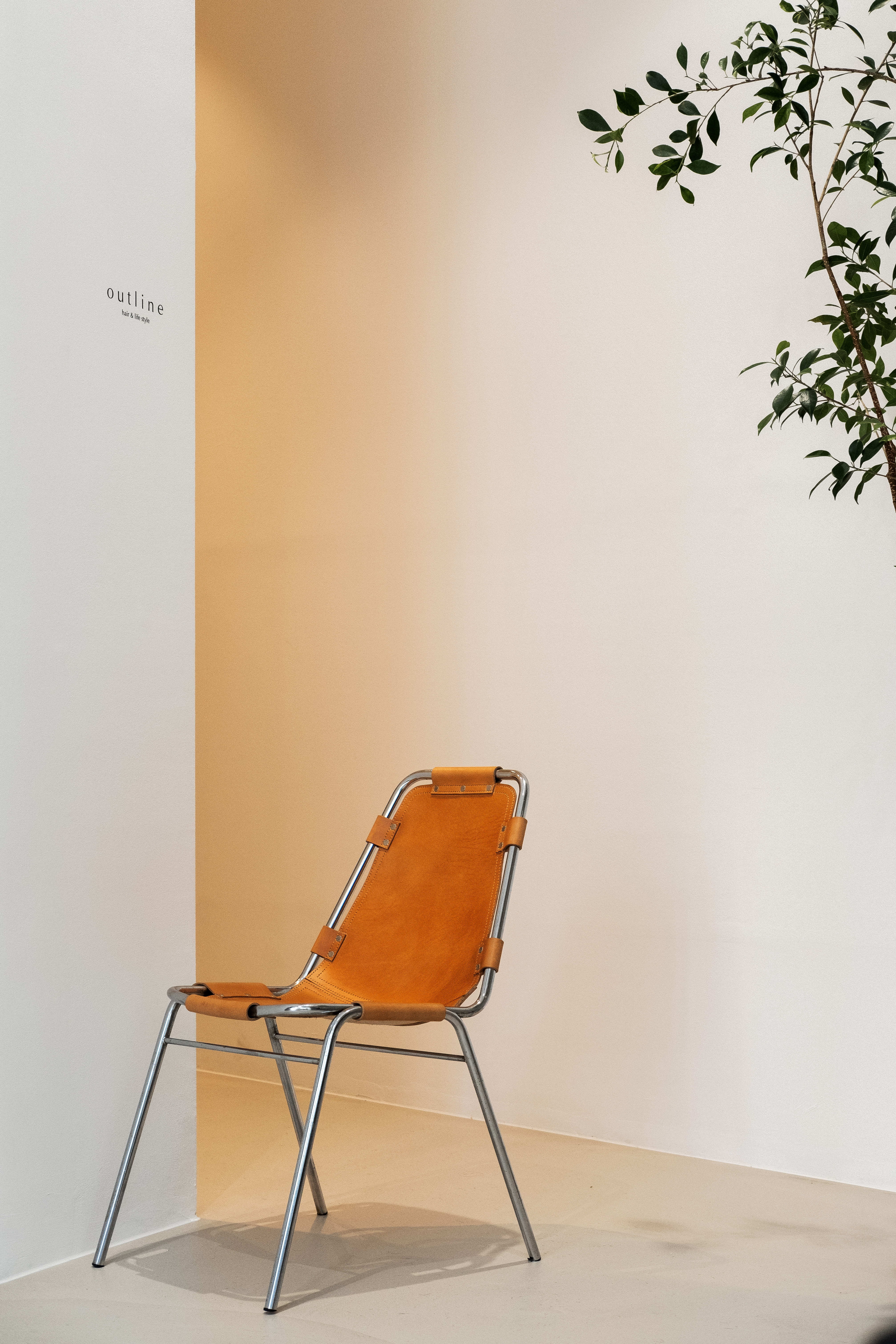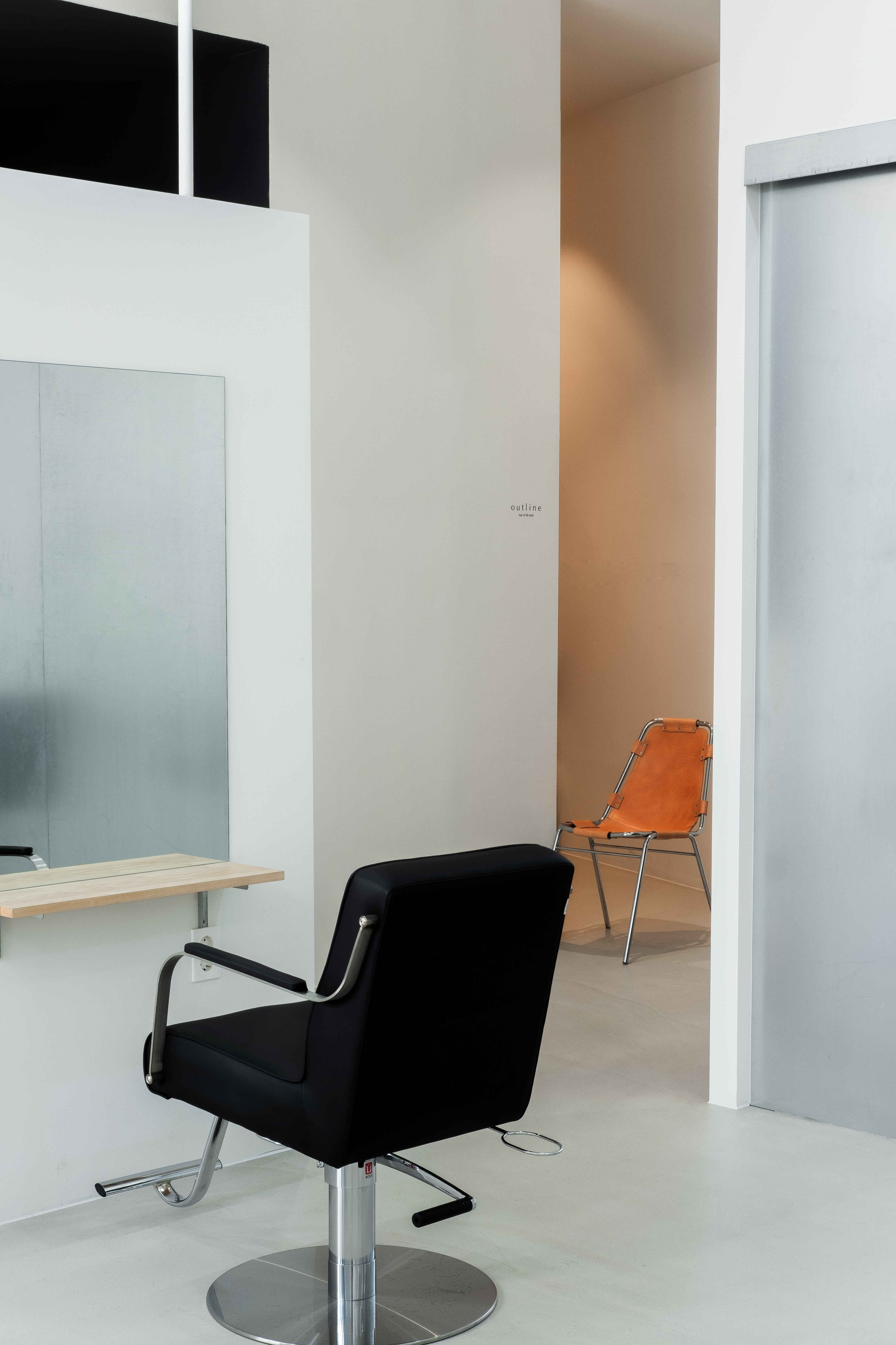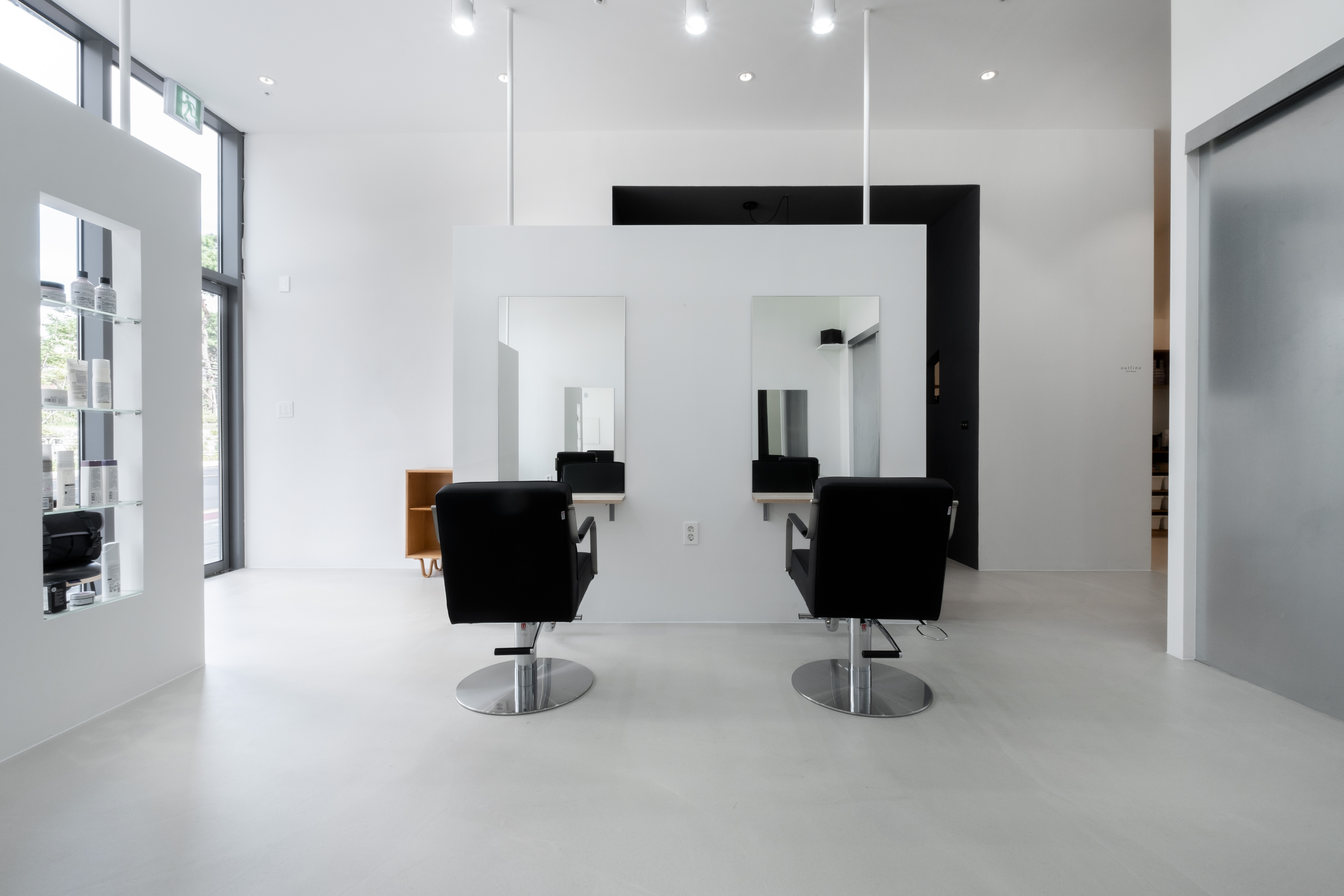 아웃라인 헤어는 신수동에 위치한 라이프스타일 편집숍이자 미용실이다. 건축주는 평면 구성 당시 염색약을 제조하는 공간과 미용기구들이 보이지 않는 것과 프라이빗한 시술 공간을 원했다. 먼저 매장의 앞부분은 고객 공간으로 활용하고, 자연스럽게 남은 뒷공간을 직원 공간으로 쓰는 평면구성을 계획했다. 또한 프라이빗한 시술 공간을 위해 건물의 통유리창을 마주하는 벽체를 구성했고 가운데 공간은 대기공간으로 활용했다. 벽체에 개구부를 낸 것과 벽체의 높이를 낮게 적용한 건 시선이 답답하지 않게 하기 위함이었다. 그리고 미용기구들을 보관하는 공간은 편의를 위해 슬라이딩 벽체로 적용했고 공간의 포인트가 될 수 있도록 금속으로 마감했다. 미용실은 고객들의 다양한 헤어를 담는 배경이 되는 공간이라고 생각했기에 전체적으로 모노톤의 색상을 선택했다. 하지만 샴푸실은 다른 공간과 달리 아늑하고 편안하길 바랬다. 때문에 샴푸실은 천장 높이를 의도적으로 낮추었고, 어두운 톤의 색상으로 마감했다. 조도 또한 어둡게 계획했다. 독특한 구조와 공간감, 그리고 건축주가 직접 셀렉해 온 빈티지 가구와 소품까지 어우러져 아웃라인 헤어는 고객들에게 다양한 공간 경험을 제공하는 공간으로 완성되었다.