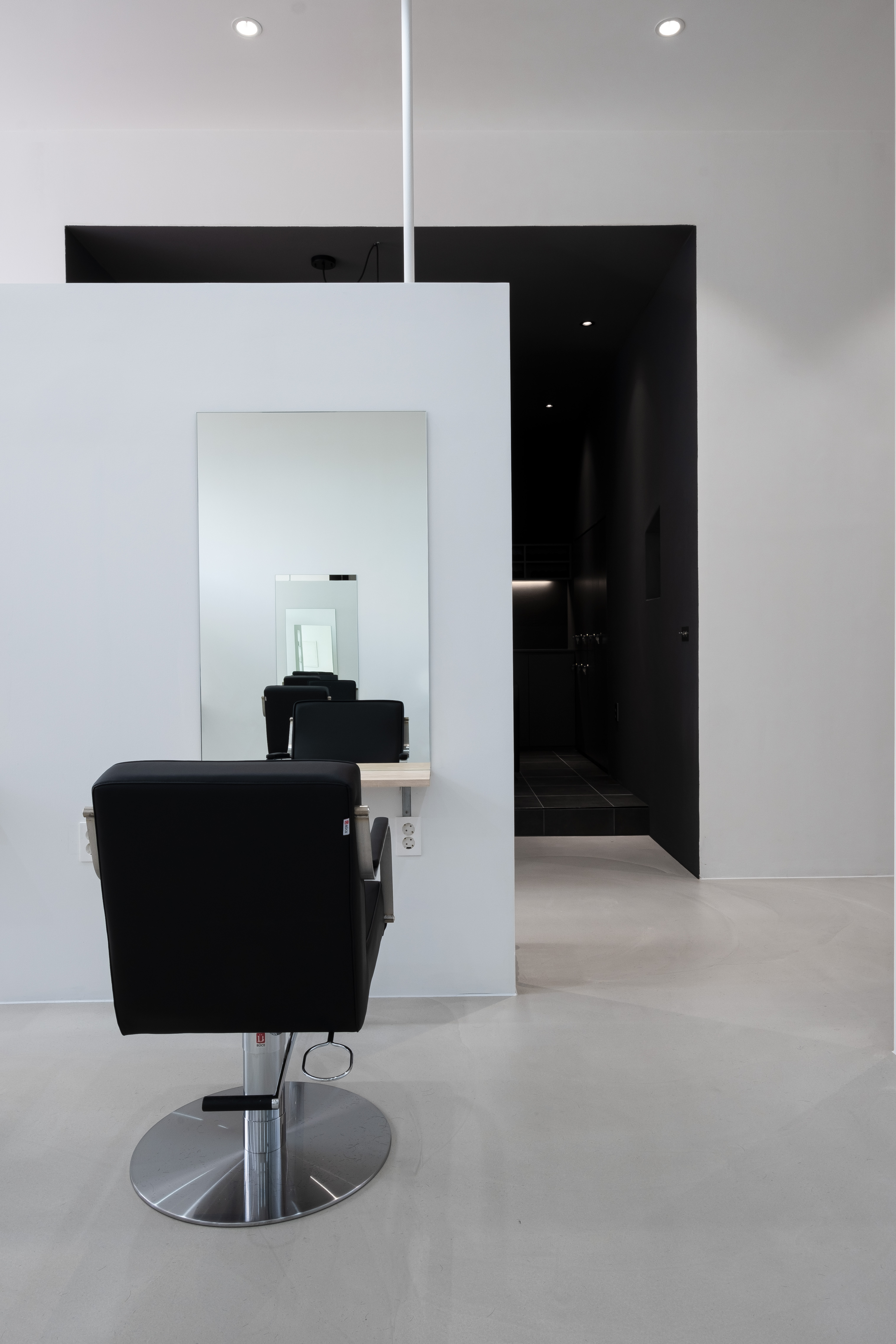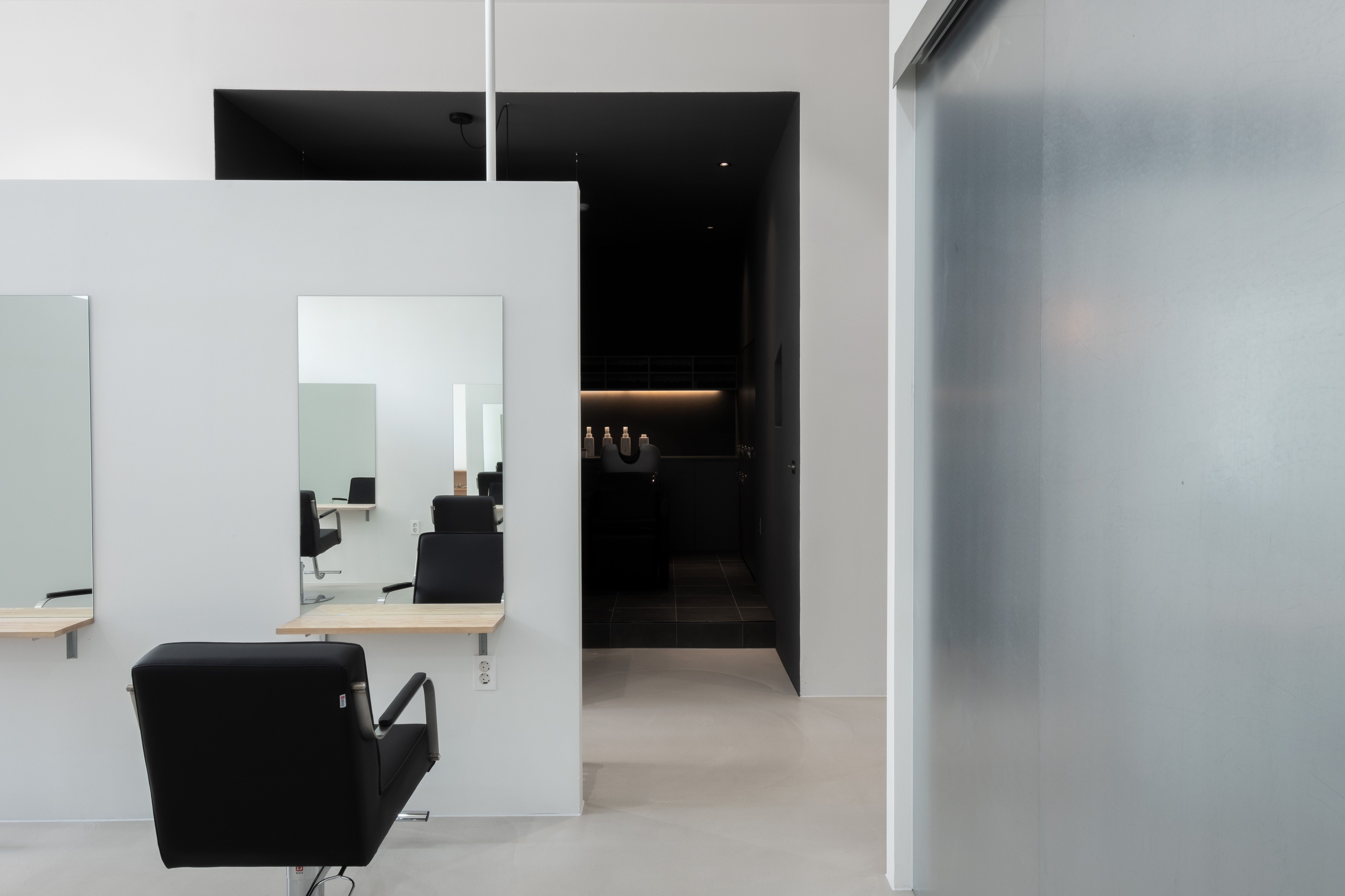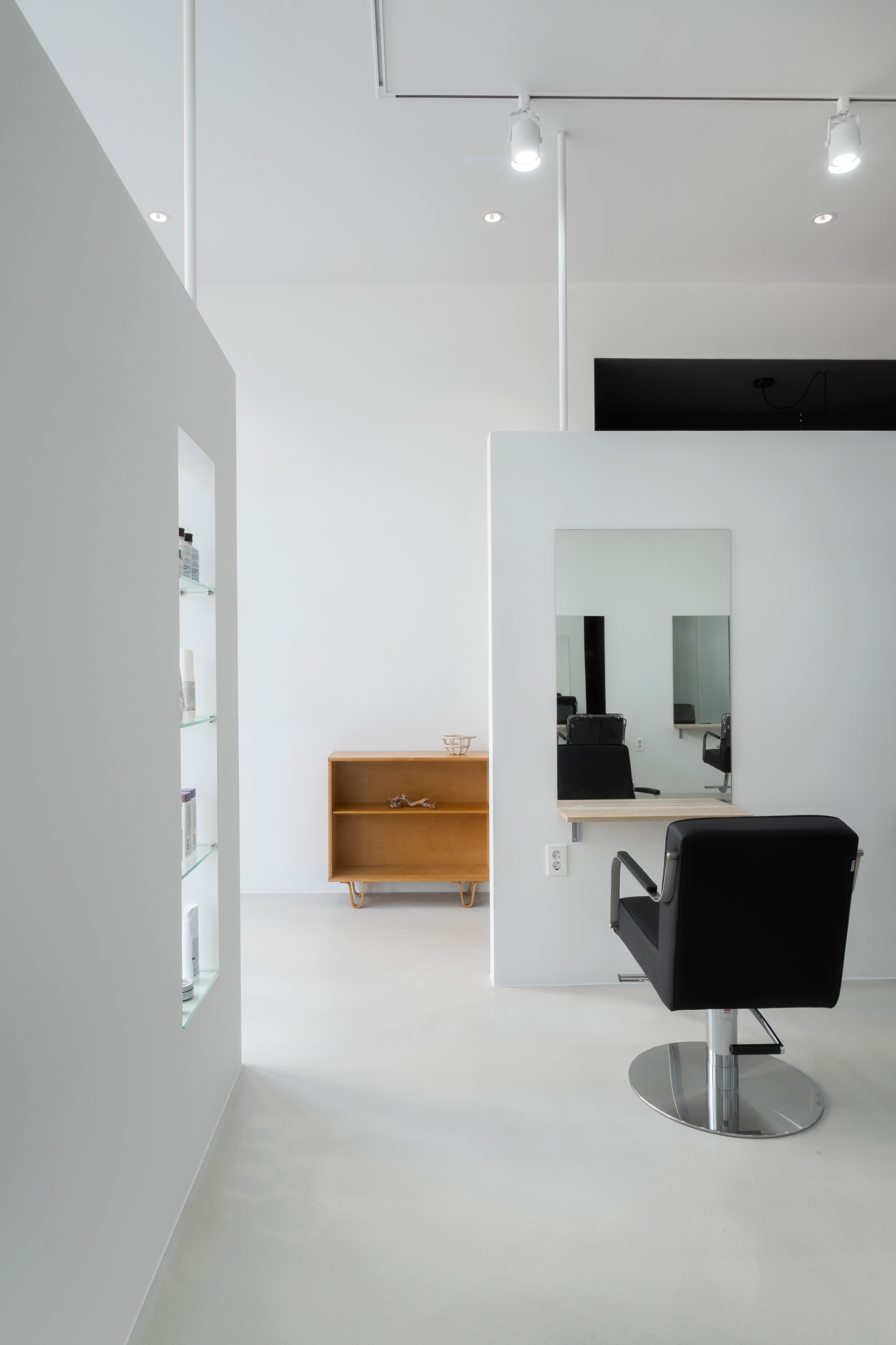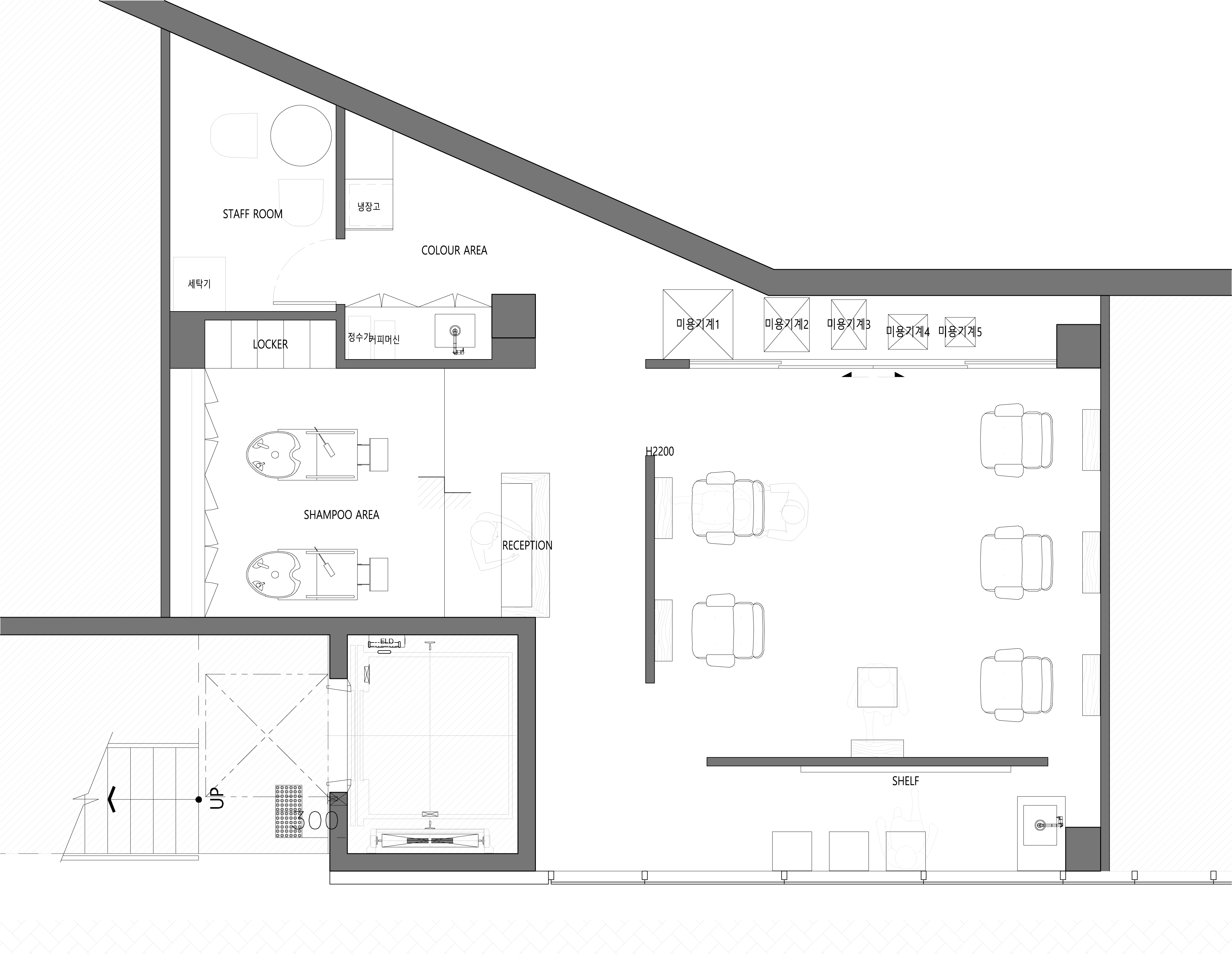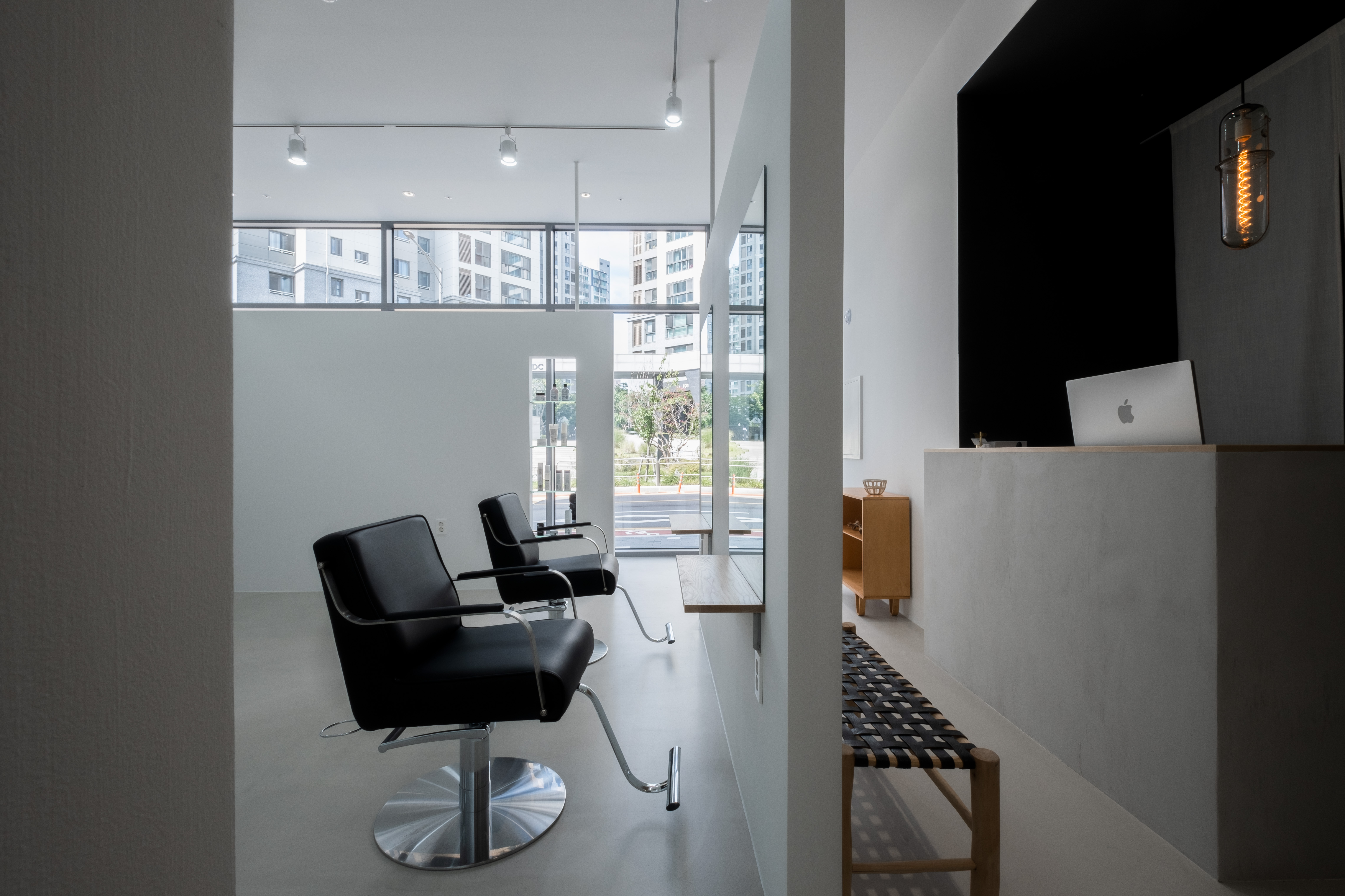 Since we believed that a hair salon was a background space that contains the different hairstyles of customers, we chose monotone colors for outline hair. However, we wanted the shampoo room to be cozy and comfortable unlike other spaces. Therefore, the shampoo room’s ceiling height was intentionally lowered and was finished with dark tones. The lighting was also planned to be dark. As the unique structure and sense of space harmonize with the vintage furniture and small decorations personally selected by the client, outline hair has been completed as a space that provides various spatial experiences to customers.