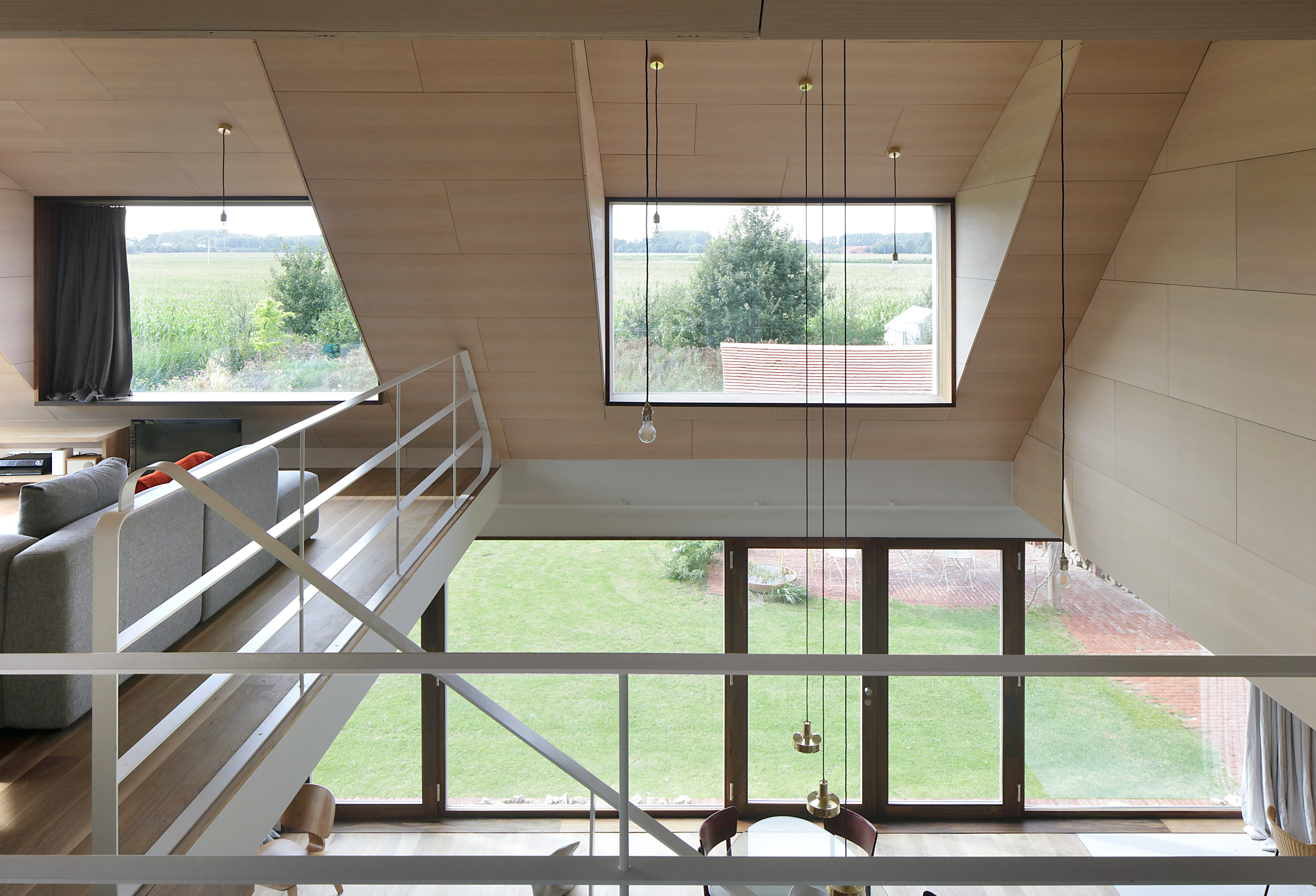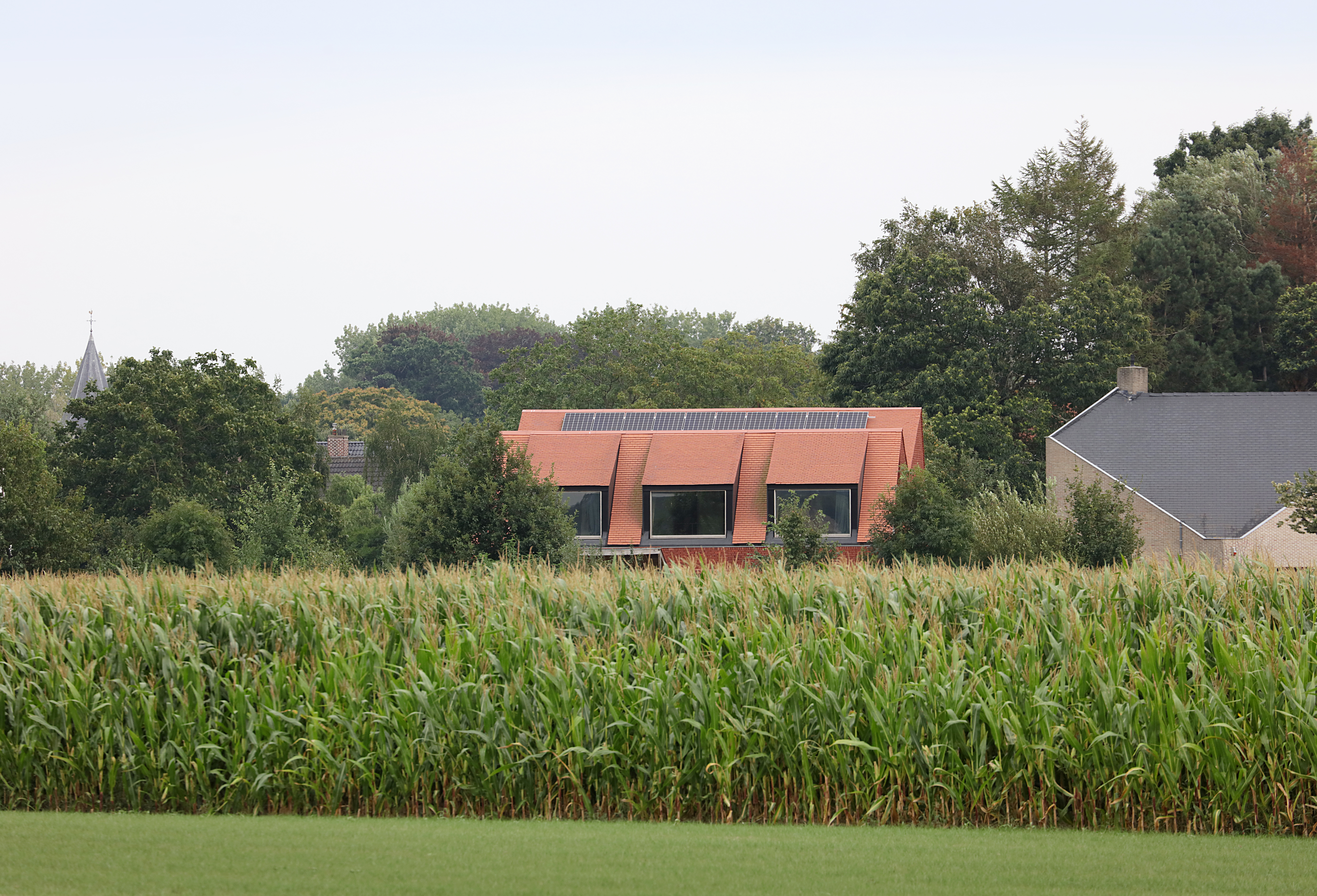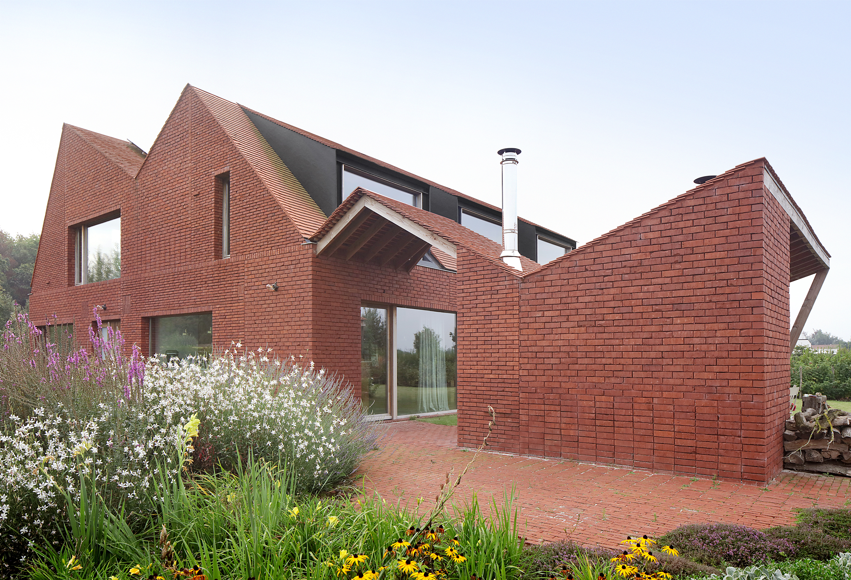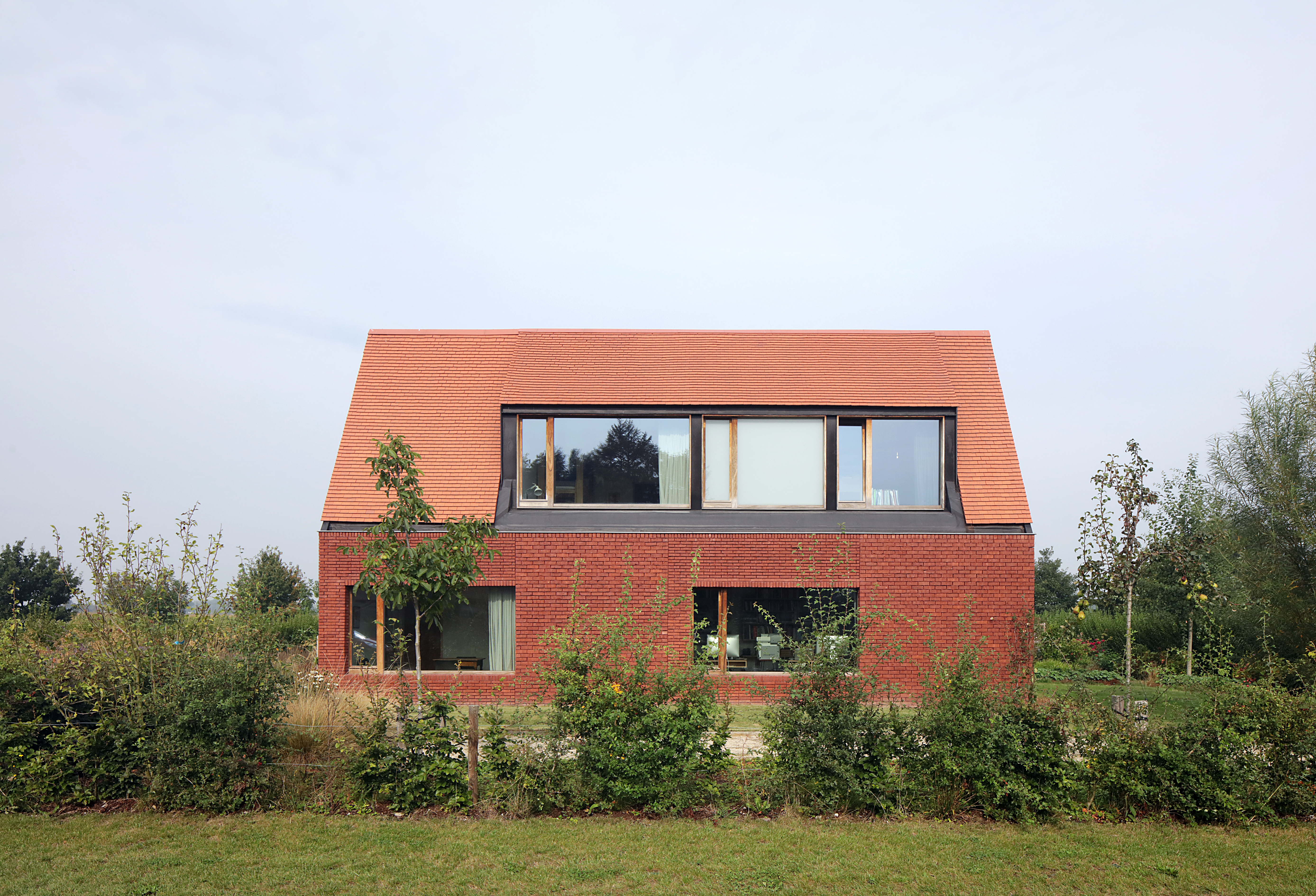A home for family and architectural practice that connects with a typical Flemish landscape. This is done by playing with roof slopes, materials and views from the house. The roofs dovetail into the landscape and create some strong shapes towards the surroundings. They protect the volume like a shelter. It is a compact volume with a square ground plan rhythmed by a series of windows overlooking different views of the garden and the landscape. The children's rooms are situated under the steep roof slope at the front. Each room has its own gable roof. The roof slopes swing out into the landscape with three openings. The whole creates some strong shapes towards the surroundings. This house breathes ‘soul’ through its natural use of materials. The exterior resembles a tactile volume in baked clay, the interior radiates warmth with a lot of wood and terrazzo.