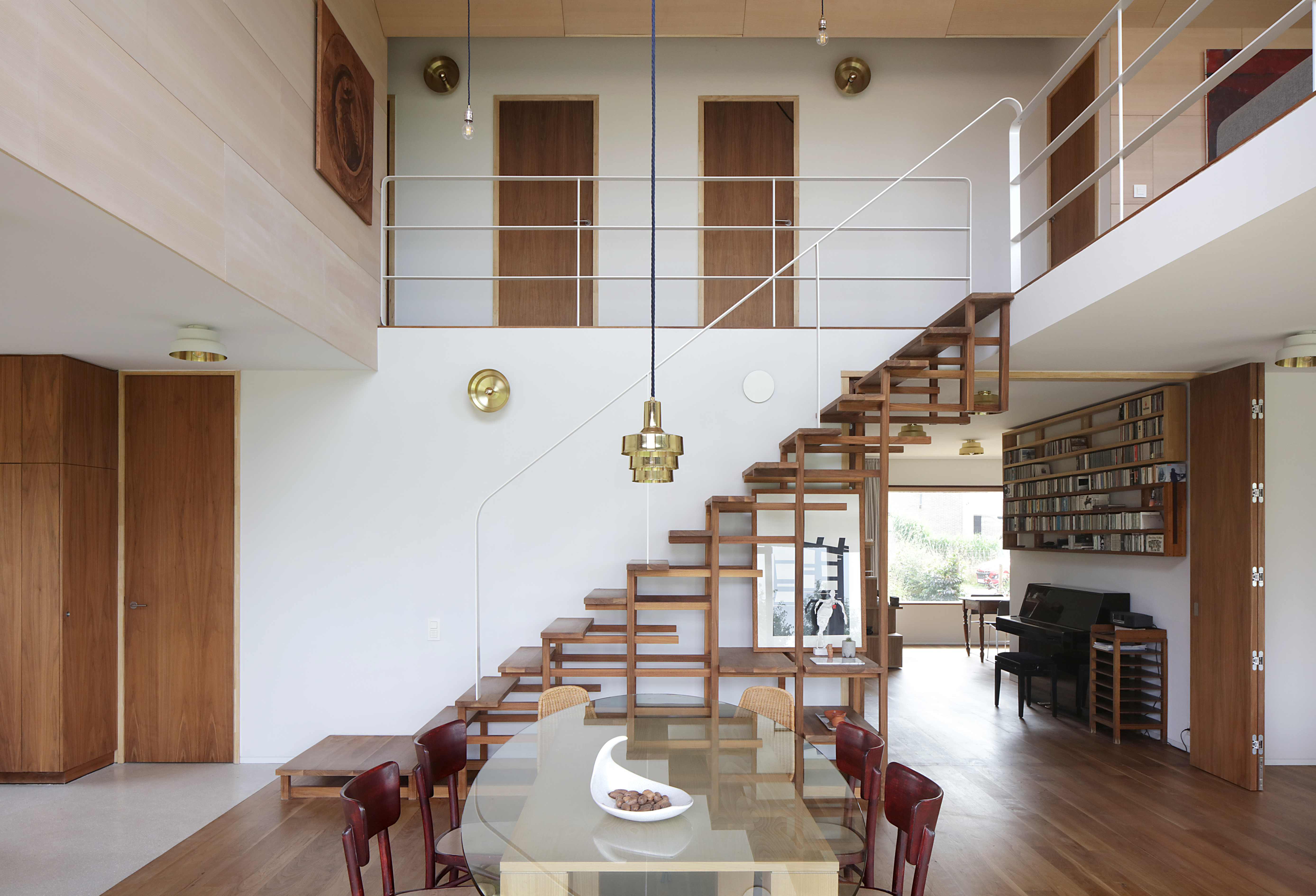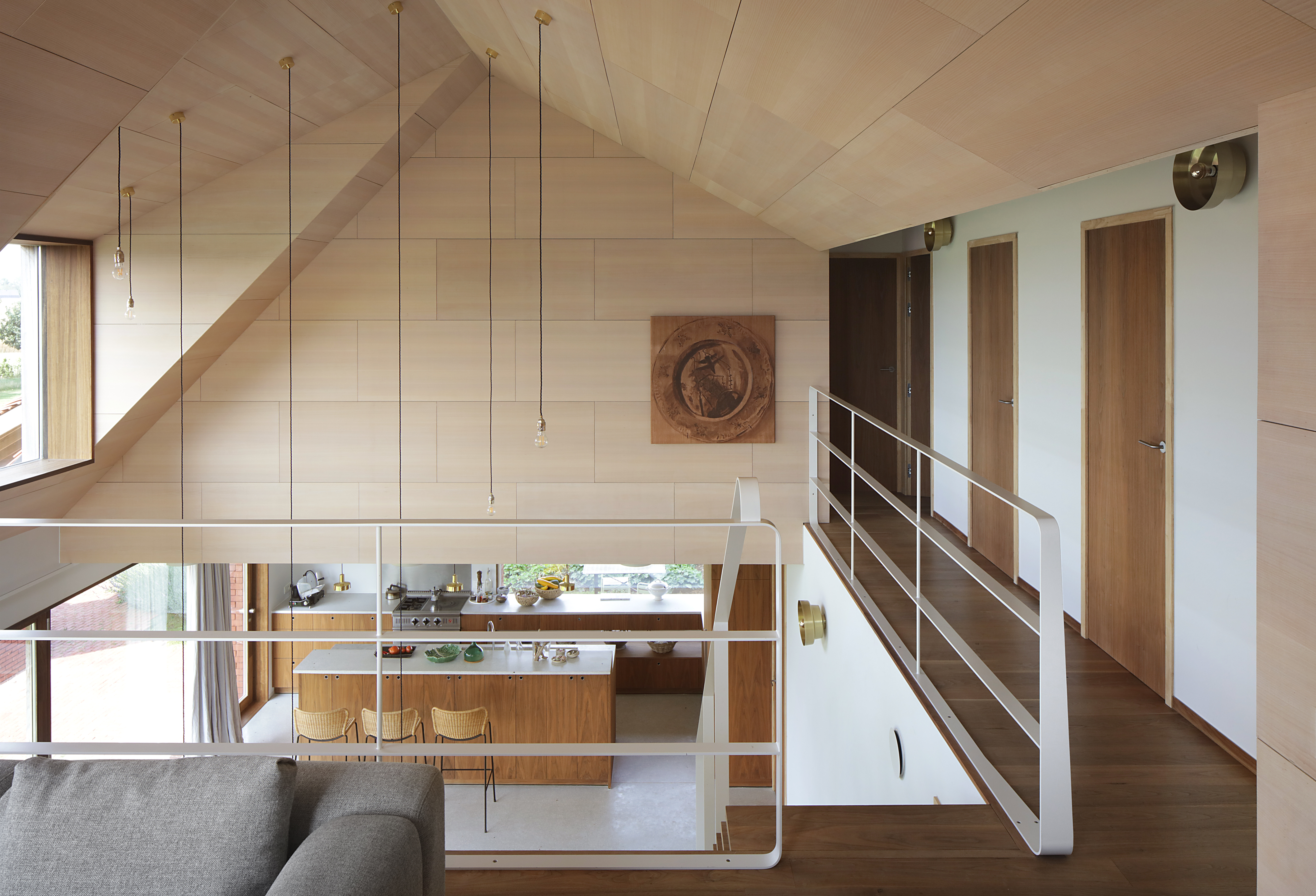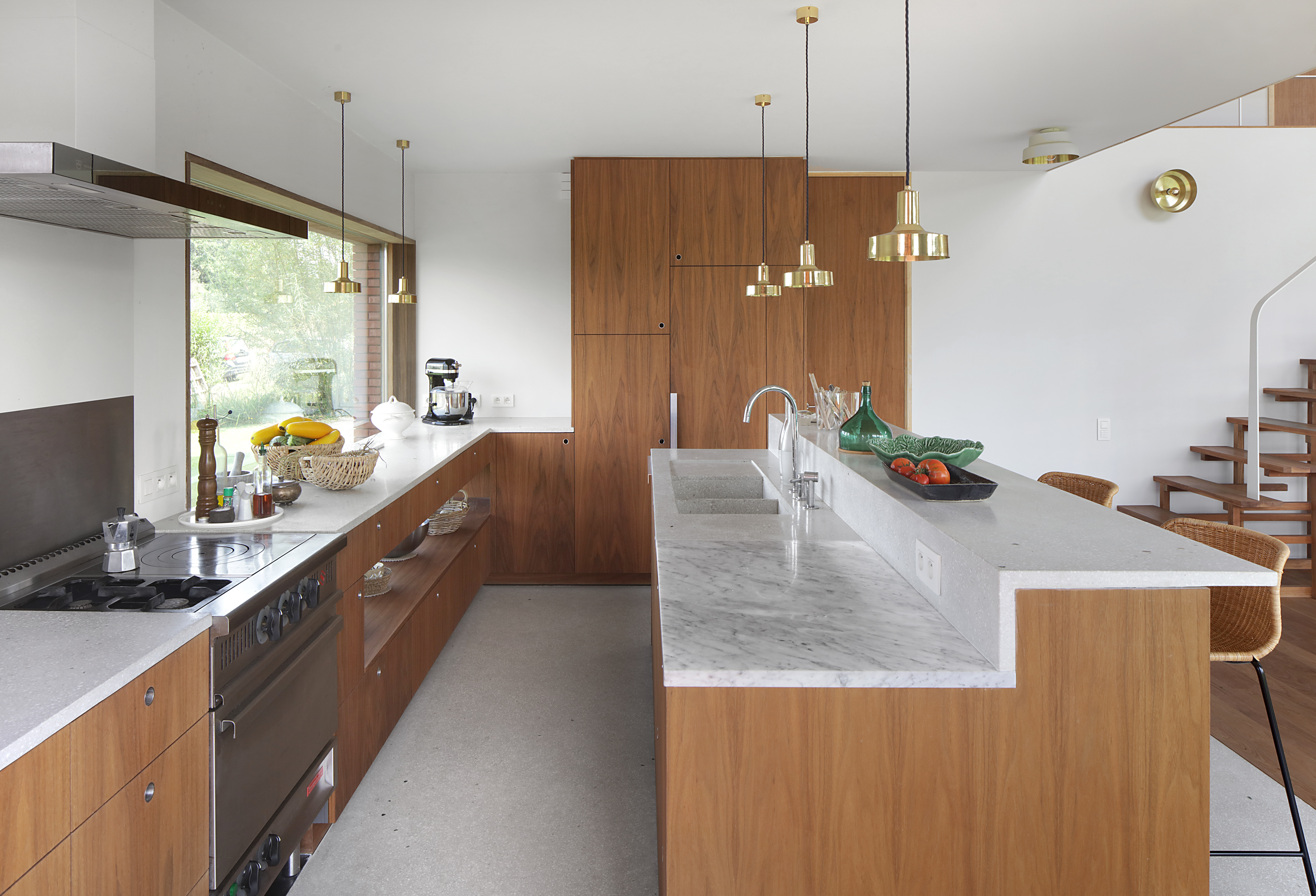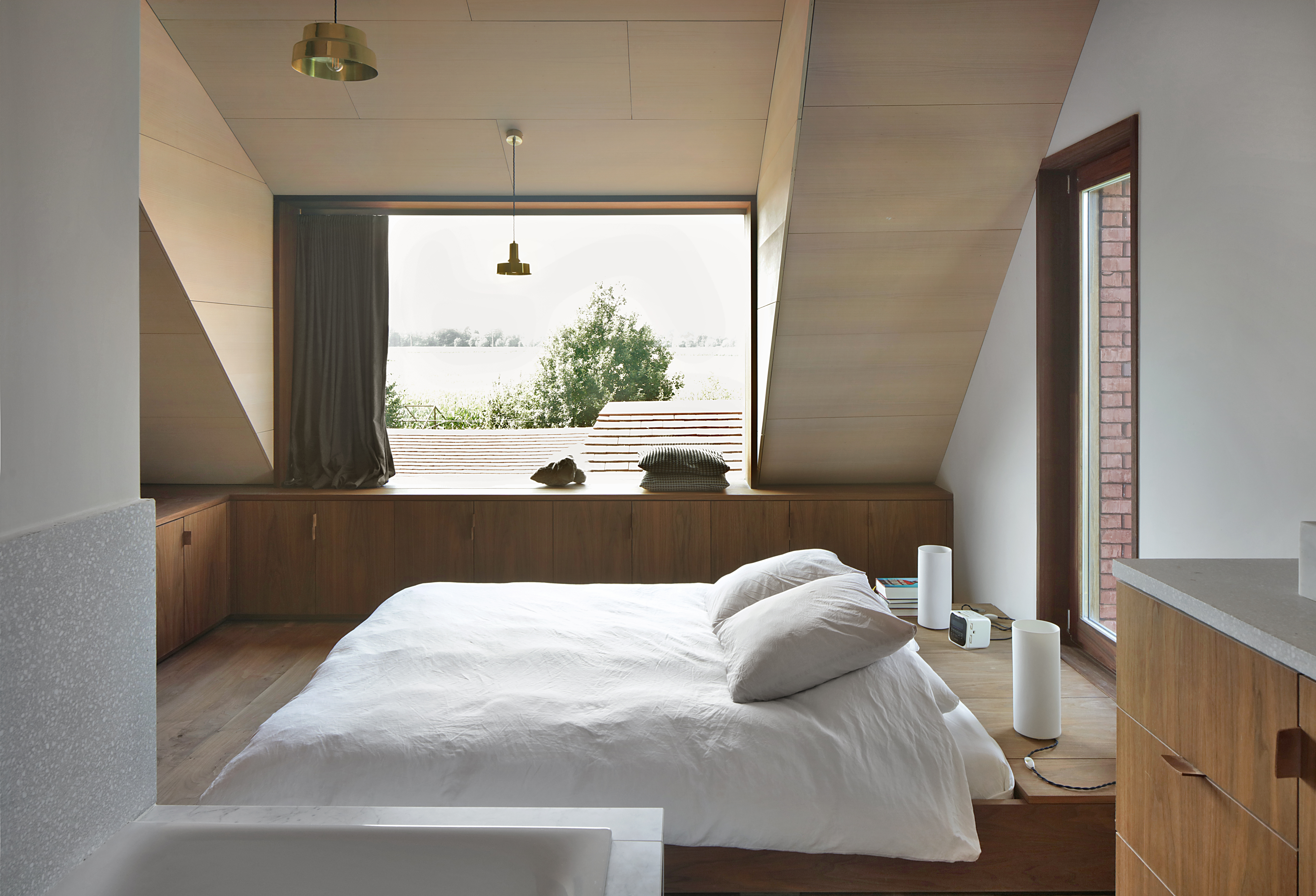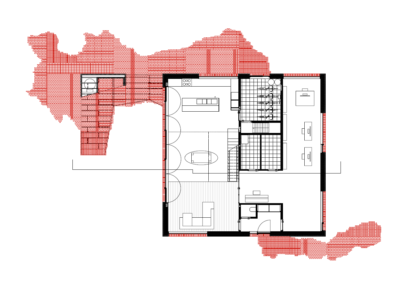 A home for family and architectural practice that connects with a typical Flemish landscape. This is done by playing with roof slopes, materials and views from the house. The roofs dovetail into the landscape and create some strong shapes towards the surroundings. They protect the volume like a shelter. It is a compact volume with a square ground plan rhythmed by a series of windows overlooking different views of the garden and the landscape. The children's rooms are situated under the steep roof slope at the front. Each room has its own gable roof. The roof slopes swing out into the landscape with three openings. The whole creates some strong shapes towards the surroundings. This house breathes ‘soul’ through its natural use of materials. The exterior resembles a tactile volume in baked clay, the interior radiates warmth with a lot of wood and terrazzo.