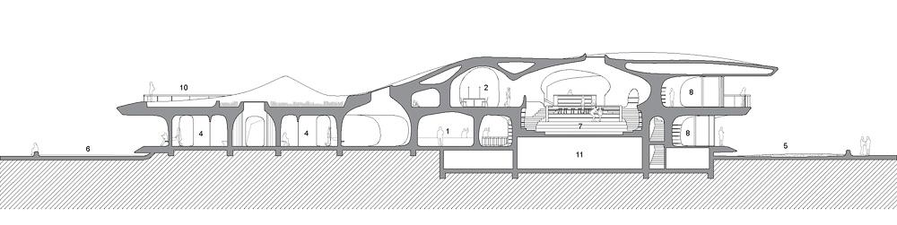 1층과 2층을 연결하는 바다를 향한 계단식 독서공간은 독서의 공간일 뿐만 아니라 문화교류의 장이기도 하다. 구조적 형태는 여러 개의 반 야외 공간과 플랫폼을 생성하며 사람들이 책을 읽거나 바다를 바라볼 수 있는 훌륭한 공간 역할을 한다. 건축가는 재료에 대한 고유한 일상적 인식을 해소하고 공간감 자체가 주제가 되도록 하는 “반물질” 접근 방식을 제안한다. 이곳을 구성하는 콘크리트는 유동적이고 부드럽고 다양한 구조적 형태를 만들어낸 액체이다. 건물의 내부와 외부는 치장 콘크리트로 주조되어 하나의 응집력 있고 흐르는 듯한 형태를 만든다. 지붕과 바닥에는 건물의 규모와 큰 캔틸레버를 지지하는 이중 층 와플 슬래브가 사용되었다. 디자인 개발은 디지털 모델을 사용하여 수행 및 시험을 진행했다. 콘크리트 공동 내에 모든 기계, 전기, 배관 요소를 숨겨 이들의 노출을 최소화하고 시각적 일관성을 만드는 데 성공했다. 도서관의 매끄럽고 유기적인 분위기는 이러한 건축, 구조, 기계 및 전기 설계가 통합되어 완성될 수 있었다.
