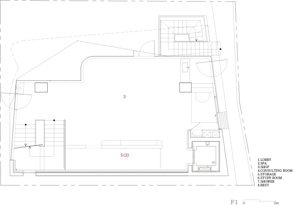 제품의 전시와 피부 상담을 위한 저층 공간에 비하여, 개인적인 스파 케어를 받는 상부층은 좁은 공간 속에 배치가 되었다. 지하층은 충분한 층고로, 다양한 행사와 전시가 가능하며, 카페의 기능과 스파의 기능을 통합하여 디자인된 홀로 채워졌다. 전체적으로 건물은 수직적으로 아래에 공적인 공간부터 올라갈수록 사적인 기능들을 담는 공간으로 배치가 되었다.