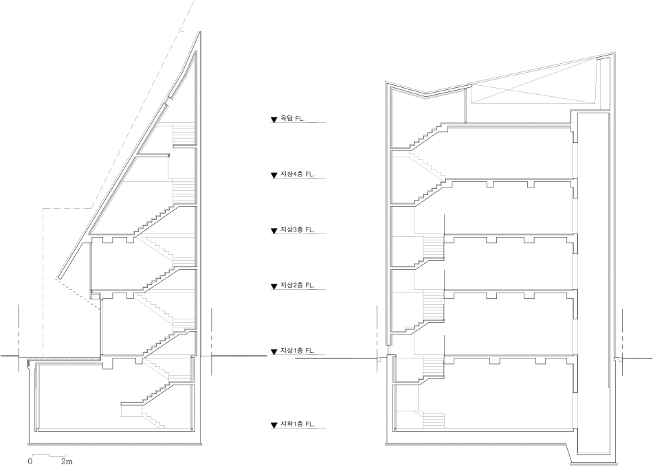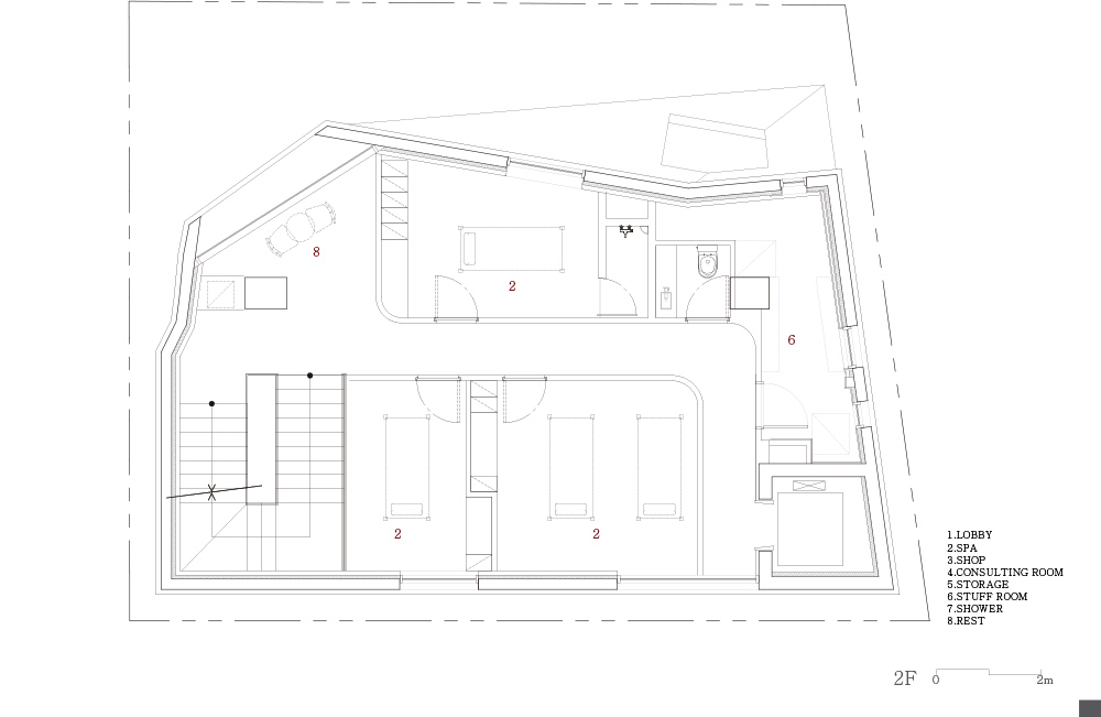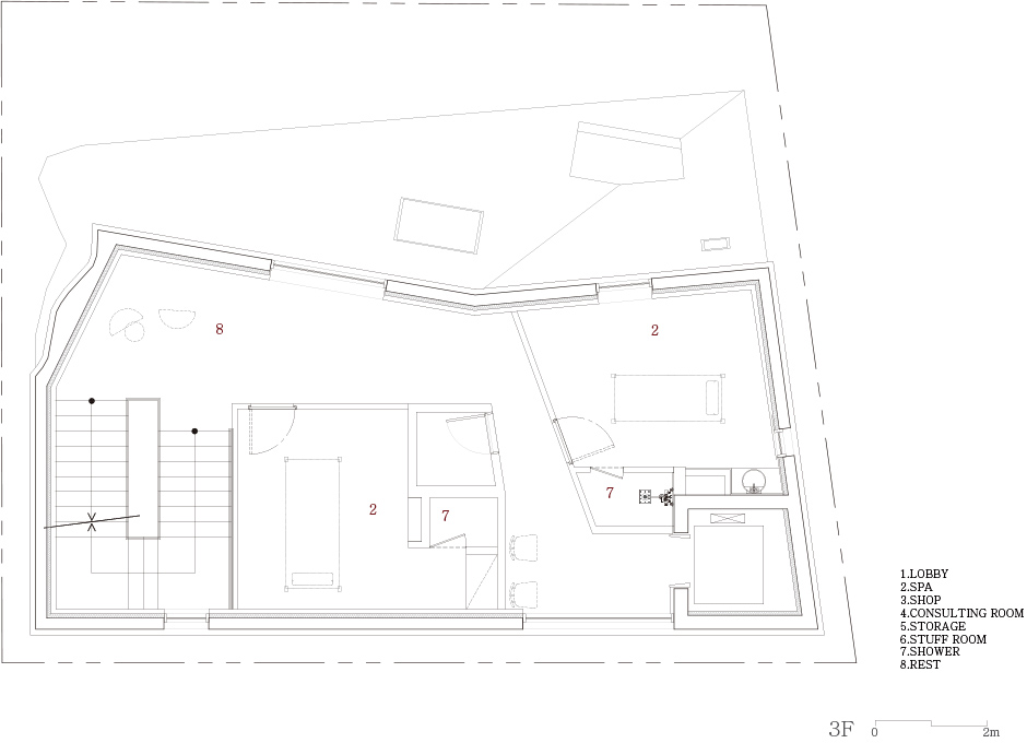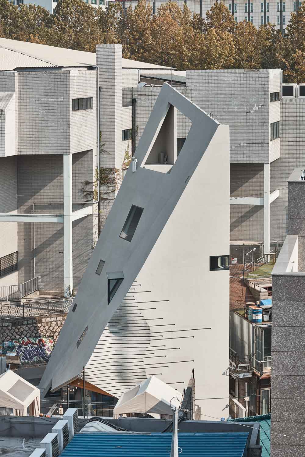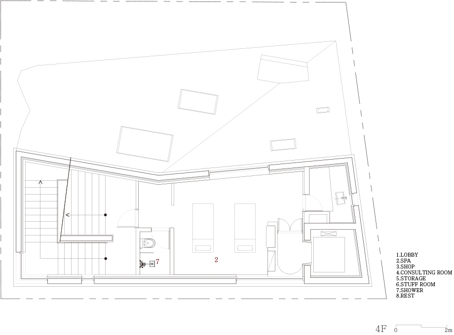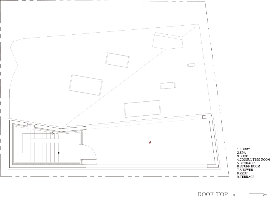 Areuke Spa is located on an alley in an old residential area at the heart of Hongdae. The site neighbours former residences modified into hair salons, restaurants, and cafes. In compliance with strict right-to-light laws resulting from the high density of houses, the building, shaped as a tilted pyramid, takes full advantage of the limited space granted within height restrictions.