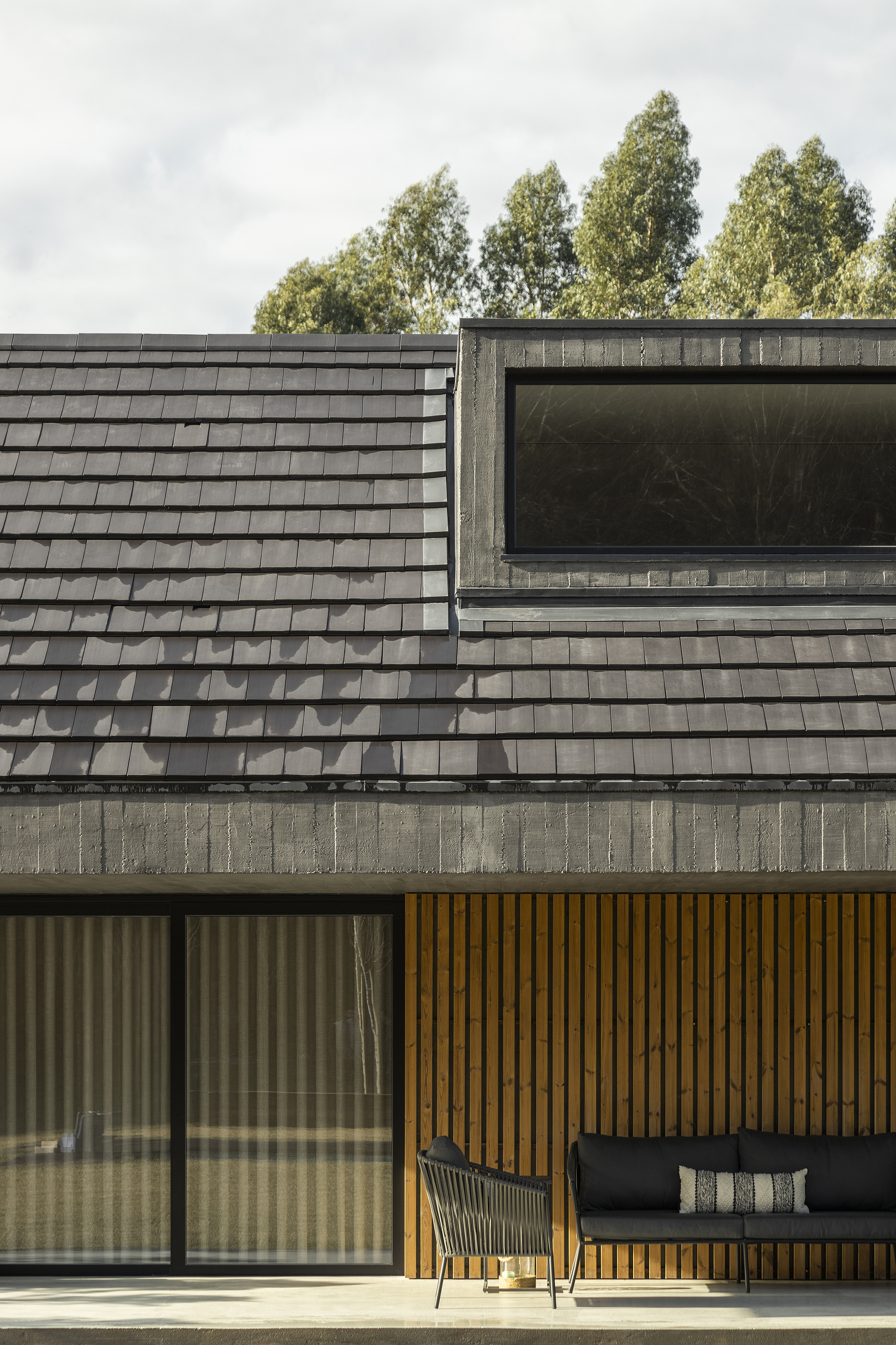 A place, that arises from an elevated plan in relation to the street, and opens itself onto a field, is defined by the large trees that give us visual sensations, experienced as a result of the various colour palettes that each season brings. A set of volumes draw the house that embodies a recognisable archetype and divides the intimate and social area, separating the bedrooms from the kitchen and living rooms. These volumes are organised in different orientations in search of the best relationship between them, and each other with the outside. The contrast between the raw concrete facades and the interior of the house creates an intimate tactile sensation, experienced through the patios, the skylights and the stairs. The social area extends to the outside and to the upper floor, creating a variety of living spaces and proximity to the householders. The intimate area, on the other hand, confines a covered outdoor space providing privacy and allowing, simultaneously, natural light to flood the interior. In order to intensify the relationship with nature, the house evokes the simplicity and sobriety that characterises the surroundings.