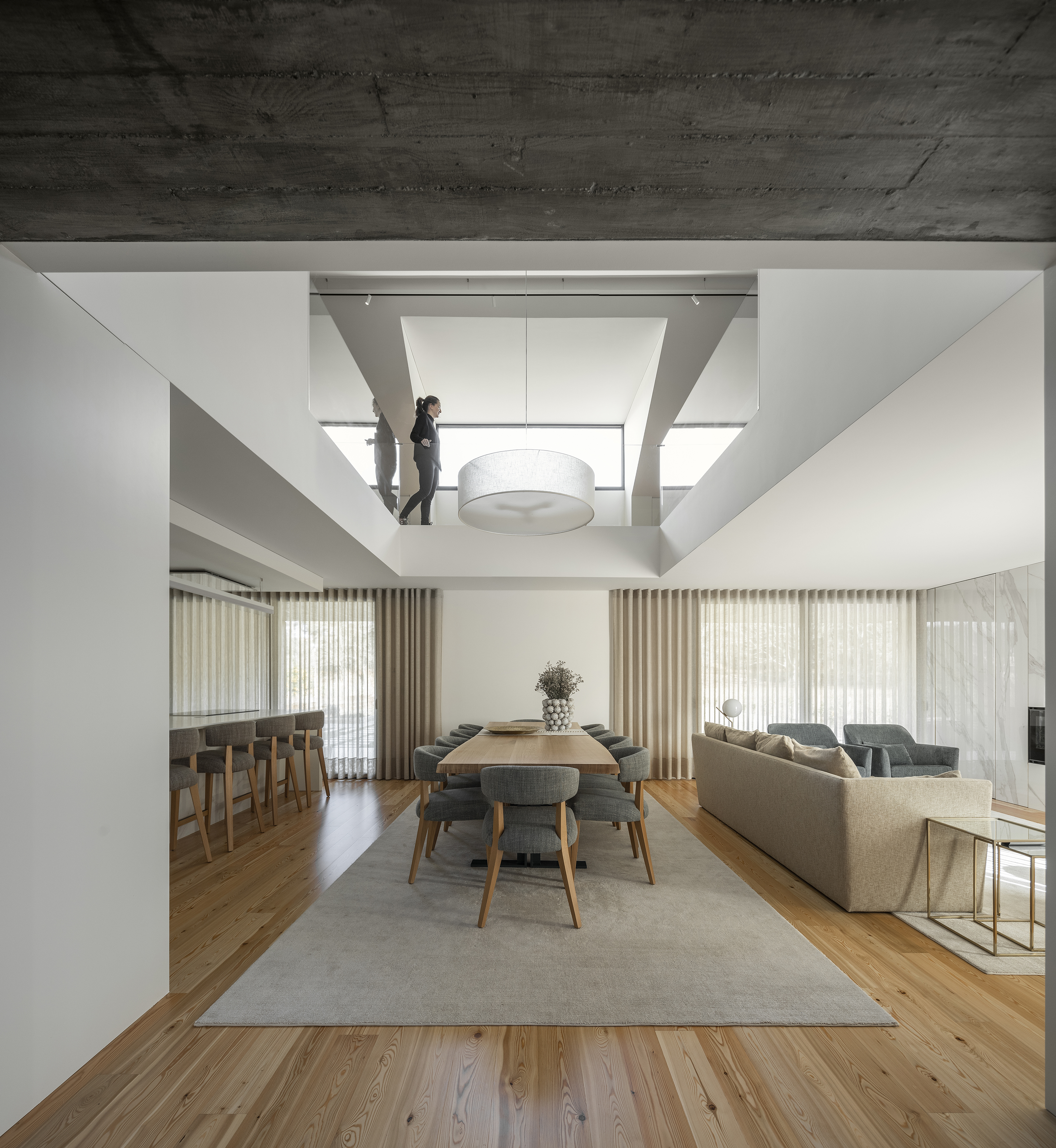 A place, that arises from an elevated plan in relation to the street, and opens itself onto a field, is defined by the large trees that give us visual sensations, experienced as a result of the various colour palettes that each season brings. A set of volumes draw the house that embodies a recognisable archetype and divides the intimate and social area, separating the bedrooms from the kitchen and living rooms. These volumes are organised in different orientations in search of the best relationship between them, and each other with the outside. The contrast between the raw concrete facades and the interior of the house creates an intimate tactile sensation, experienced through the patios, the skylights and the stairs. The social area extends to the outside and to the upper floor, creating a variety of living spaces and proximity to the householders. The intimate area, on the other hand, confines a covered outdoor space providing privacy and allowing, simultaneously, natural light to flood the interior. In order to intensify the relationship with nature, the house evokes the simplicity and sobriety that characterises the surroundings.