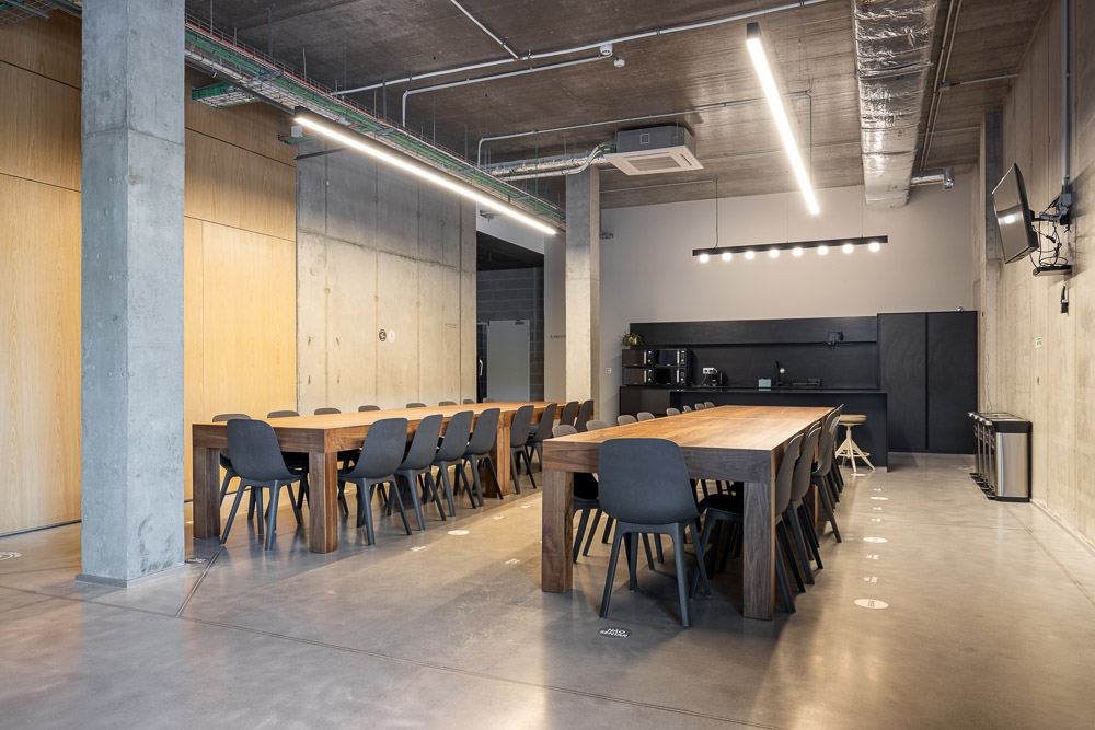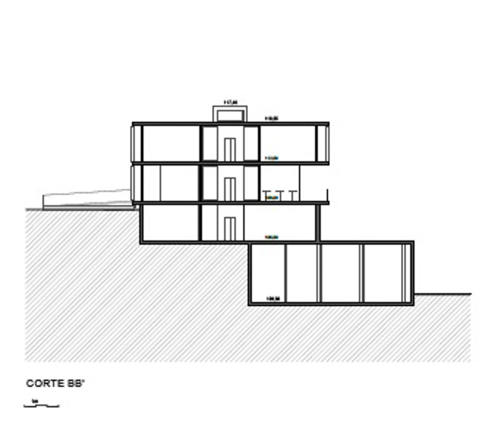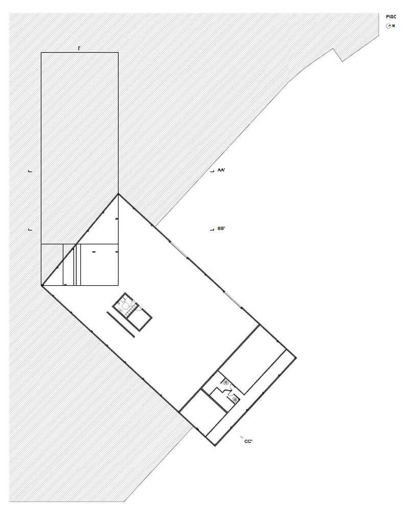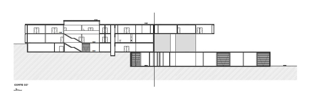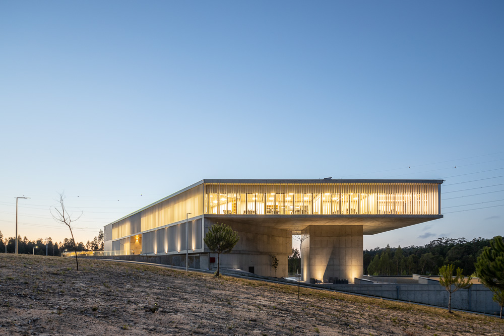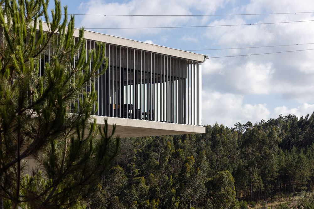 The New Headquarters and Warehouse of the company Aníbal Cristina is located in Pousos, Leiria, near the access to the A1 highway. The site has tree cover consisting of woodland, mainly pine trees and eucalyptus, which is part of Rede Natura. The architectural proposal results from both the programmatic premises and the plastic possibilities of concrete, as a material substance, and the know-how of AOC, in its activity, projection and stability. The program consists of offices, warehouses and garages, as well as an outdoor park including a tennis court, a lake and a cycle and pedestrian maintenance circuit. The project envisages a building subdivided into two distinct program: two floors of offices with entrance to the south and one floor of garage/archives (which also houses a 100 m2 training room in amphitheater) opening to the west. To this construction is attached a warehouse that is recessed into the land at a lower level, also opening to the west. Thus, we have two floors above the ground level of the building and two floors below, the latter being set in a drawer so as to have direct access to the exterior, namely 1st floor and 2nd floor. The exterior space incorporates an access road to the building and parking and manoeuvring areas dedicated to each functional component.