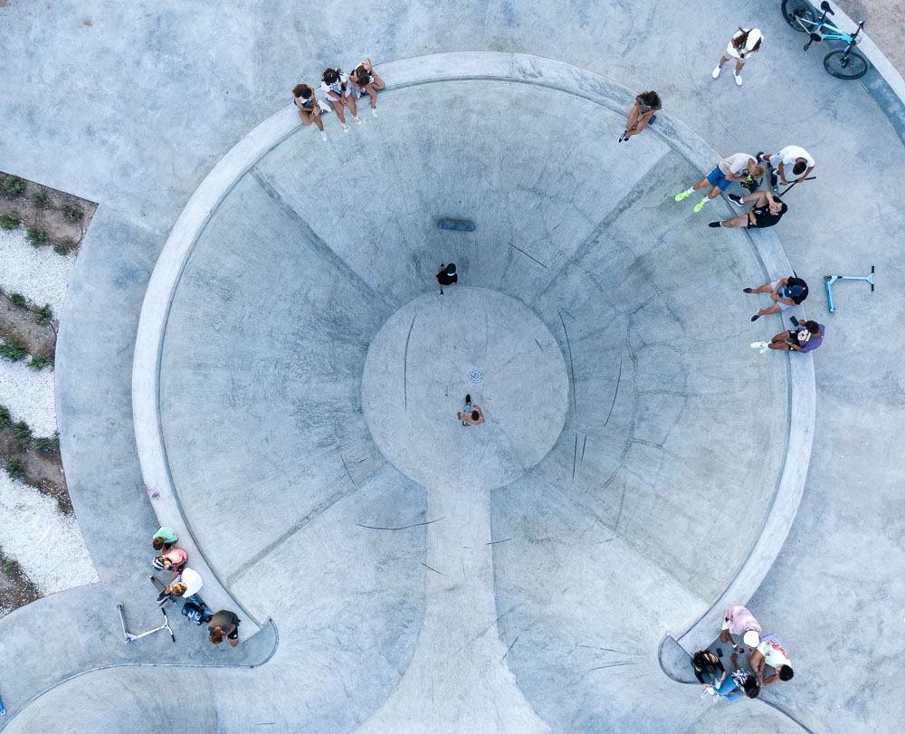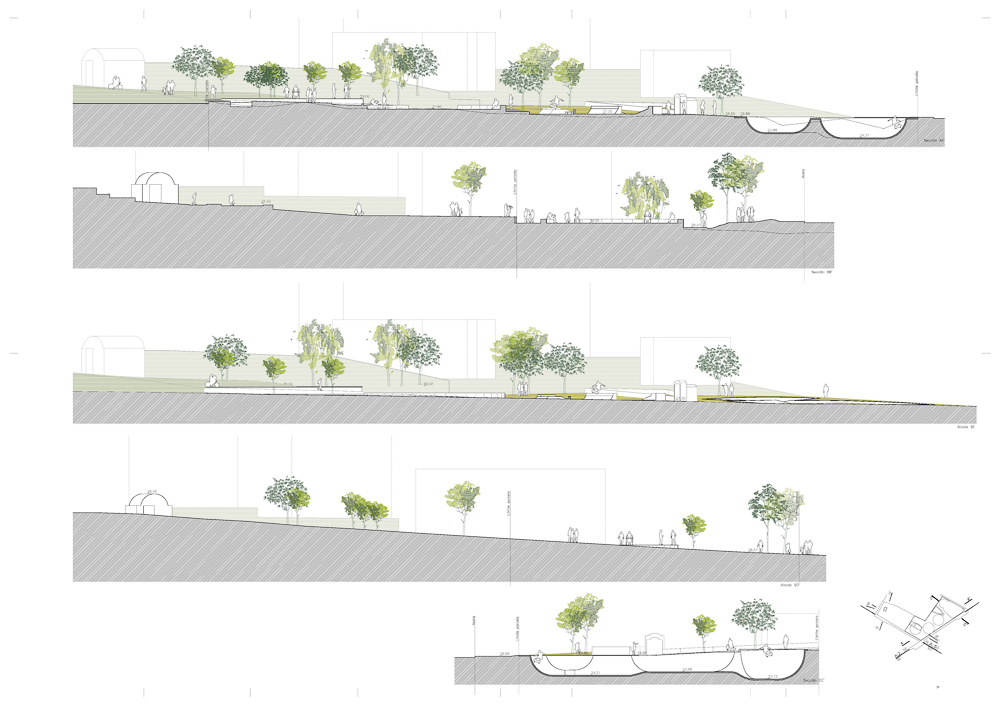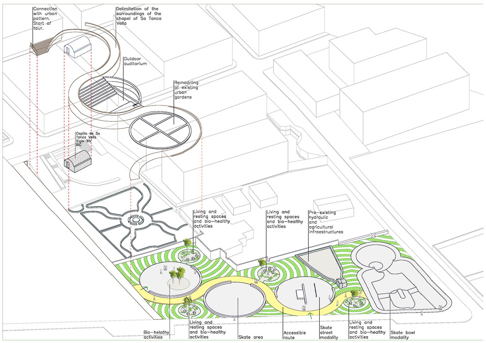 The fundamental objective of this first part of the intervention is to promote interaction between different age groups by introducing multiple sports modalities adapted to each of them. Thus, the functional program includes spaces for learning skating for younger users, skate areas in street and bowl modalities for users belonging to intermediate age groups and bio-healthy activity areas for older age groups. The ordering of these uses in such a way as to promote contact between the different users without producing negative interferences between them constitutes the main thread of the intervention.