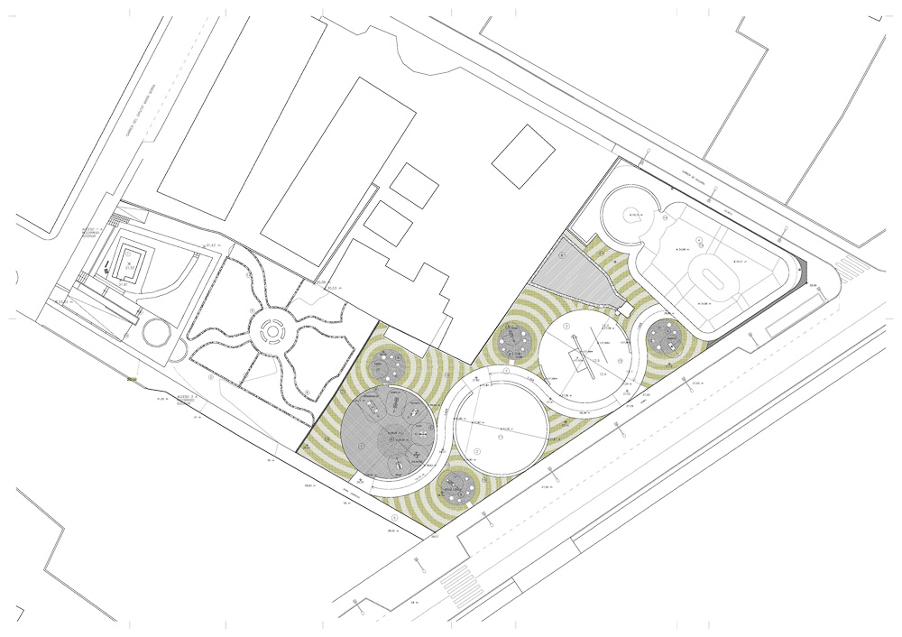 Starting from the concept of an arrangement of small paved surfaces in which the natural character of the intervention should be predominant, we proceeded to design a set of small circular spaces, independent and each one oriented to a specific age group, putting in relation to all of them through a common and winding route that encourages contact between the different users. As a complement, small living and resting spaces with trees are introduced for the production of shadows.
