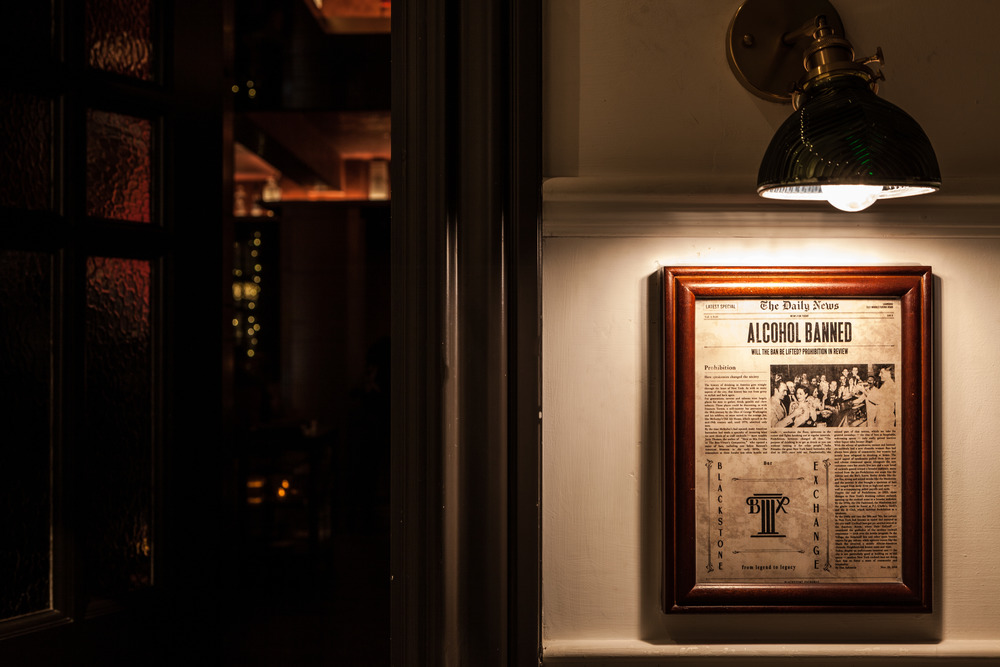 긴 산책로를 통해 바에 들어서면 드넓게 펼쳐진 대칭적인 공간이 열린다. 상단의 호 모양은 블랙스톤 아파트 정면의 상징적인 곡선형 발코니와 일치한다. 나무 막대 뒤의 벽은 다양한 바로크 양식으로 장식되어 있다. 얼룩덜룩한 붉은 벽돌을 배경으로 시공간의 혼돈을 연출하여 마치 이탈리안 패밀리 선술집에 온 듯한 착각을 불러일으키며, 신비롭고 역사적인 분위기를 자아낸다.