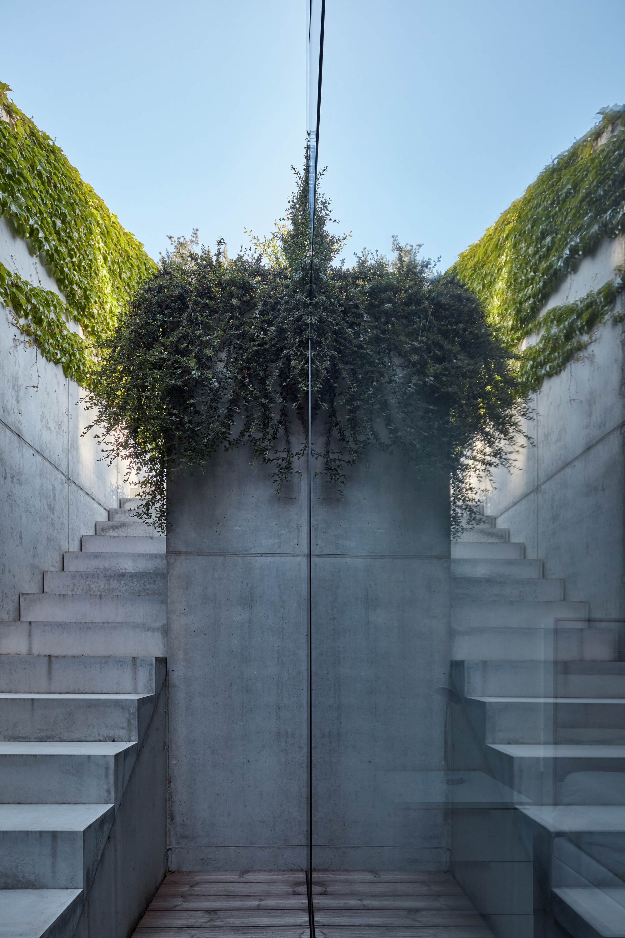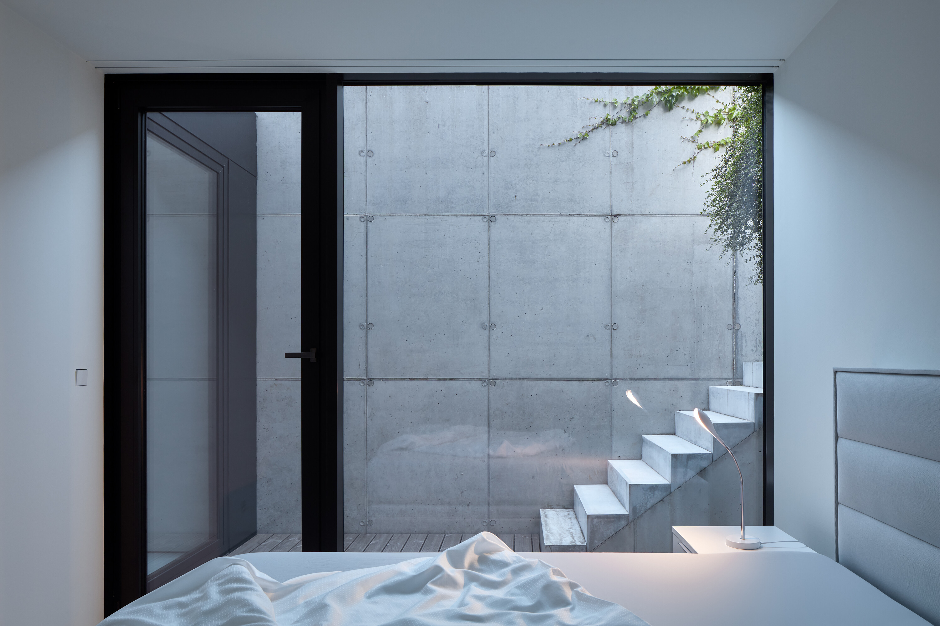 집의 동쪽 벽은 확장되고 움푹 들어가는데, 2층의 침실과 복도로 쓰인다. 집에 중심인 거실은 최상층(3층)에 위치하며, 남쪽의 야외 테라스와 정원과 연결된다. 주거공간 안에는 벽으로 구분되어 있지 않는데, 이는 남쪽 정원에서부터 햇빛이 식당 안의 유리벽을 통해 깊게 스며서 방을 비출 수 있도록 만들며, 북쪽으로 보이는 협곡의 사이의 인상적인 풍경을 집 내부에서 바라볼 수 있도록 만든다.