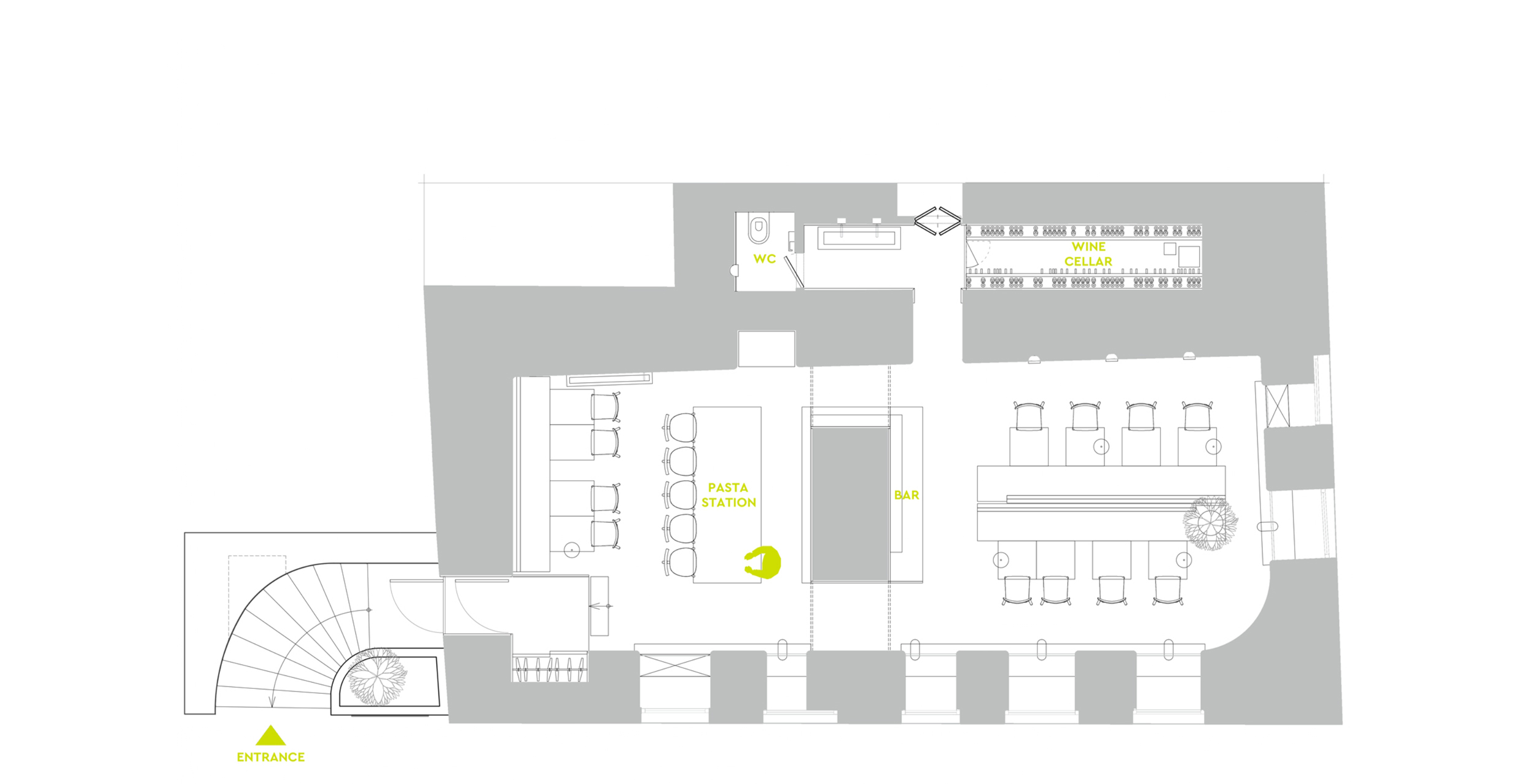 가톨릭 미학 참고한 요소들을 곳곳에 배치했다. 첫 번째 홀의 중심은 은유적인 제단으로 요리사가 일하는 큰 테이블이다. 모든 테이블이 요리사를 향해있어 손님들이 파스타를 만드는 과정을 볼 수 있다. 두 번째 홀의 묘미는 가운데에 있는 교회 객석과 올리브 나무, 세 개의 kiot(수호 성인의 상징이 있는 아이콘 케이스)다. 이탈리아 요리의 대표적인 세 가지 요소인 와인, 올리브 오일, 백리향을 아이콘 케이스에 두었다. 이탈리아는 와인으로 유명하기 때문에 지하 계단 아래 공간에 와인 저장고를 배치했다. 밝은 색상과 벽의 거울 덕분에 지하실을 시각적으로 평평하게 만들 수 있었다.