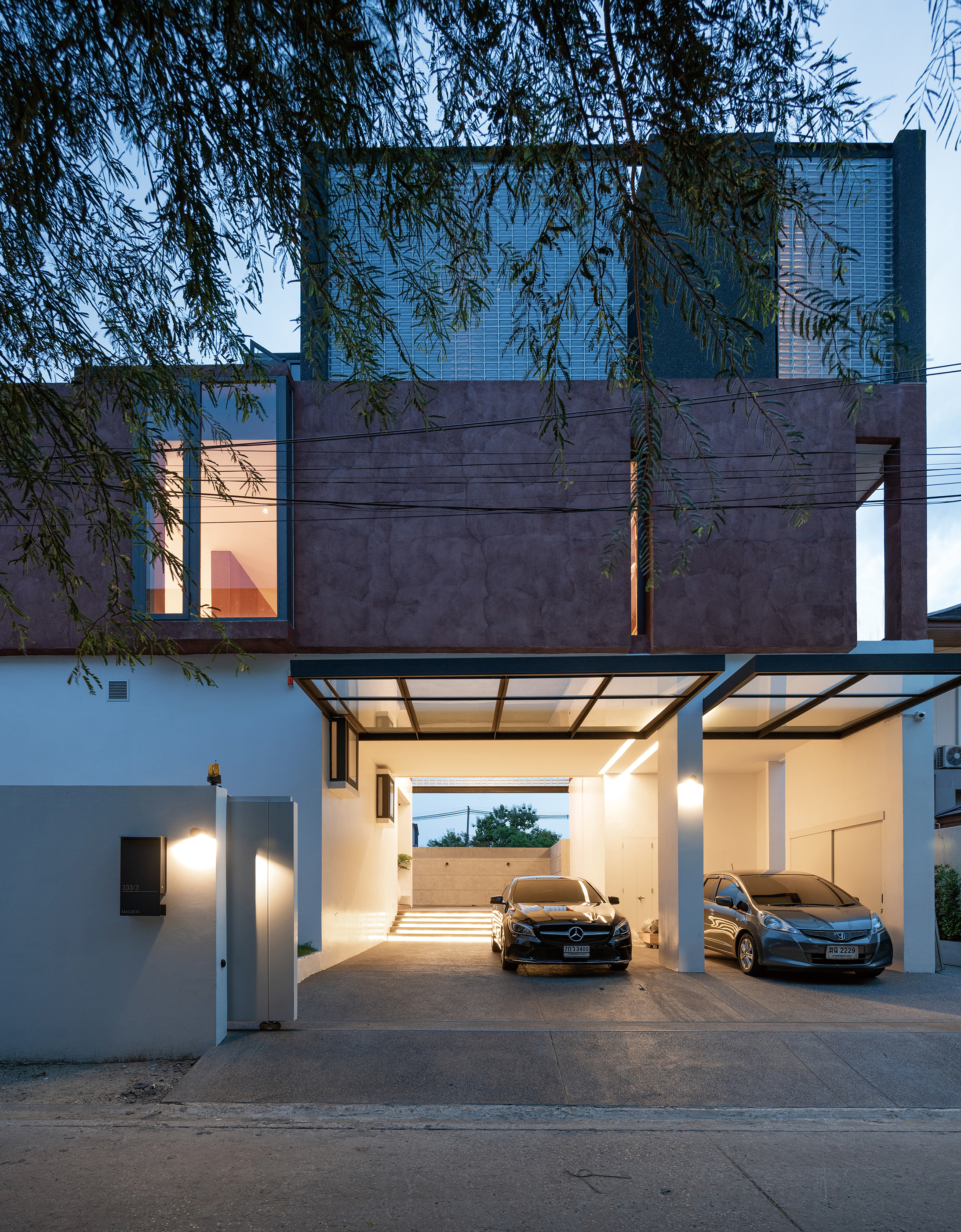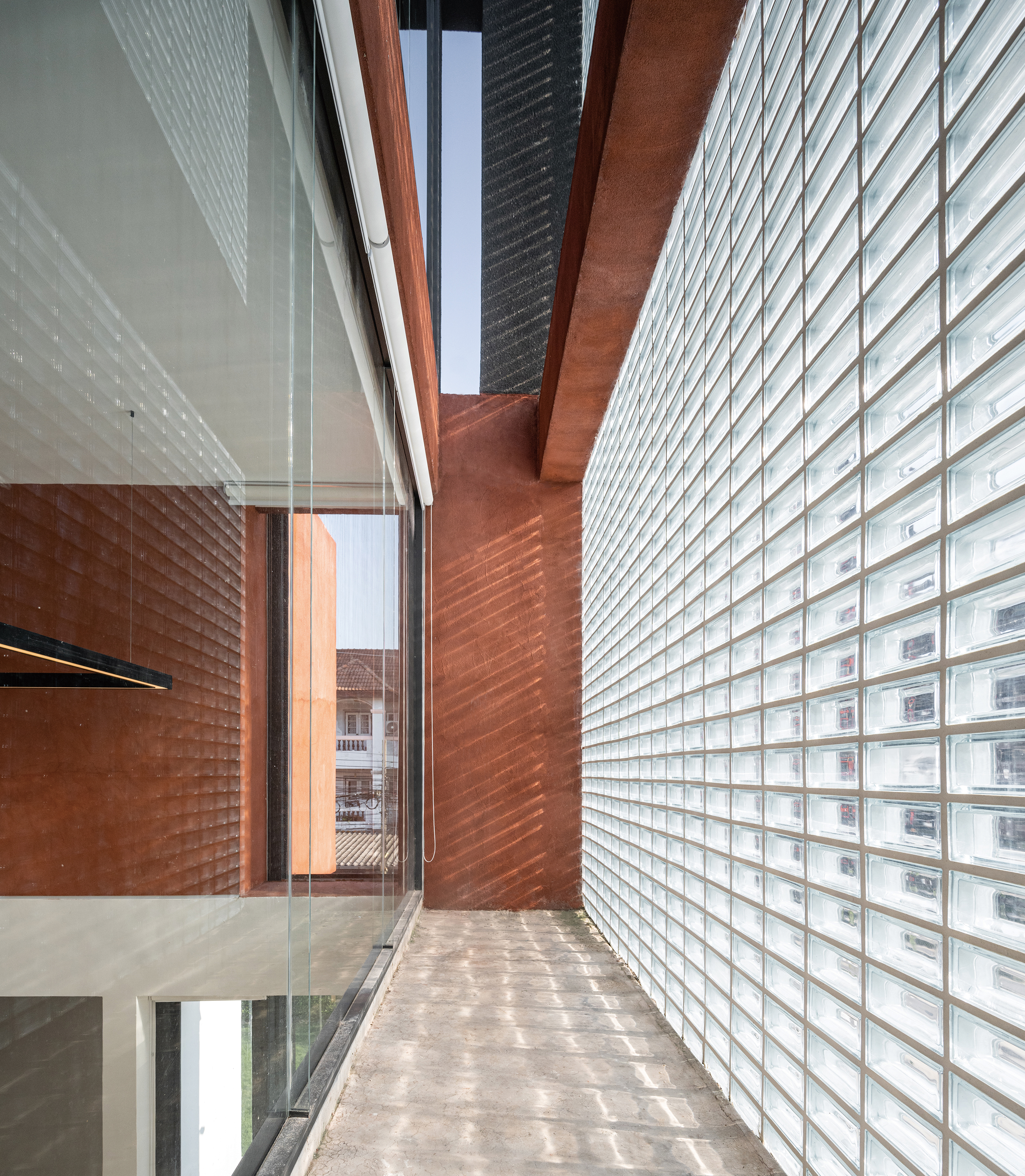 Sena House is located in the rectangular site which is squeezed between two narrow roads. A physical components surrounding the plot are crowded buildings. As a three-story house, The 1st floor consists of a room all of which are embraced by an L-shape staircase rising up to the 2nd floor. A certain angle of this set of stairs provides an open view and an extra wide space to extend a journey, allowing the users to spend time to perceive the spacious atmosphere that covers two floors, spread over to other areas that they are about to arrive. The 2nd floor, taken from the stairs at this area, the glass block wall projects natural light from outside, different shades of light according to each period of day, creating the glimmering, coloring atmosphere and stories for the interior. Through this glass block wall, this element functions as a glass curtain. The 3rd floor is used for the three bedrooms. The walls facing outside of each bedroom are filtered with two-layer walls, that is, a glass block wall that continues from the 2nd floor as an outer layer and a mirror wall that enhances the feeling of privacy as well as smoothing light from outside as an inner layer: a conversation to negotiate with the sun. The three layers of the building surface are laid out differently, even it may seem unnecessary, but, in this context, it is absolutely necessary. The top layer is covered by fine black stone flakes and orange-brown clay that are smoothly blended in, gently handled, and woven together with the long strip clerestories that scatter throughout the large glass block wall. This, apart from functioning as an actual wall, is like a screen projecting life from outside to inside and from inside to outside, putting things together into one story, in the same context, a living together of different concepts.