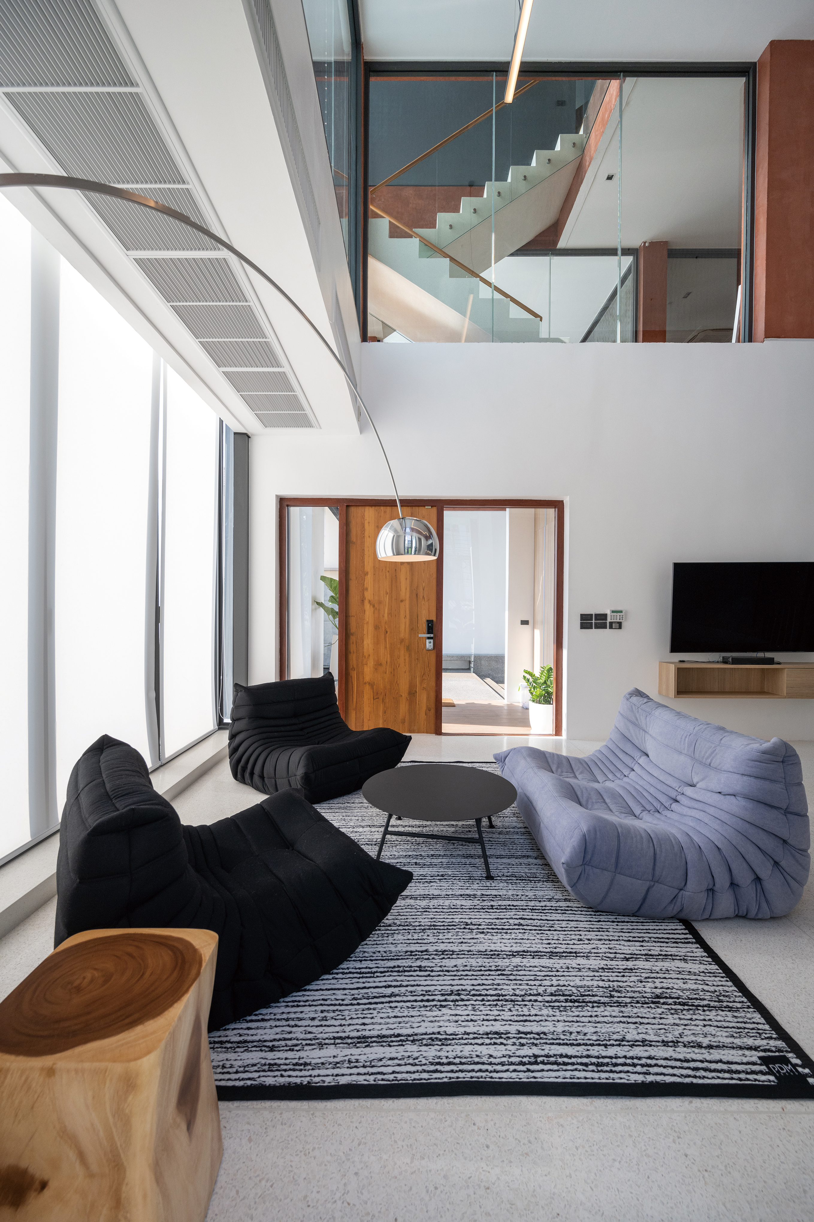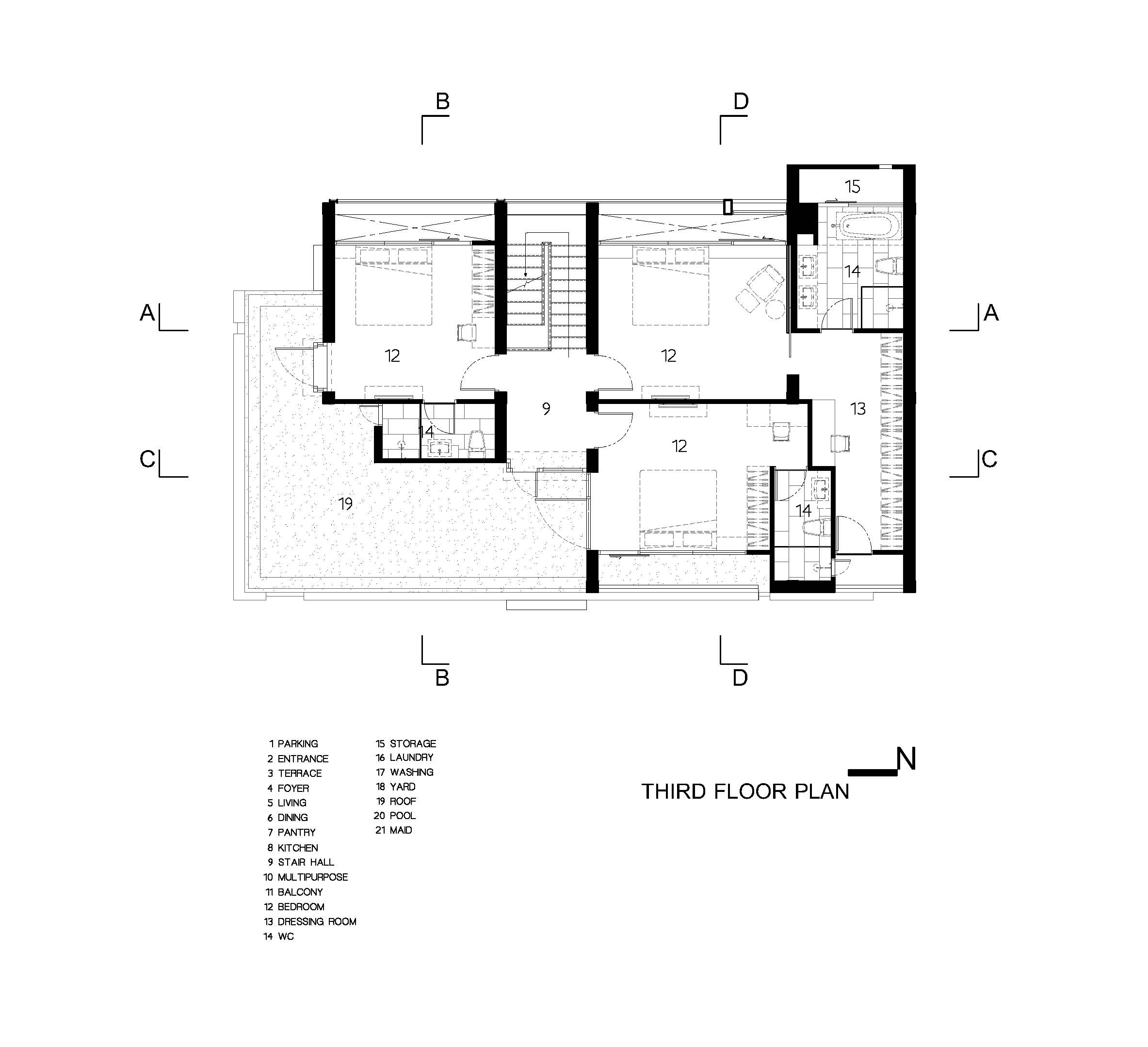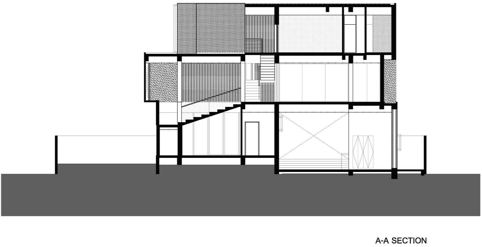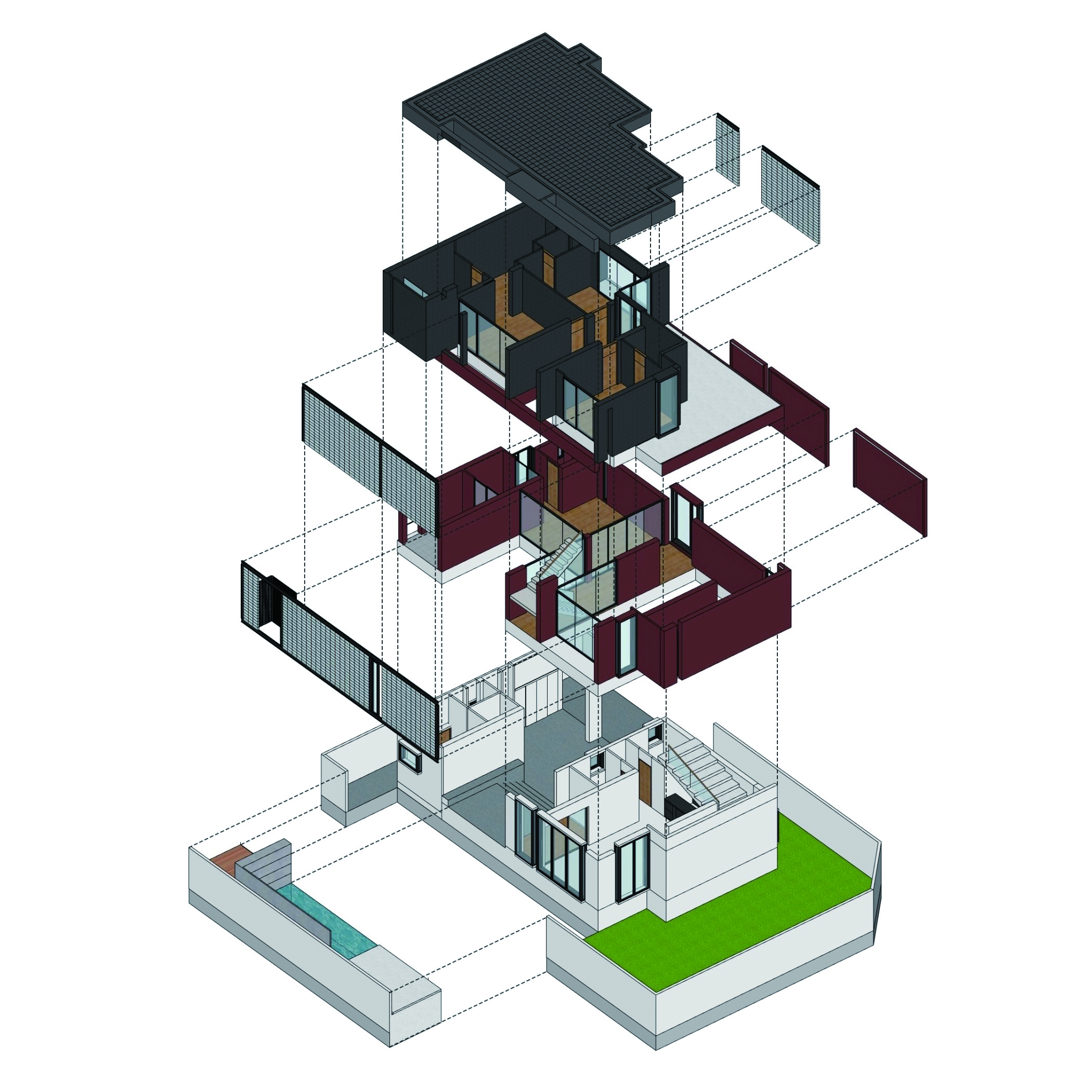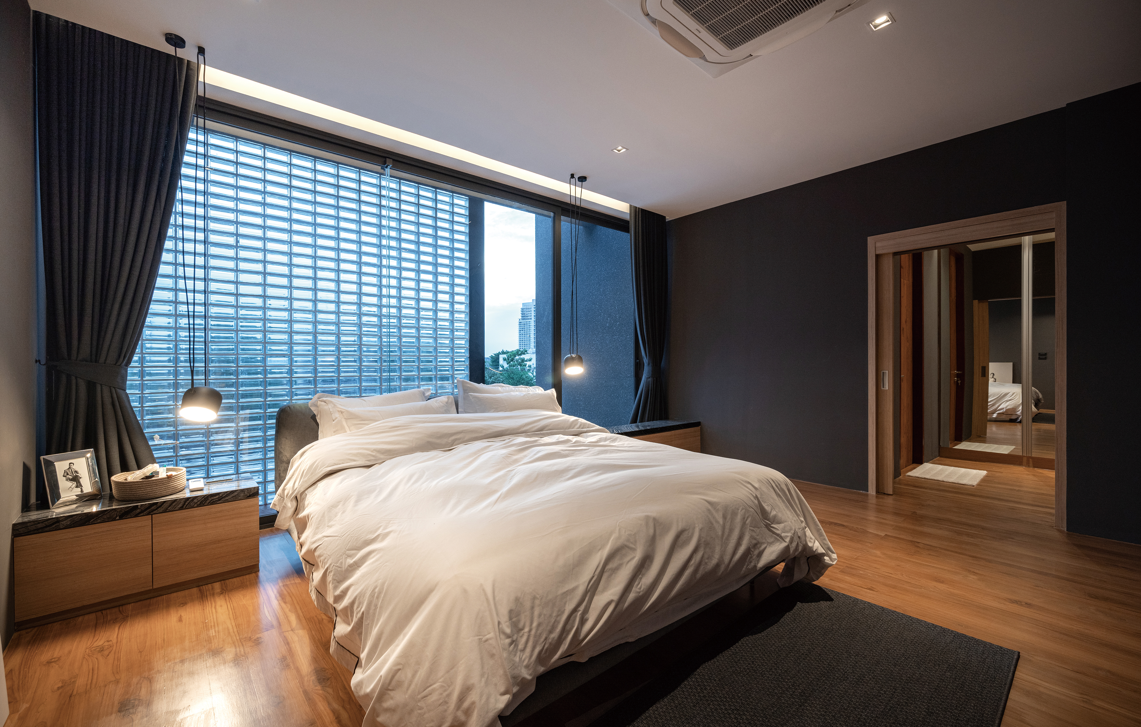 Sena House is located in the rectangular site which is squeezed between two narrow roads. A physical components surrounding the plot are crowded buildings. As a three-story house, The 1st floor consists of a room all of which are embraced by an L-shape staircase rising up to the 2nd floor. A certain angle of this set of stairs provides an open view and an extra wide space to extend a journey, allowing the users to spend time to perceive the spacious atmosphere that covers two floors, spread over to other areas that they are about to arrive. The 2nd floor, taken from the stairs at this area, the glass block wall projects natural light from outside, different shades of light according to each period of day, creating the glimmering, coloring atmosphere and stories for the interior. Through this glass block wall, this element functions as a glass curtain. The 3rd floor is used for the three bedrooms. The walls facing outside of each bedroom are filtered with two-layer walls, that is, a glass block wall that continues from the 2nd floor as an outer layer and a mirror wall that enhances the feeling of privacy as well as smoothing light from outside as an inner layer: a conversation to negotiate with the sun. The three layers of the building surface are laid out differently, even it may seem unnecessary, but, in this context, it is absolutely necessary. The top layer is covered by fine black stone flakes and orange-brown clay that are smoothly blended in, gently handled, and woven together with the long strip clerestories that scatter throughout the large glass block wall. This, apart from functioning as an actual wall, is like a screen projecting life from outside to inside and from inside to outside, putting things together into one story, in the same context, a living together of different concepts.